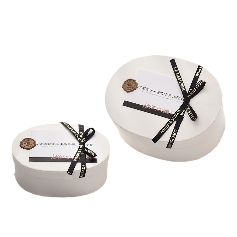 Specifications and models: Off-white gift box + black gold ribbon + seal sticker + random greeting card; large oval size 29*24*11.5cm