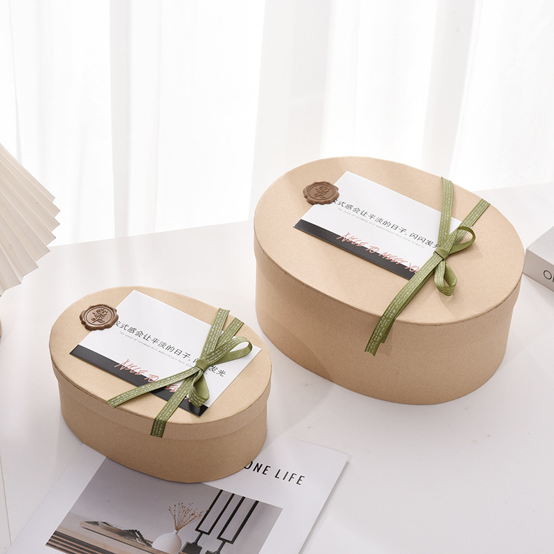 Specifications and models: Kraft paper gift box + black gold ribbon + seal sticker + greeting card random; oval medium size 24*19*10cm