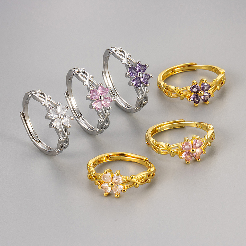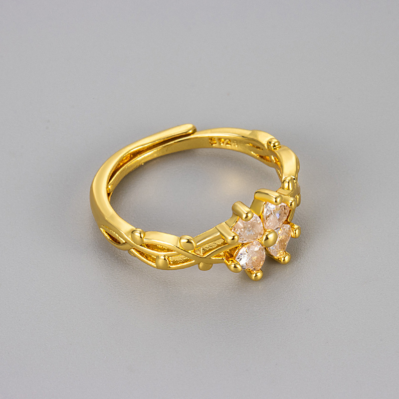 European and American Retro Micro-inlaid Zircon Four-leaf Clover Ring Women's Fashionable Personalized Vine Wrap Adjustable Flower Finger Ring