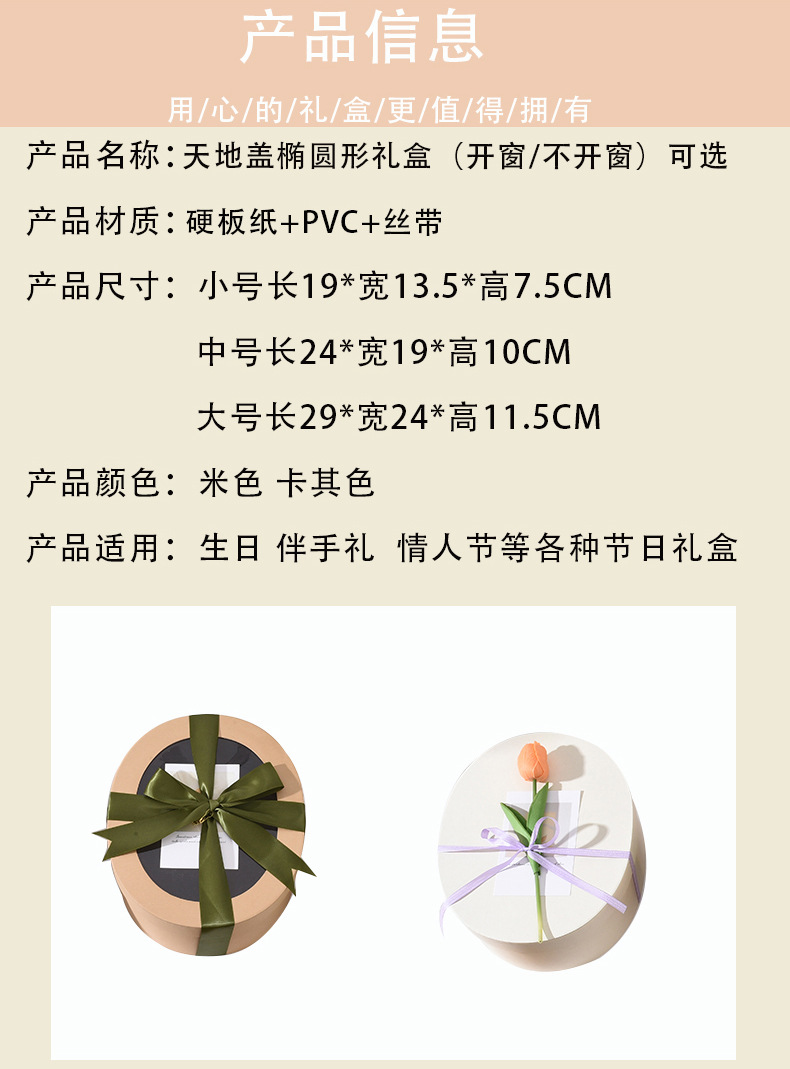 Specifications and models: Off-white gift box + green english ribbon + seal sticker + random greeting card; oval medium size 24*19*10cm