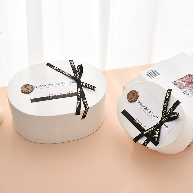 Specifications and models: Off-white gift box + black gold ribbon + seal sticker + random greeting card; large oval size 29*24*11.5cm