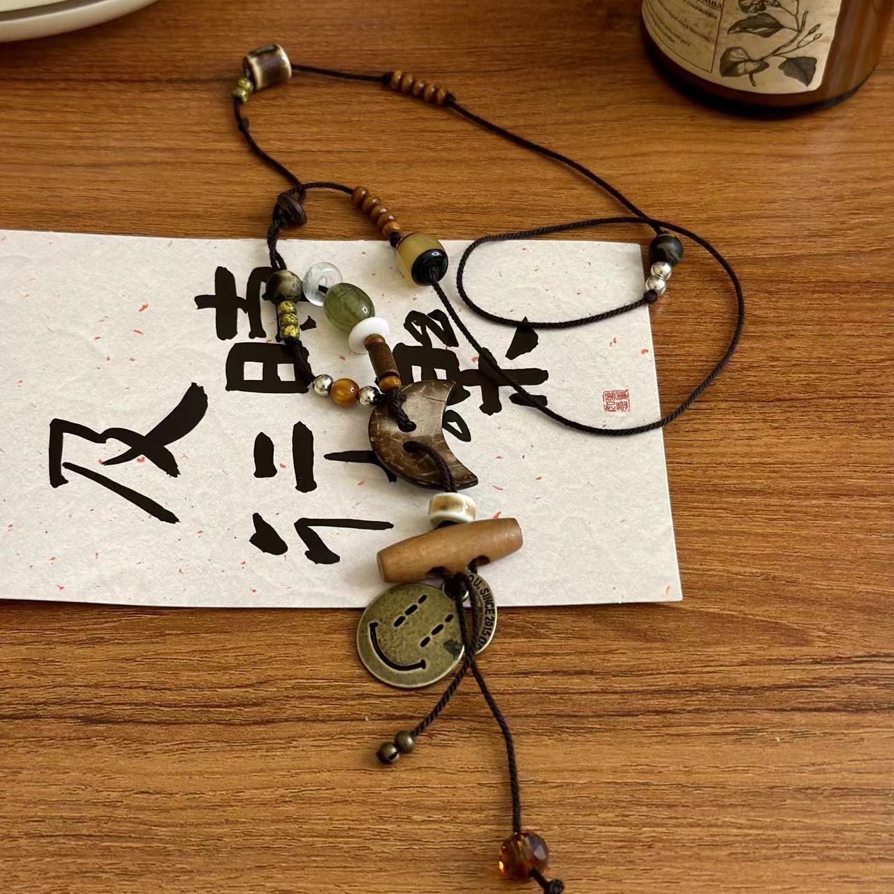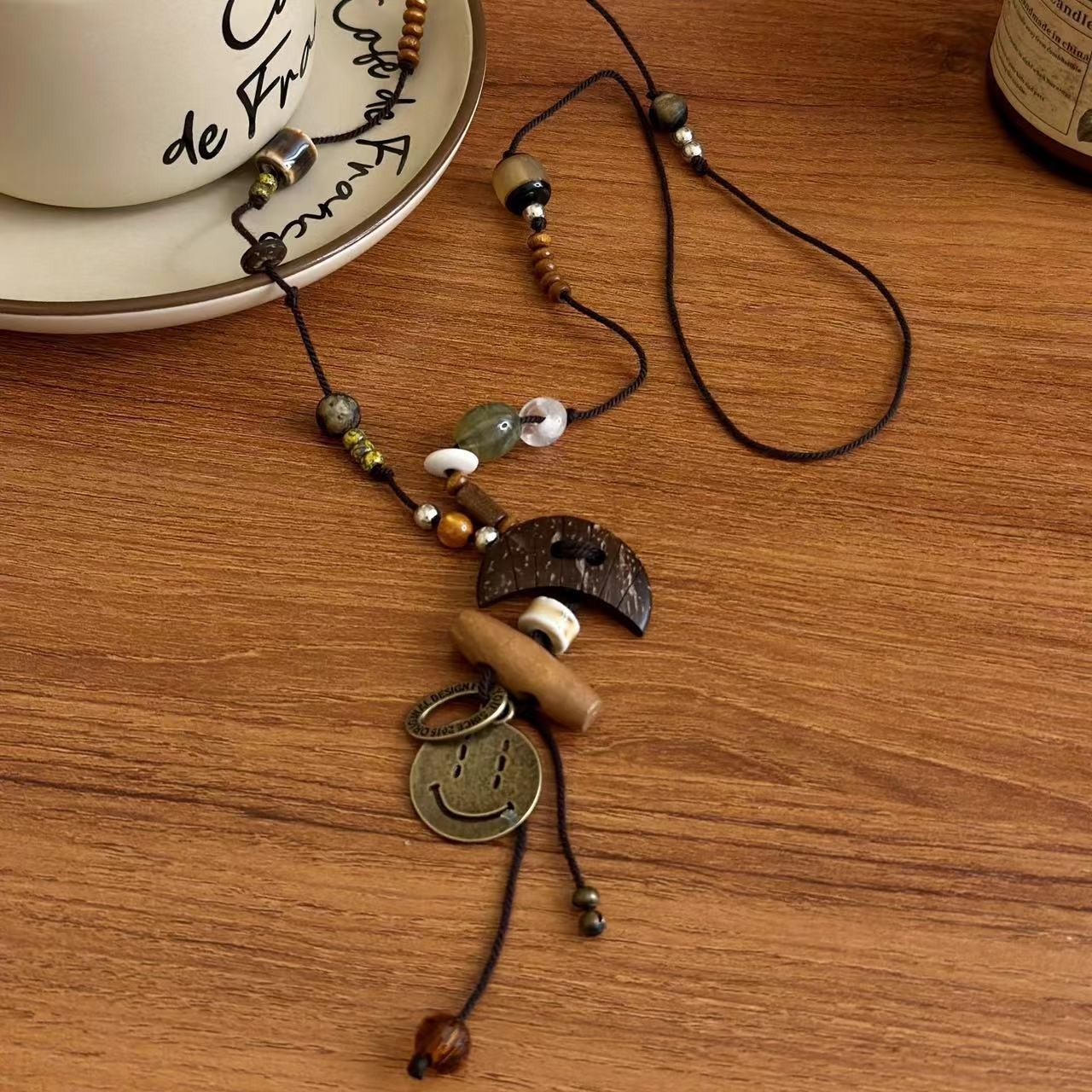 Color: Crescent smiley black rope long necklace