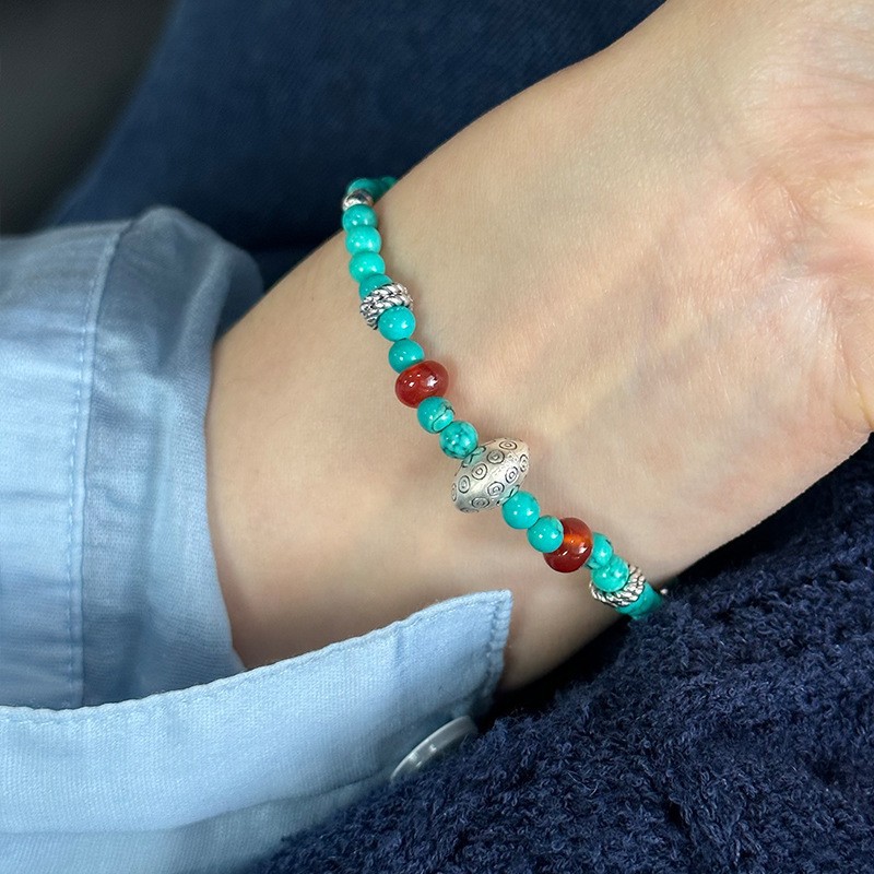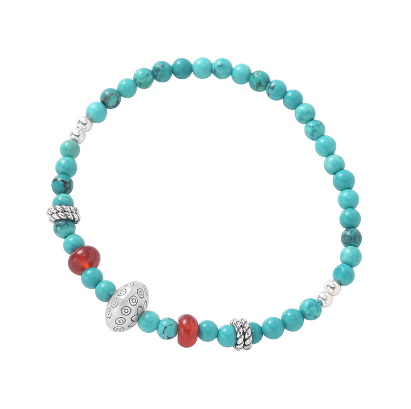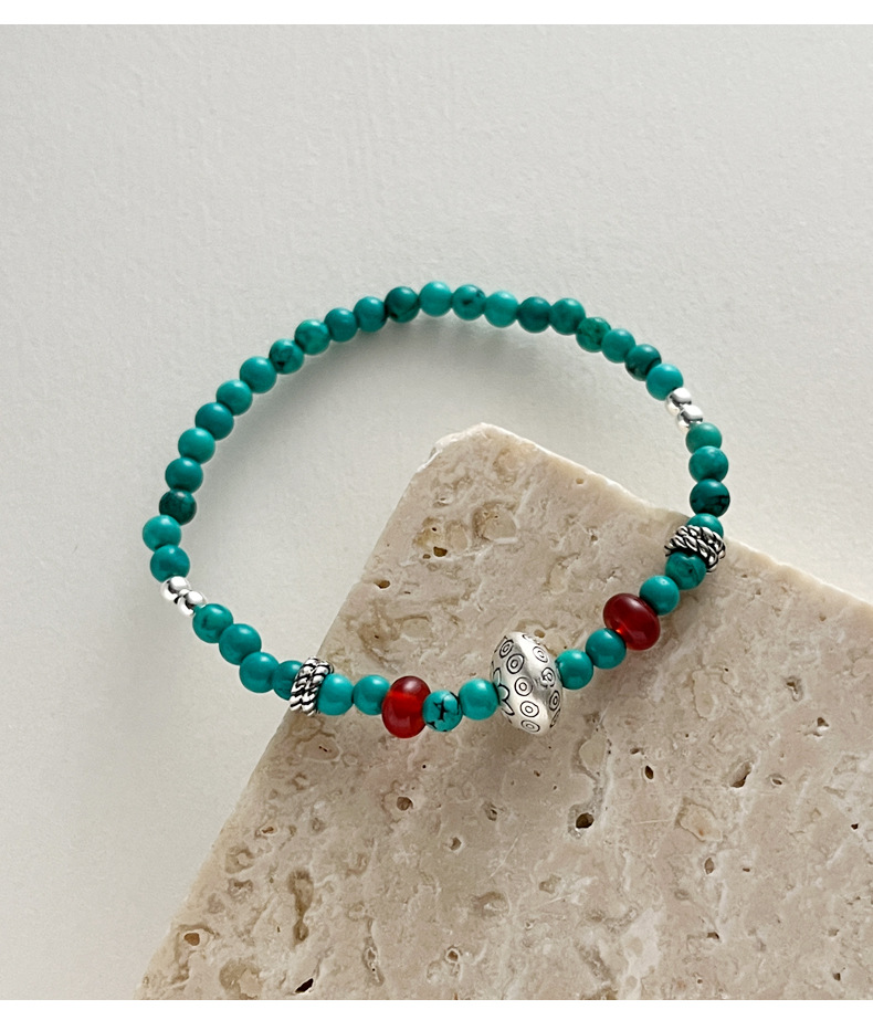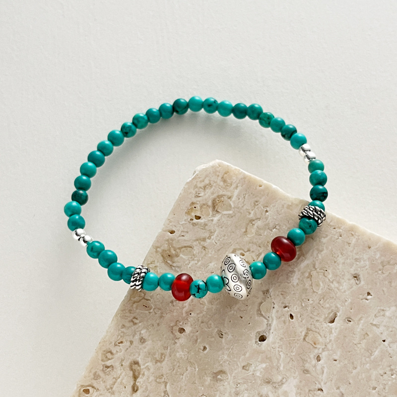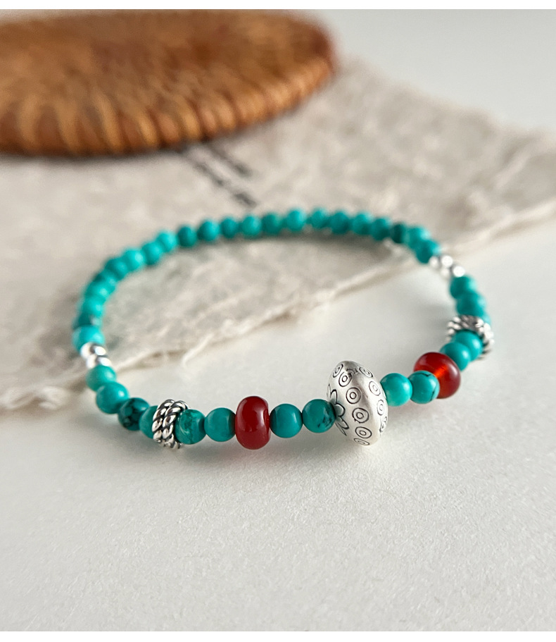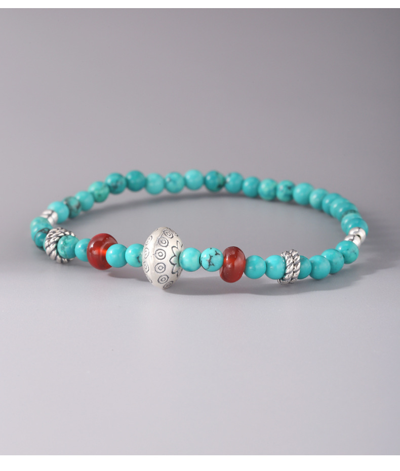 925 Sterling Silver Synthetic Turquoise Disc Bracelet for Women National Style Fashion Elegant Handmade Beaded Stamstring Bracelet B3271