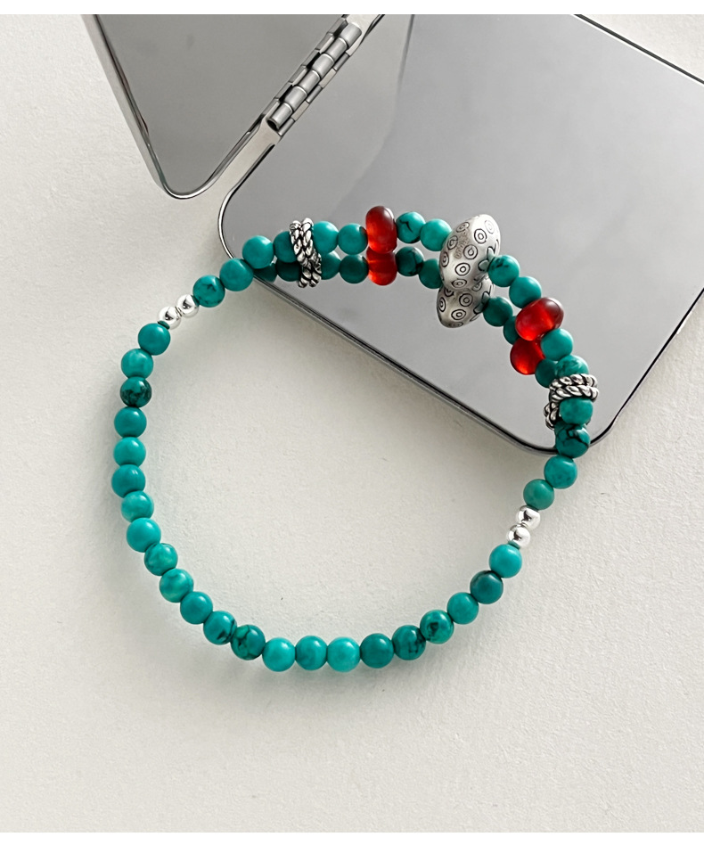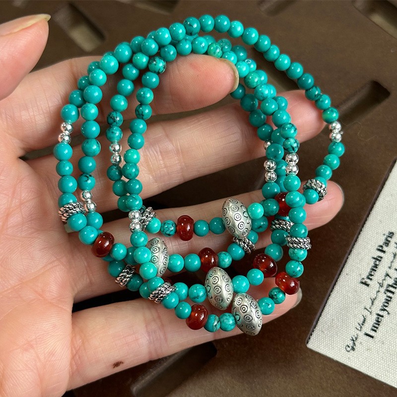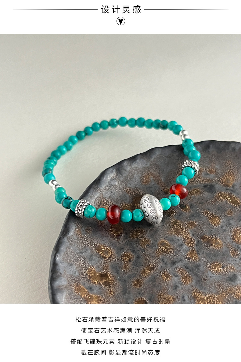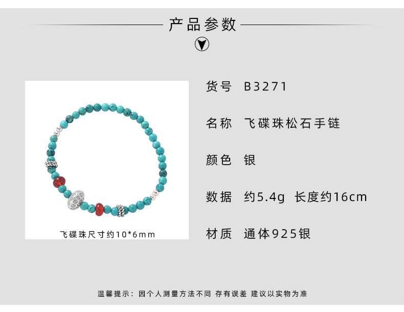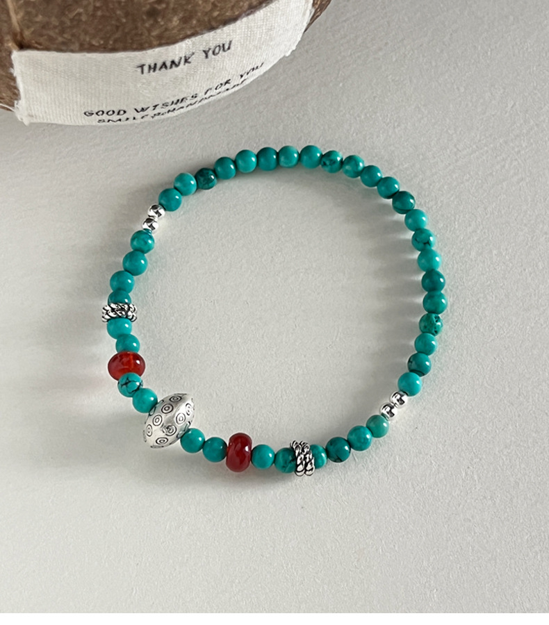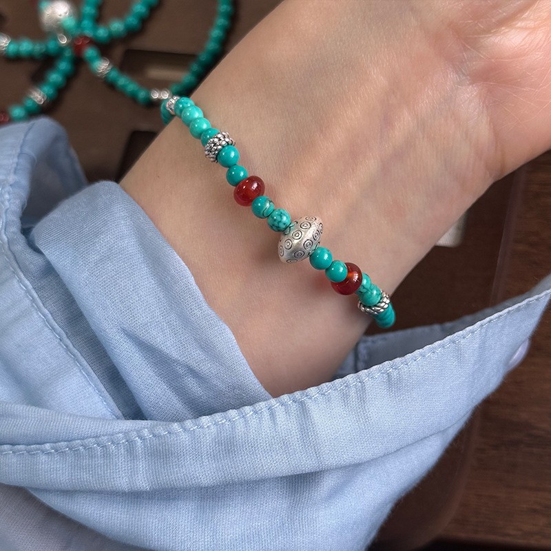 925 Sterling Silver Synthetic Turquoise Disc Bracelet for Women National Style Fashion Elegant Handmade Beaded Stamstring Bracelet B3271