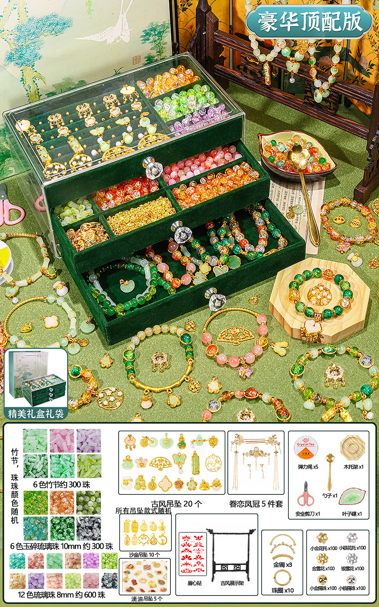 Color: Green deerskin jewelry box + luxury top version 24 colors 1200 beads ancient style glass beads set + phoenix crown five-piece set