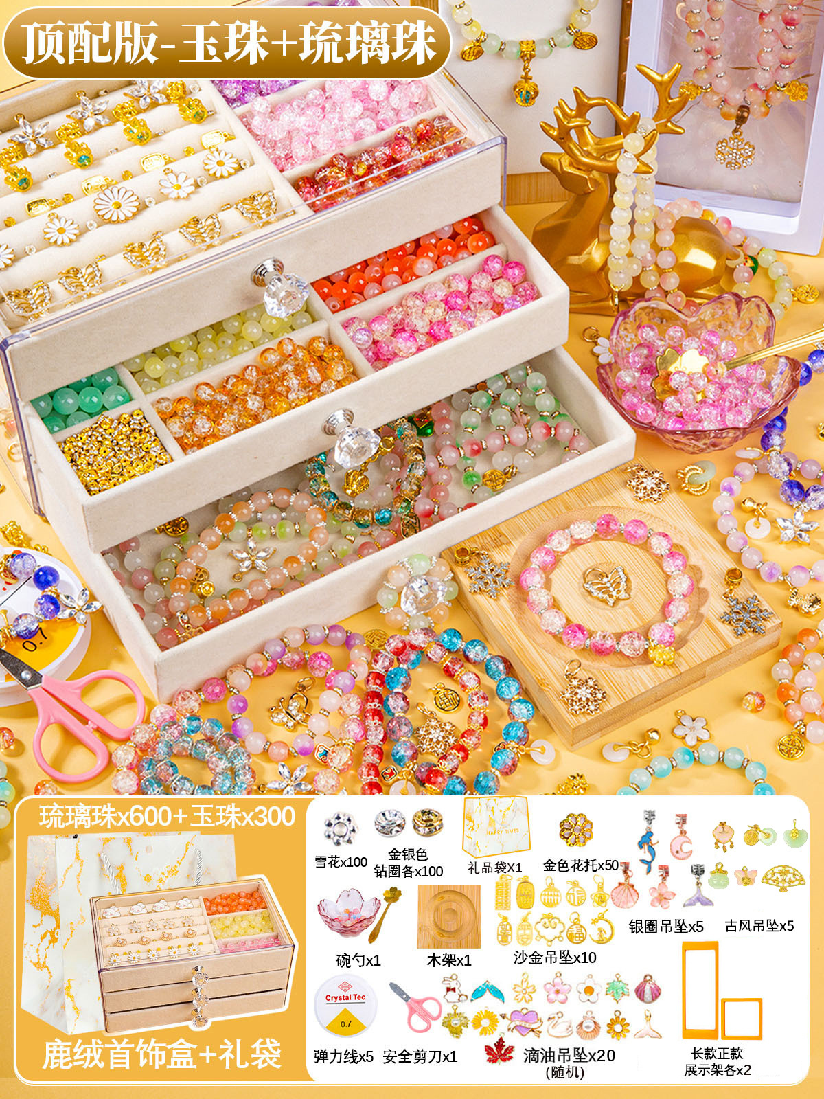 Color: Beige deerskin jewelry box + luxury version 12 colors 600 beads ancient style glass beads broken jade beads set meal