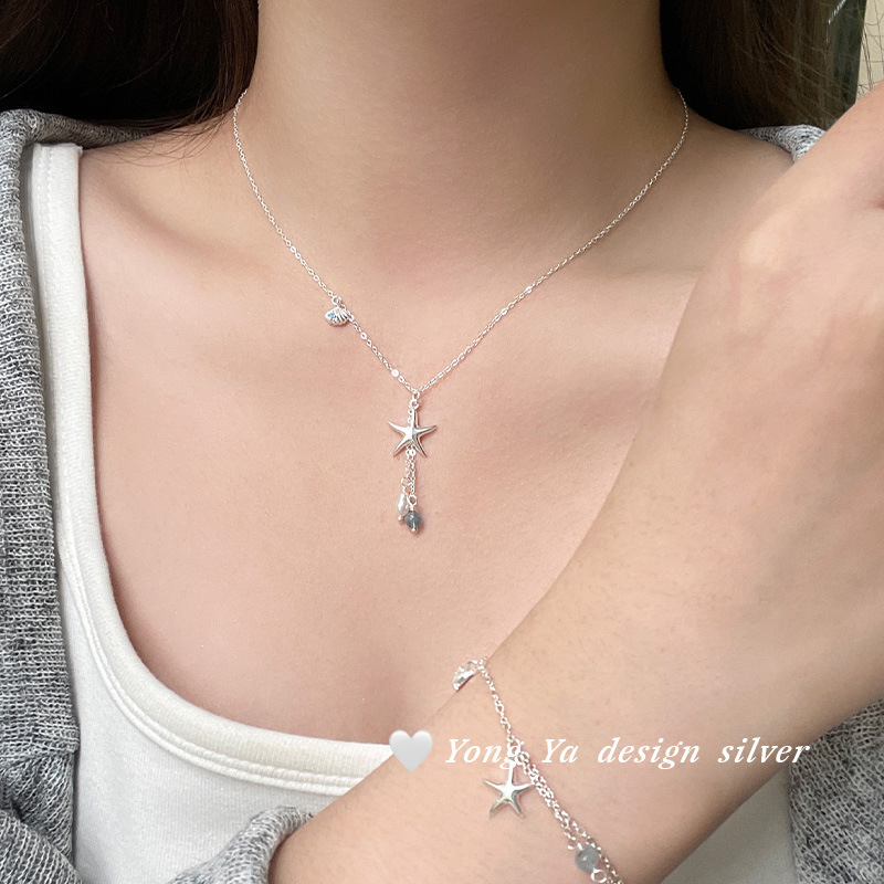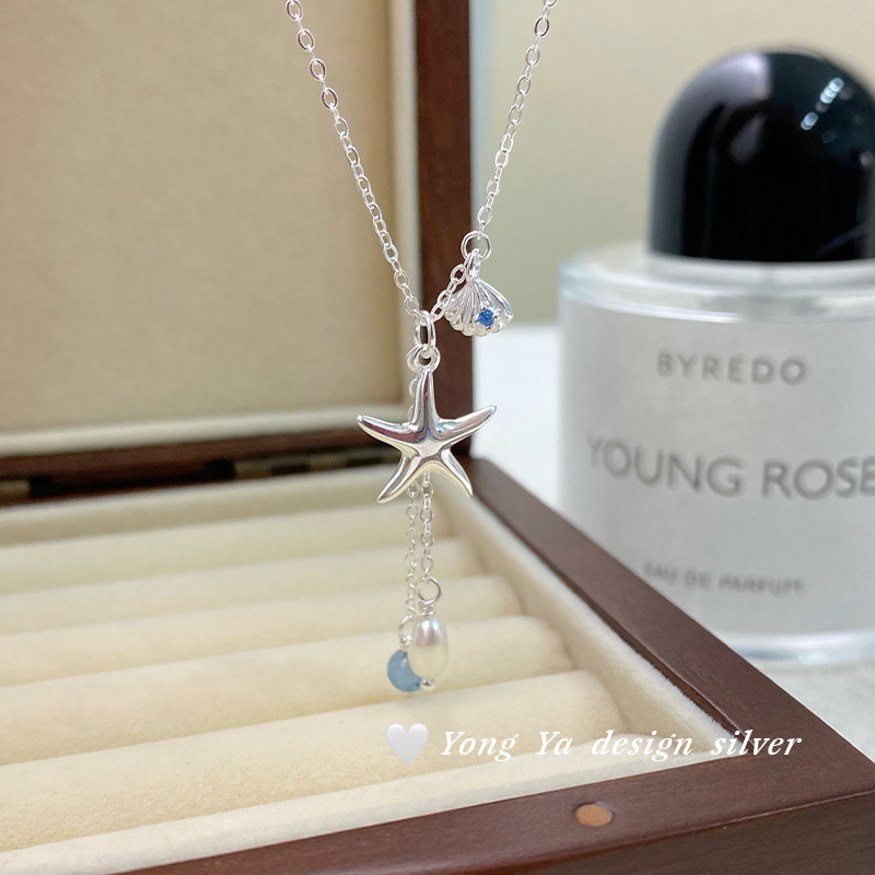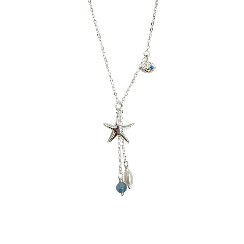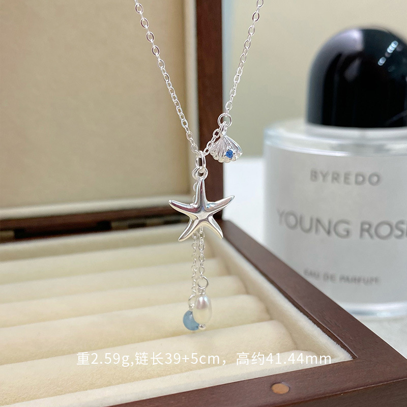 Color: S925 sterling silver starfish aquamarine pearl necklace--silver