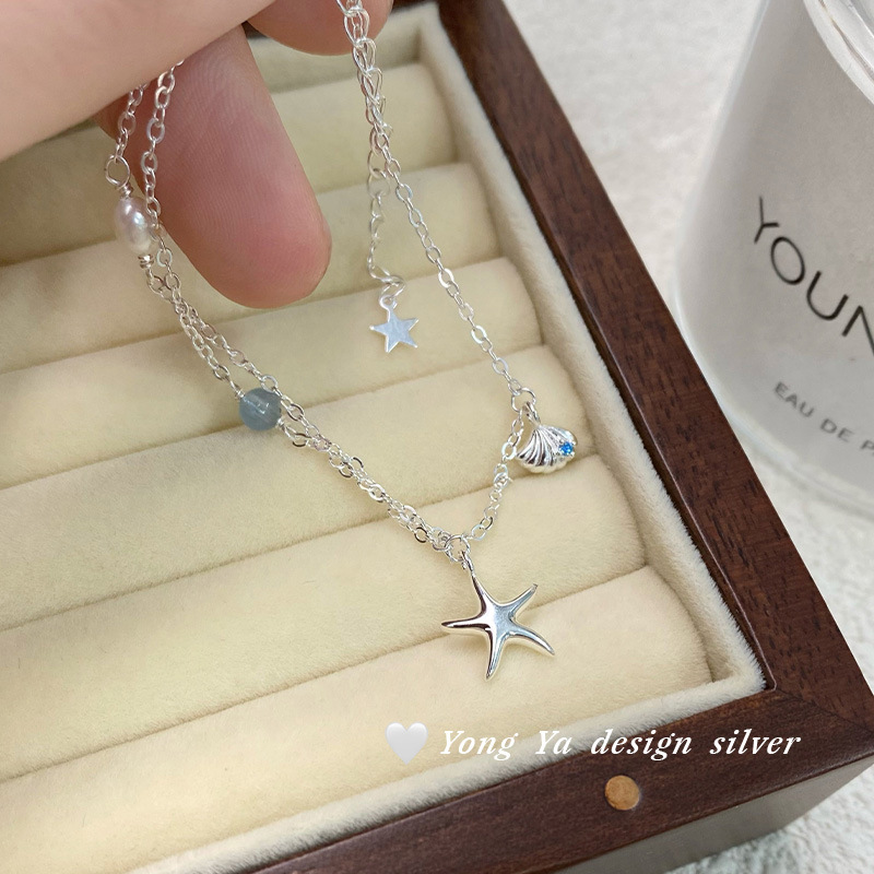 Color: S999 pure silver starfish aquamarine pearl necklace--silver