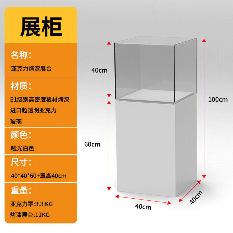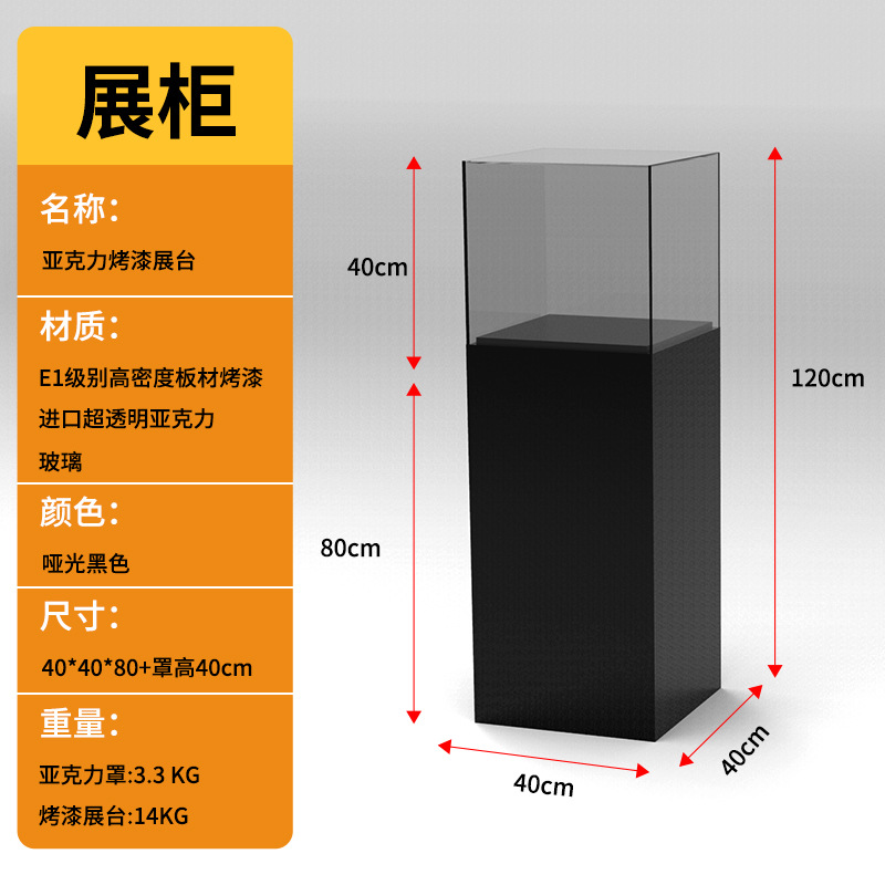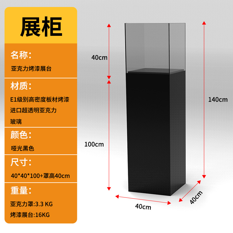 Specifications: Painted base 40*40*100+40cm high acrylic cover