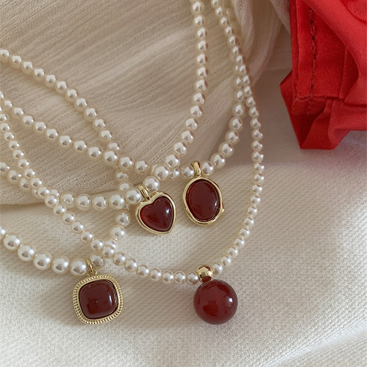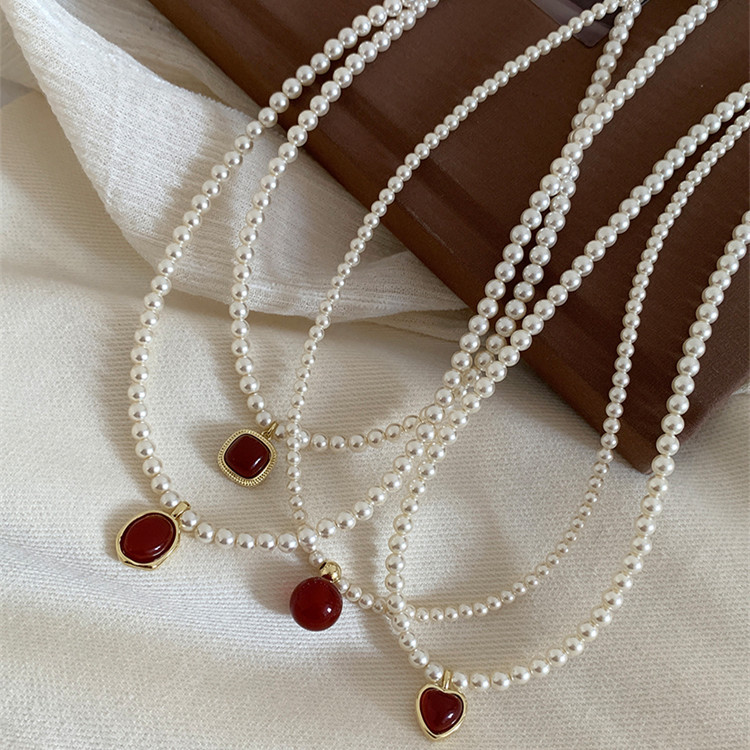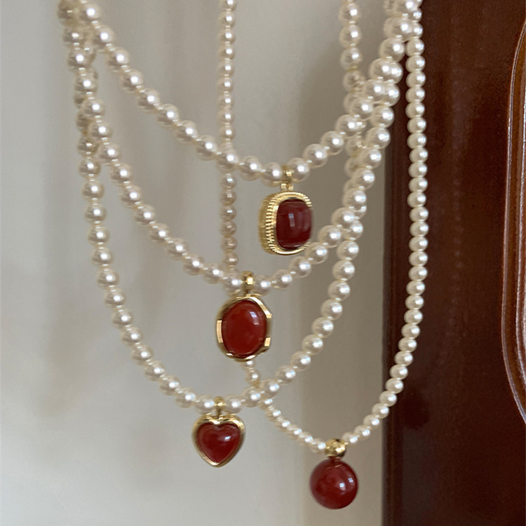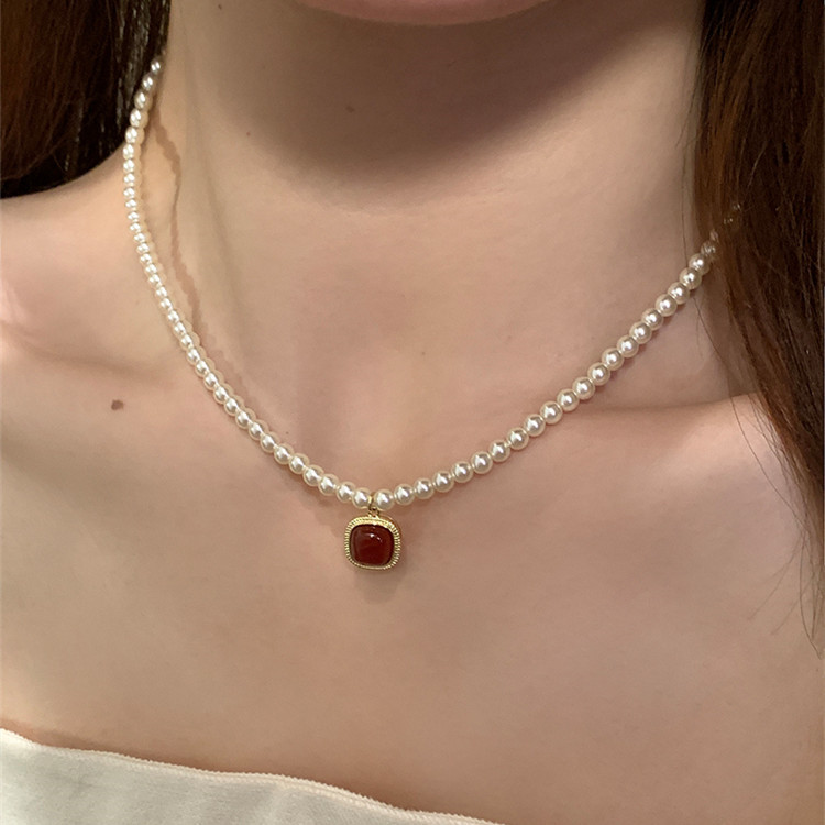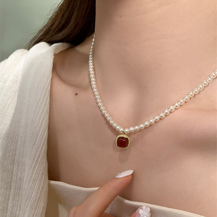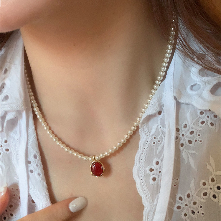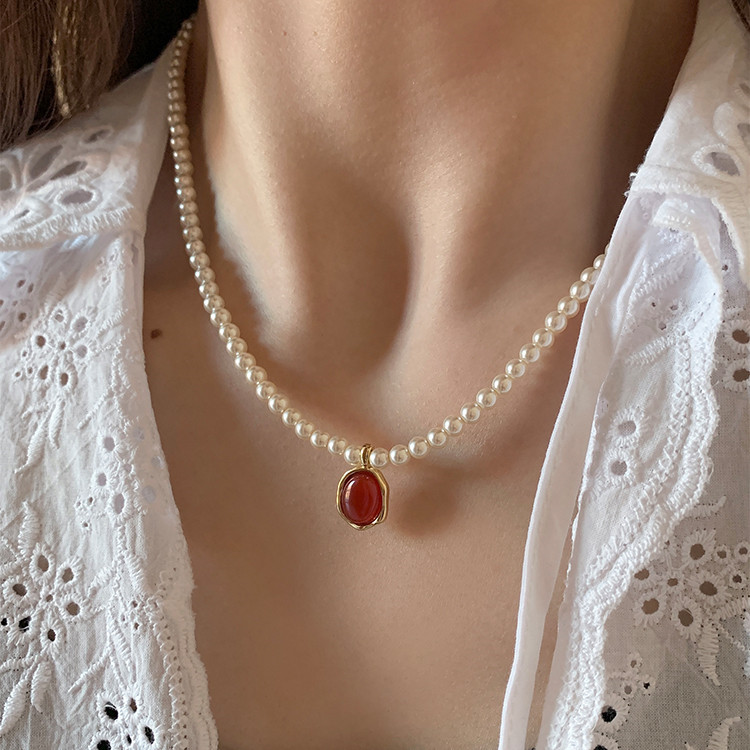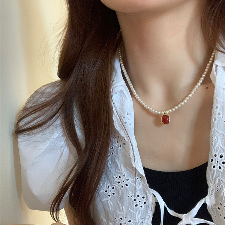 French Style Simple Retro Red Pendant Pearl Necklace New French Style Retro Light Luxury High-end Dress Chain for Women