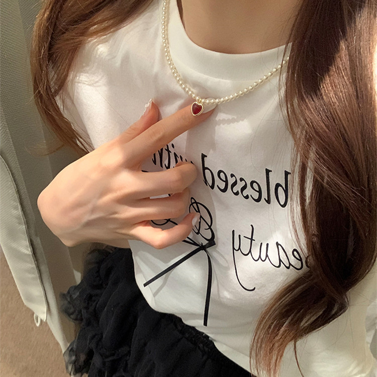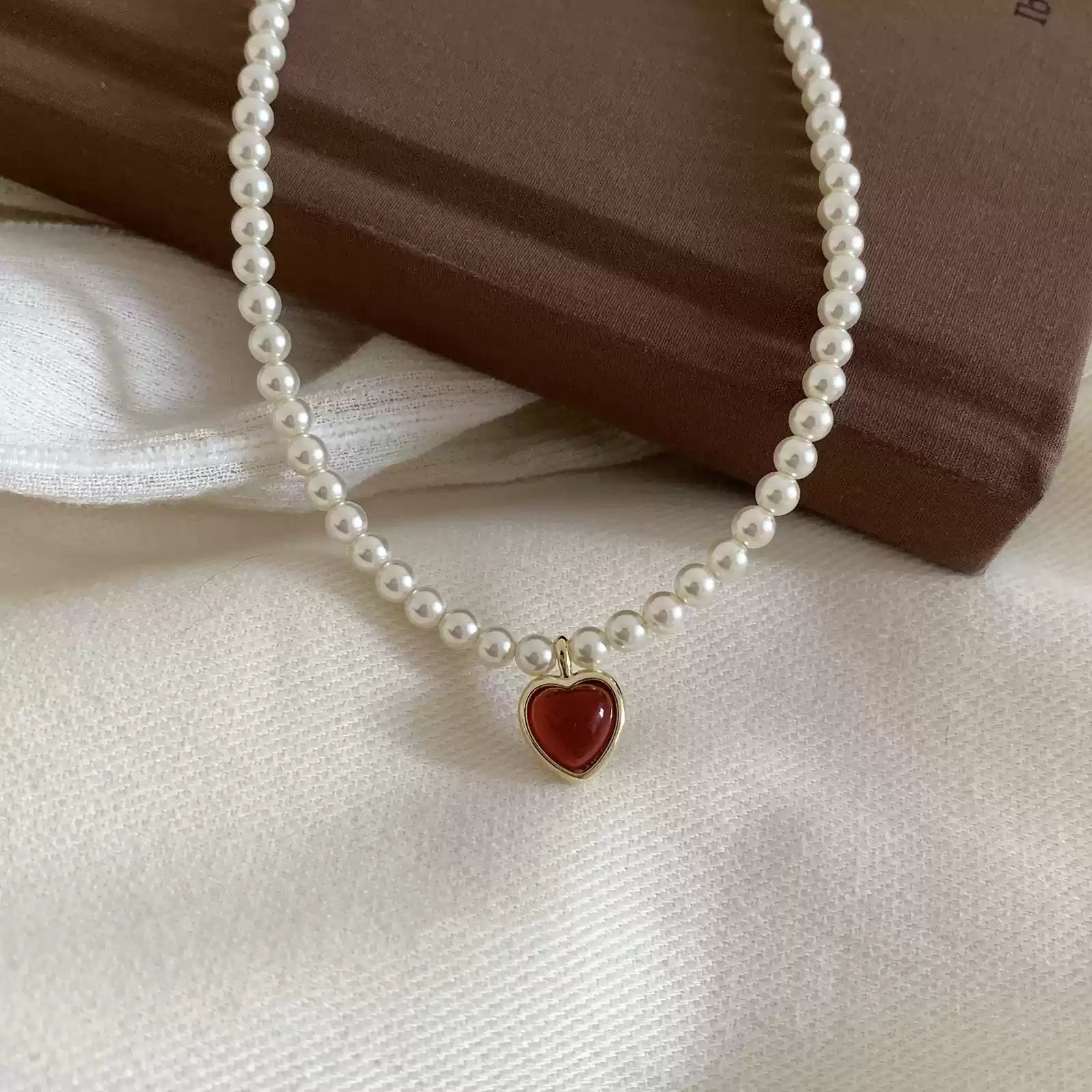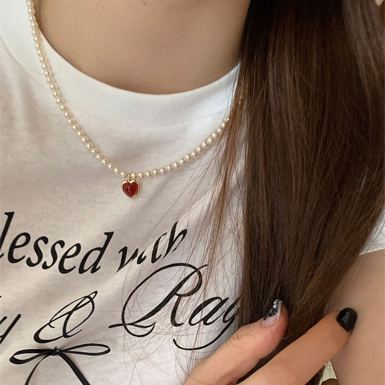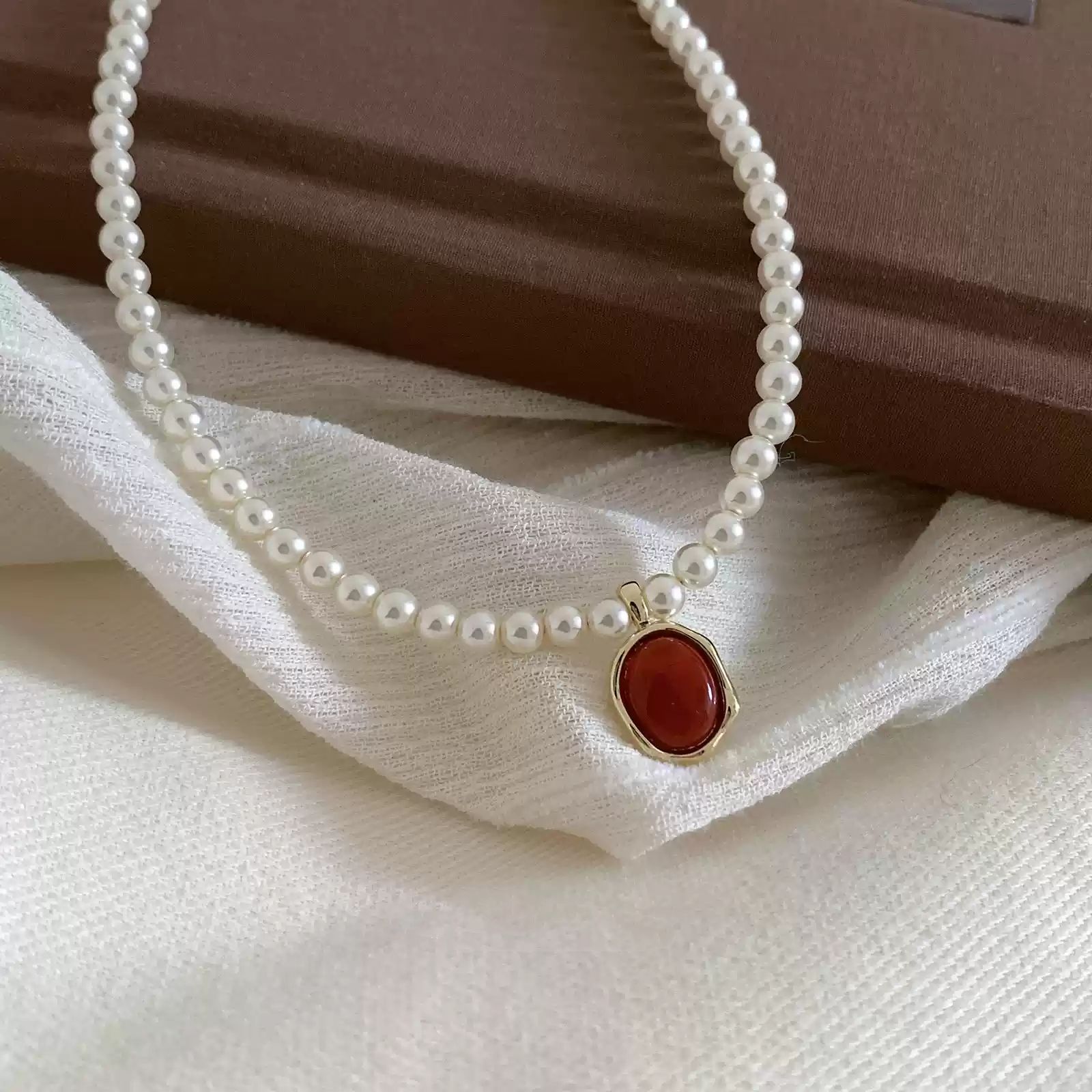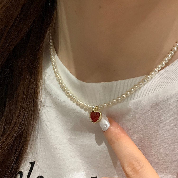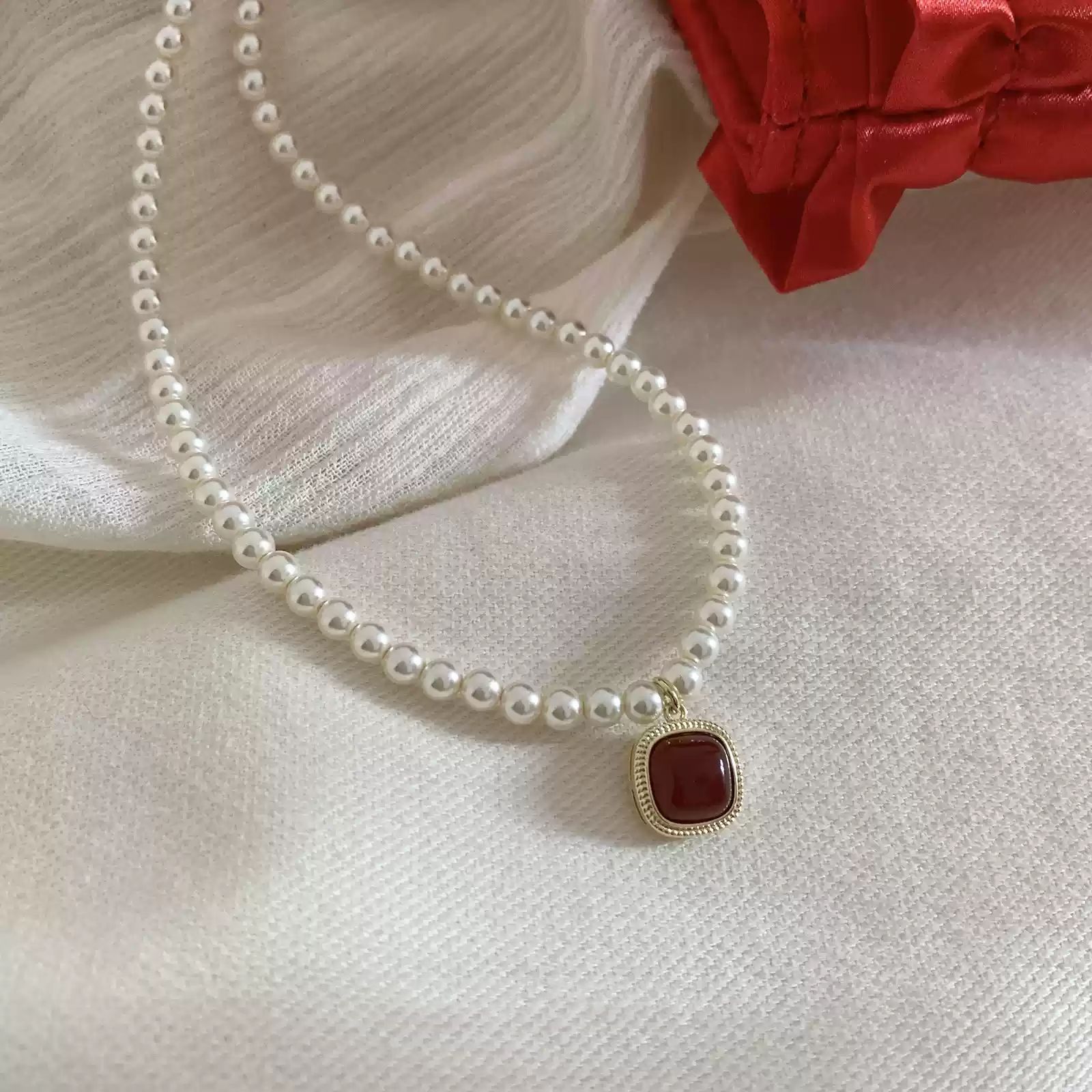 French Style Simple Retro Red Pendant Pearl Necklace New French Style Retro Light Luxury High-end Dress Chain for Women