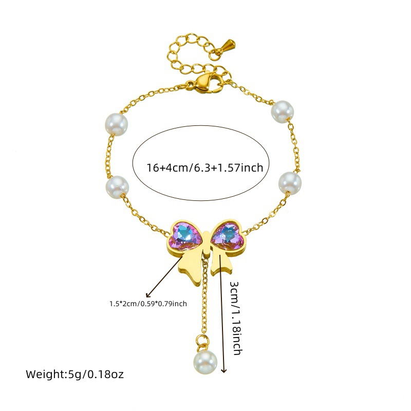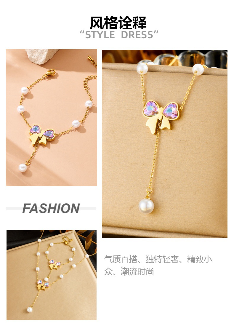 Cross-border Fashion Colorful Rhinestone Bow Gold Plated Pearl Chain Stainless Steel Tassel Pendant Necklace Bracelet suit