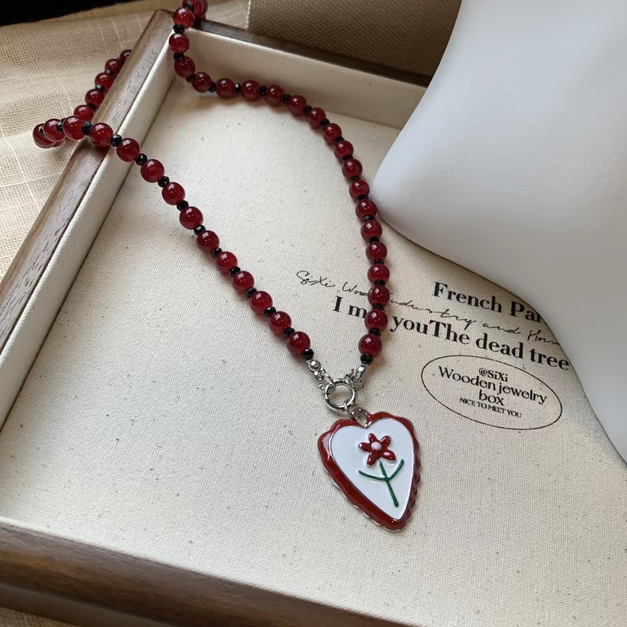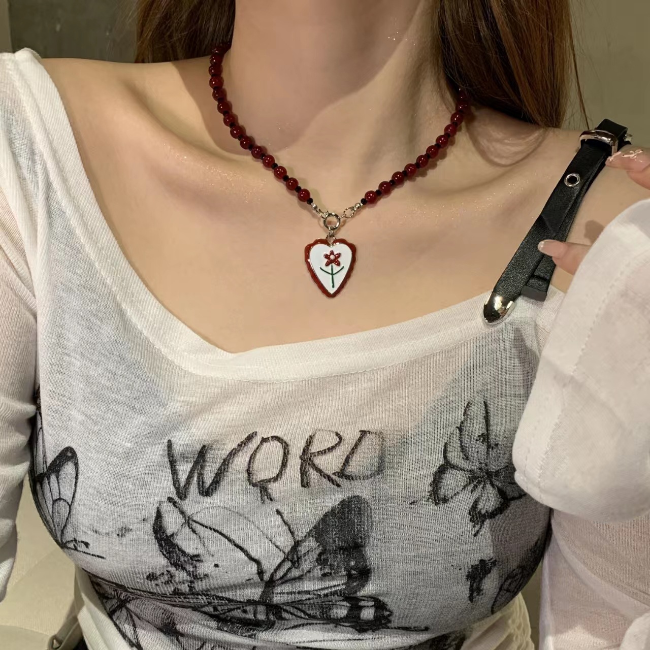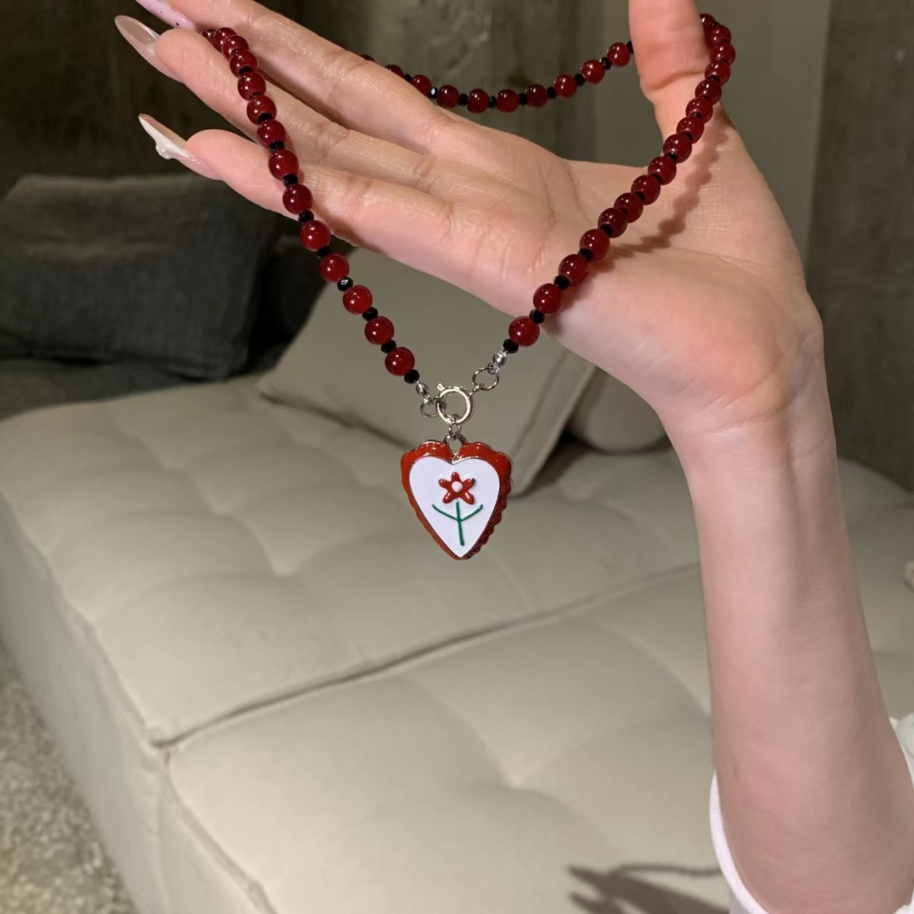 Korean Style Simple Sweet Red Flower Pendant Beaded Clavicle Chain Women's Niche High-end Neckchain Clavicle Chain Trendy