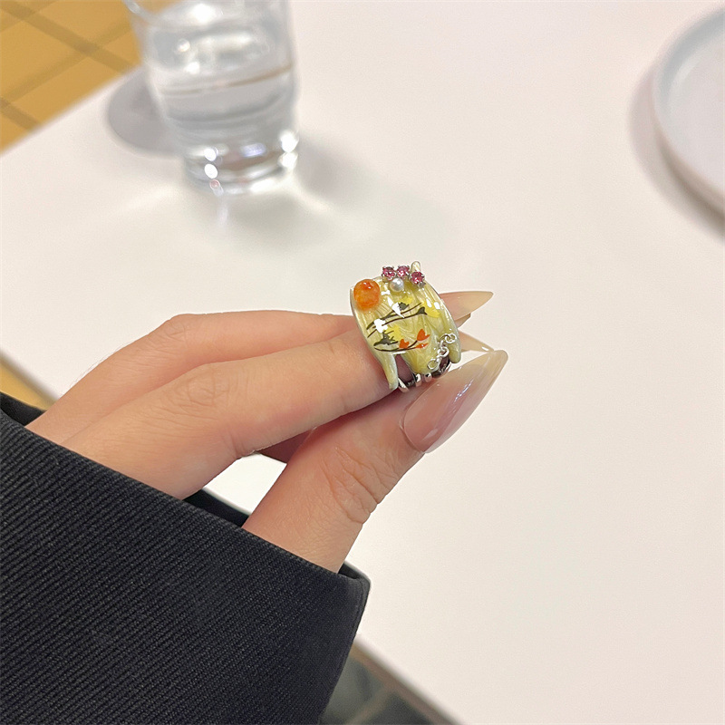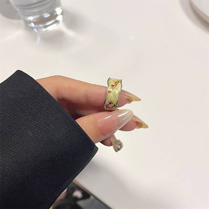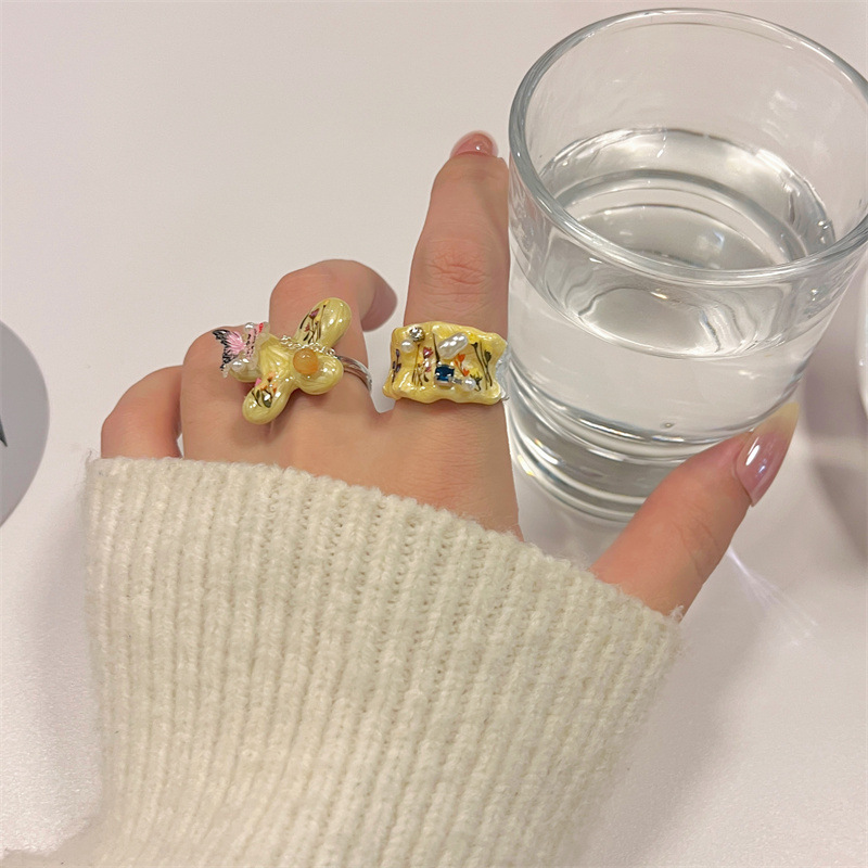 Sweet Cool Y2K Handmade Enamel Oil Dropping Butterfly Ink Painting Wide Edition Stacked Ring Women's National Fashion Advanced Sense Ring Ring