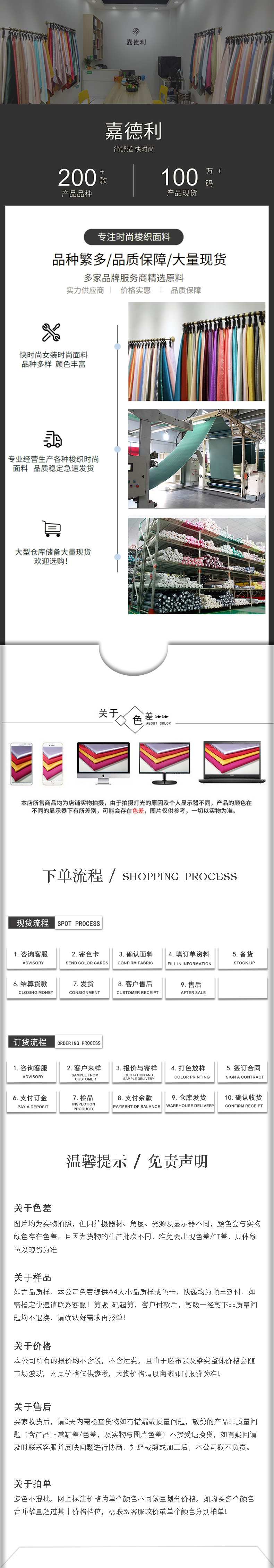 嘉德利纺织秉承“诚信为本以质取胜”的服务理念,以市场需求为导向,发展和完善产品强化内部管理及服务,树立企业形象!我们希望凭籍自己雄厚的实力,与广大客户携手共进,共创辉煌。