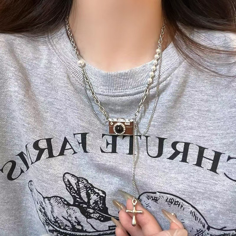 Simple retro camera necklace retro brown camera pendant girls 2024 autumn and winter sweater chain hip-hop necklace trendy