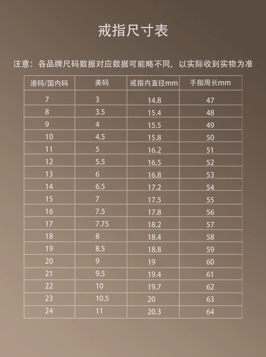 码数:本款戒指是美码5 6 7 8 9号,兑换港码约10/11,13,15,17/18,20号。