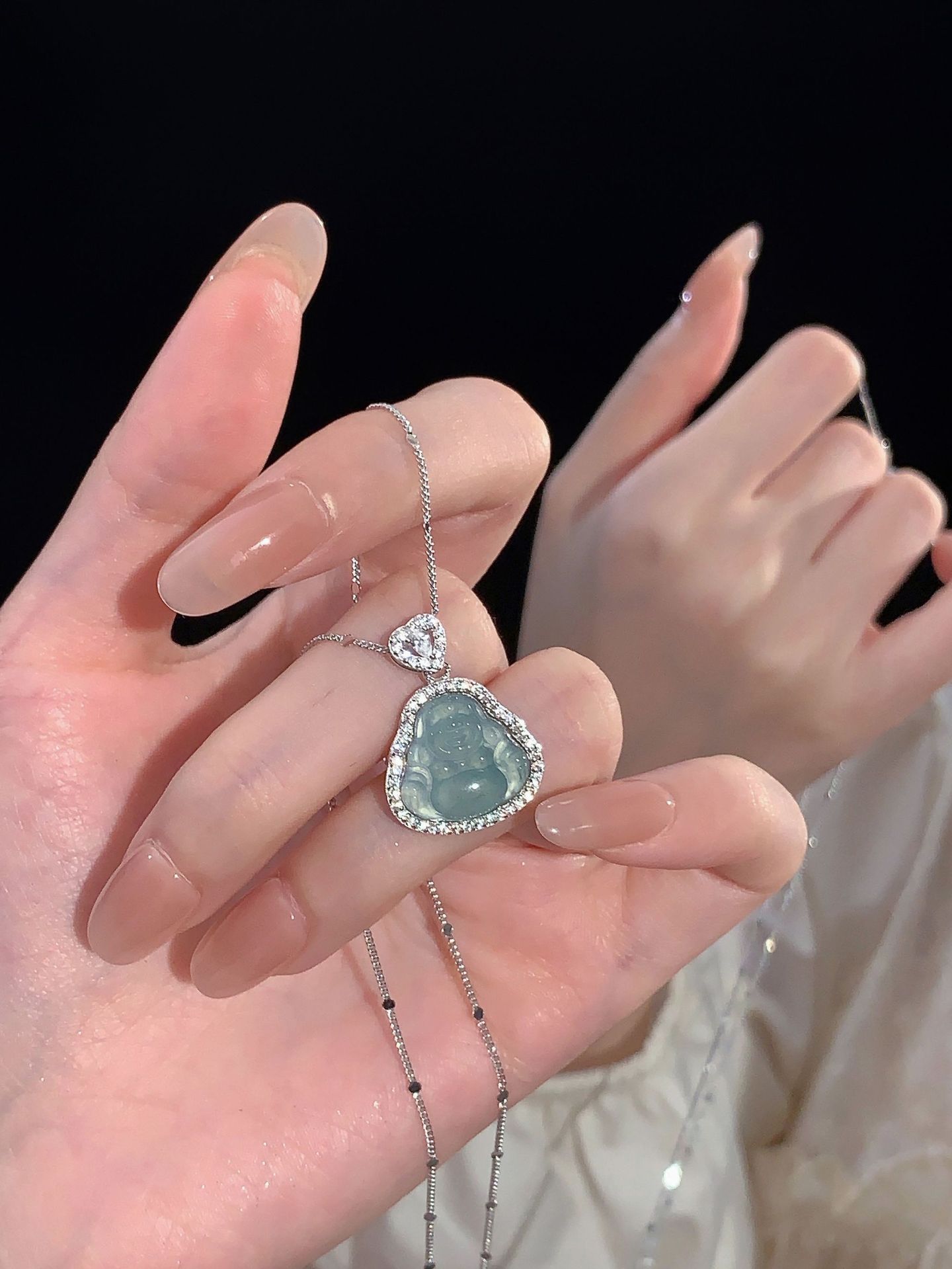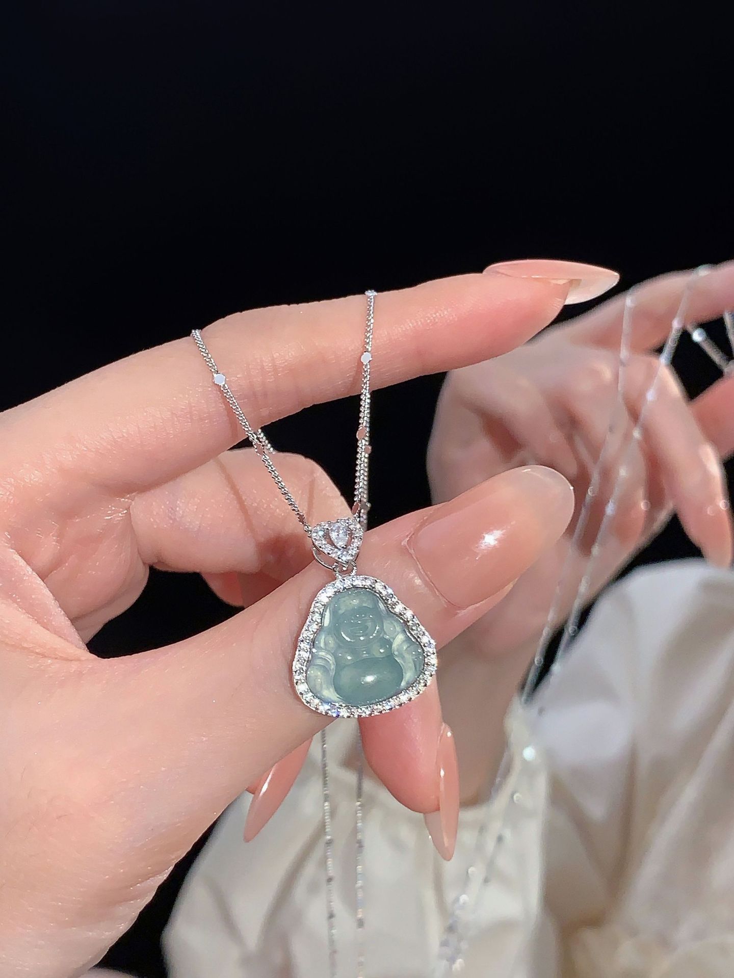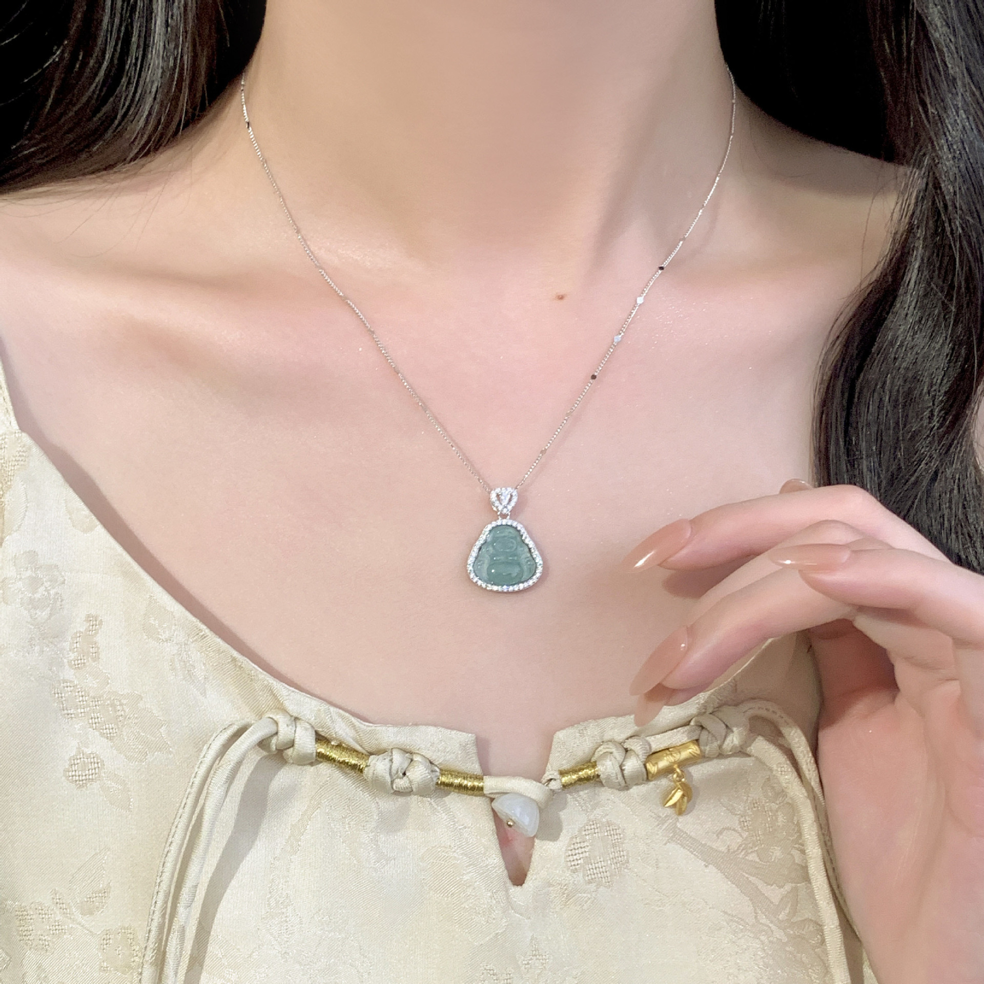 Tiki Real Shot S925 Sterling Silver Blue Water Emerald Buddha Male Necklace Women's Light Luxury High-end Sense Maitreya Buddha Clavicle Chain Necklace Chain