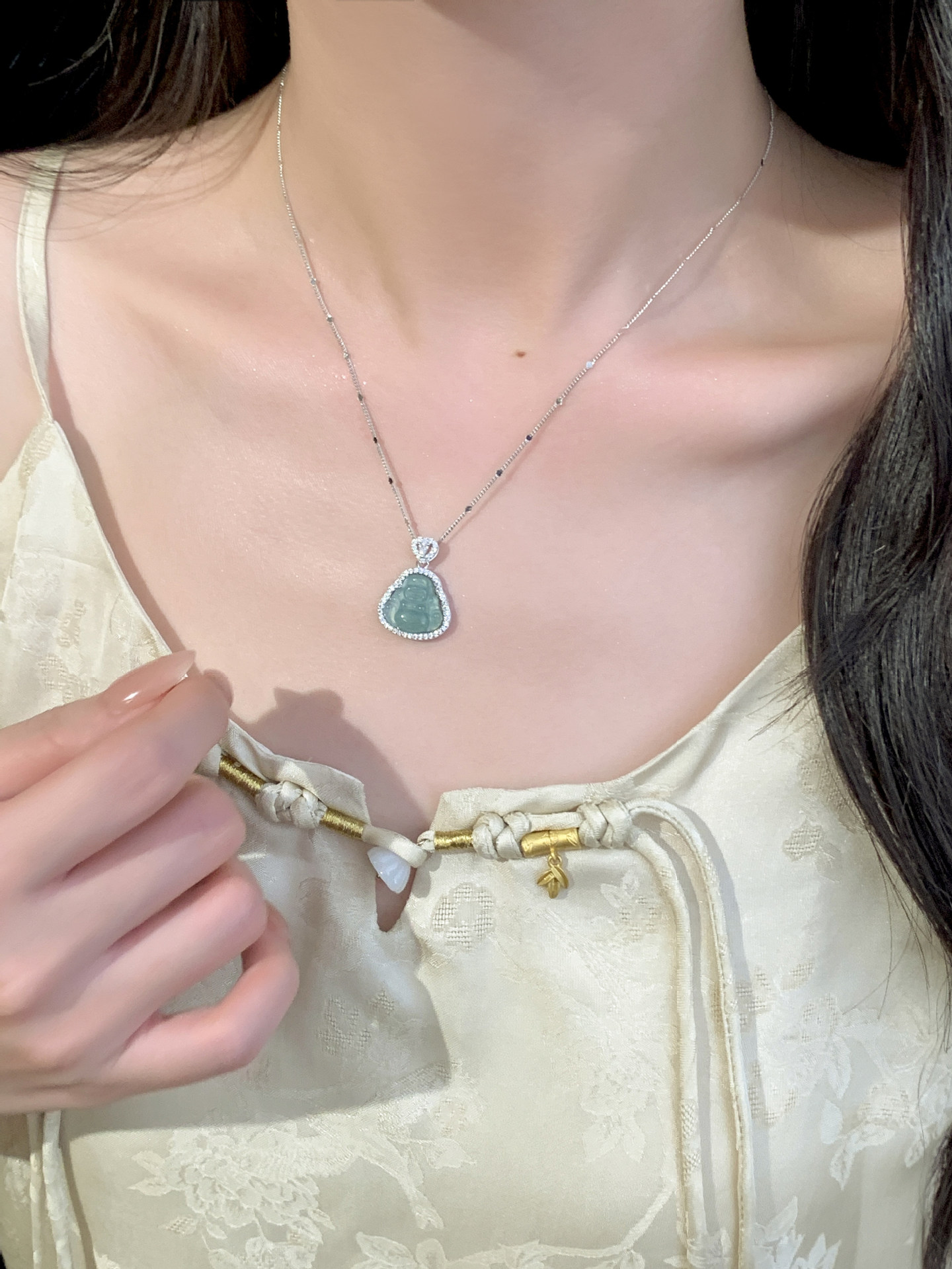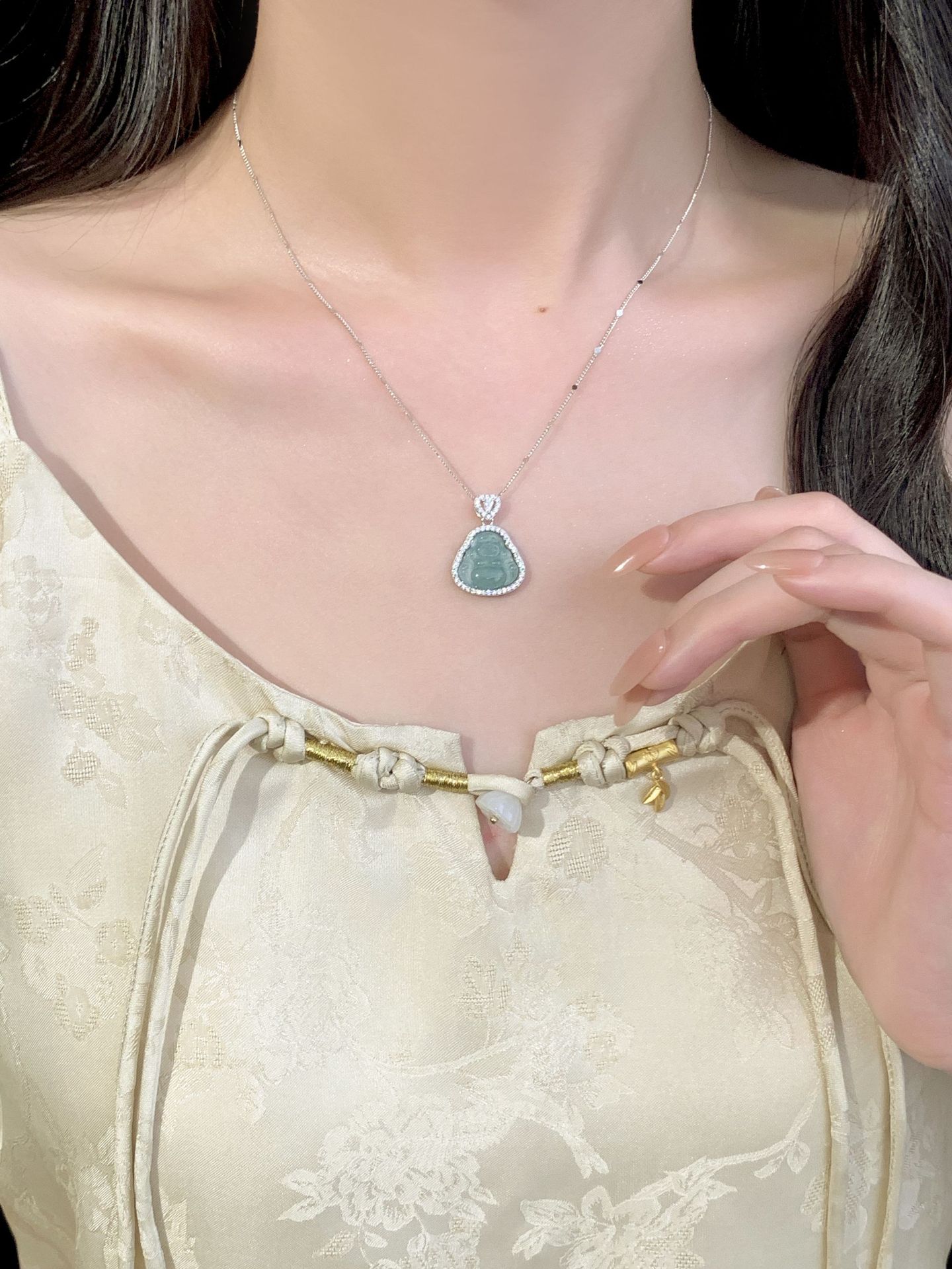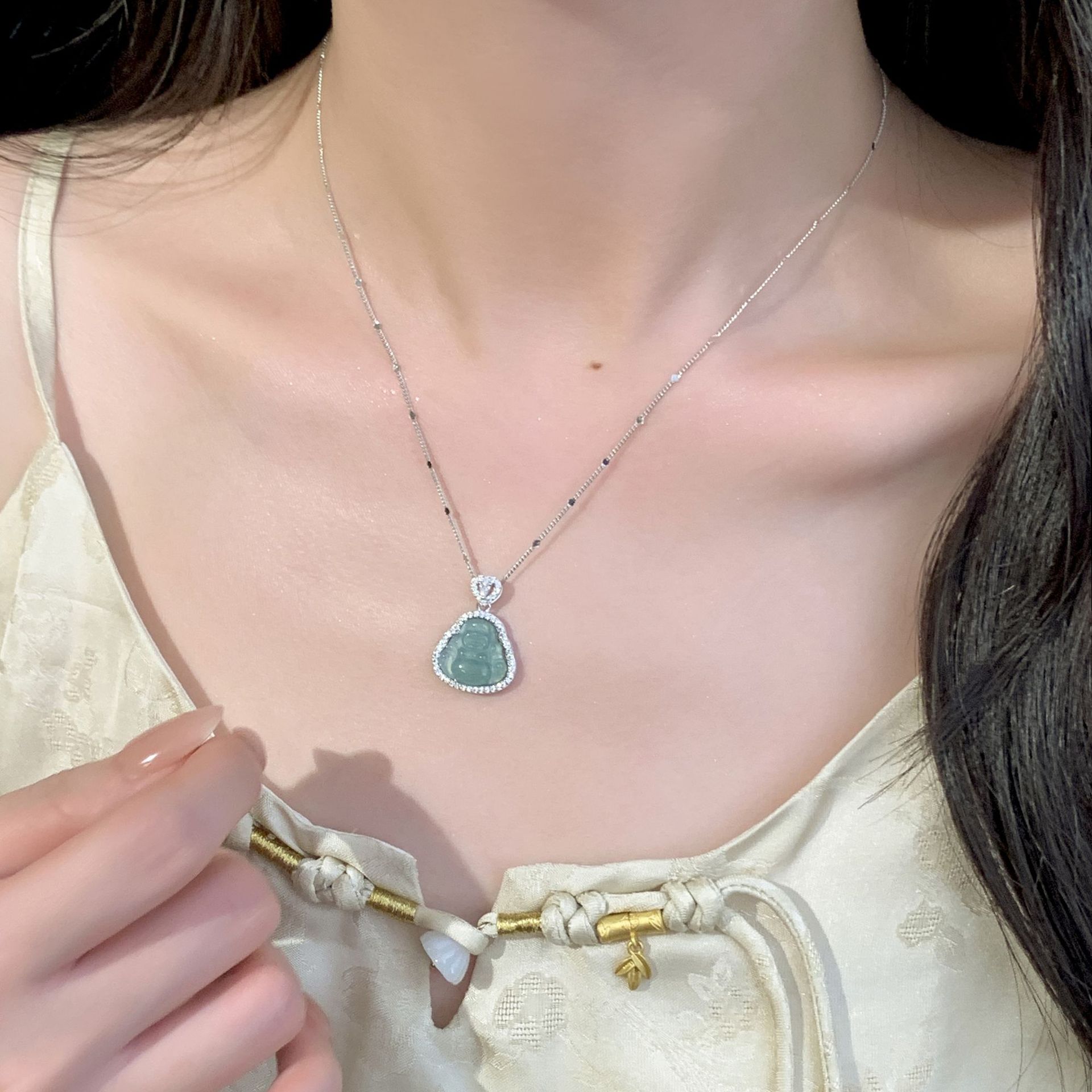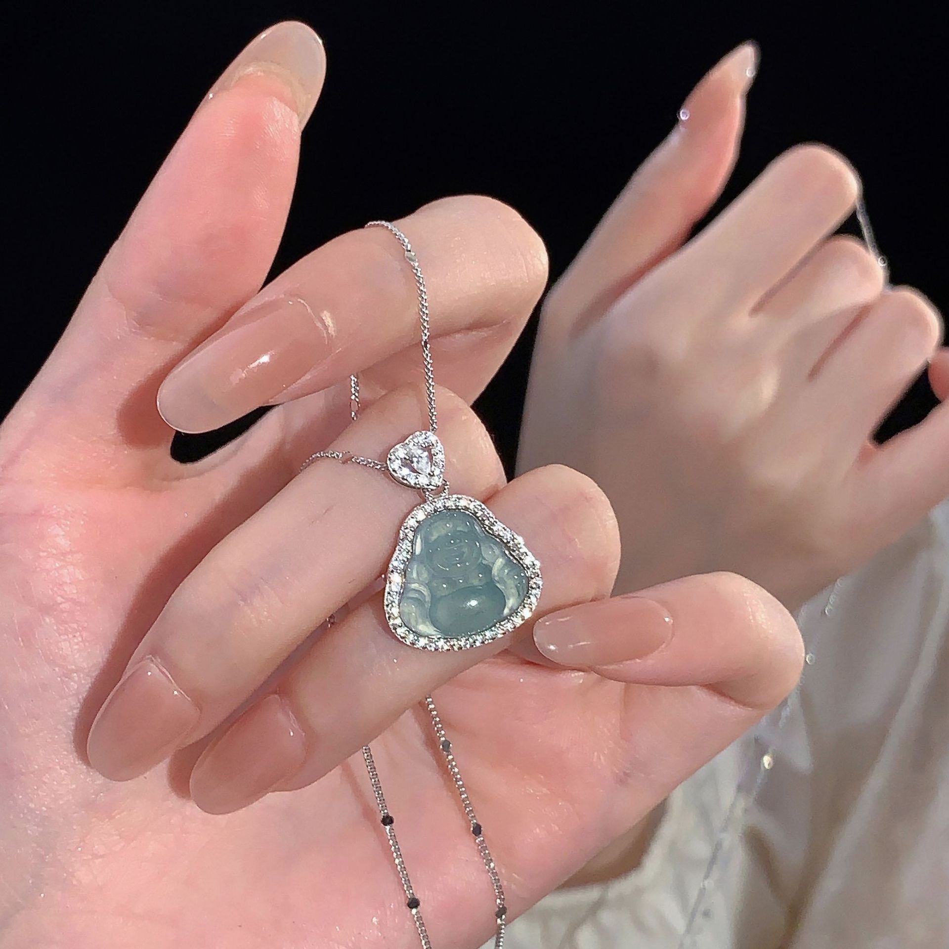 Tiki Real Shot S925 Sterling Silver Blue Water Emerald Buddha Male Necklace Women's Light Luxury High-end Sense Maitreya Buddha Clavicle Chain Necklace Chain
