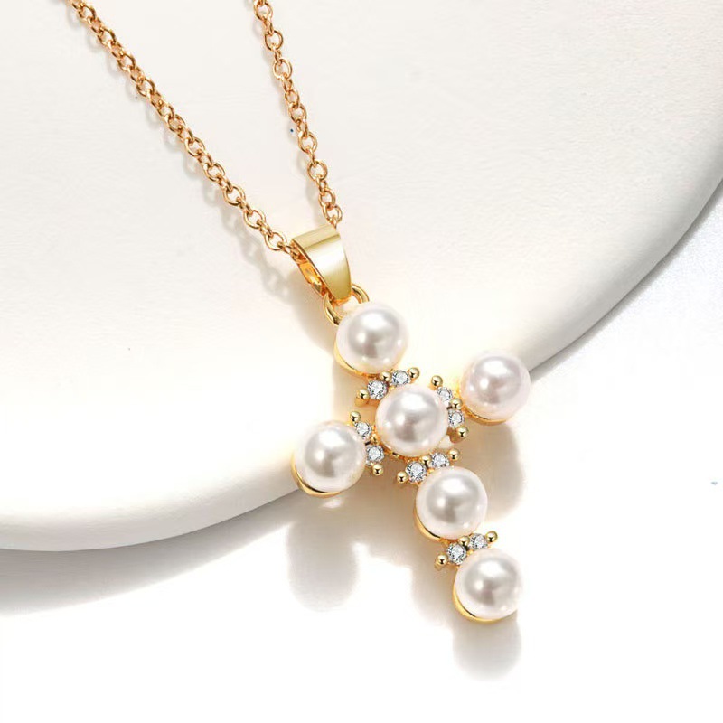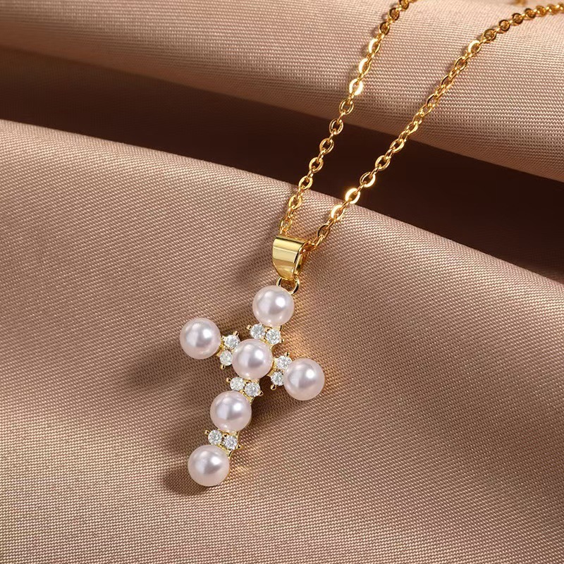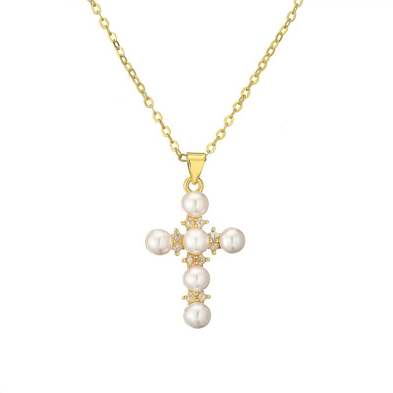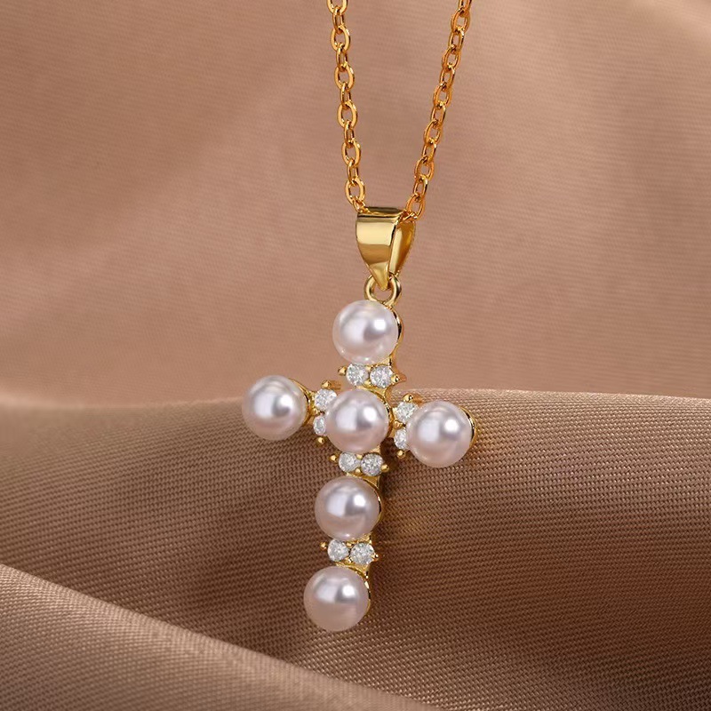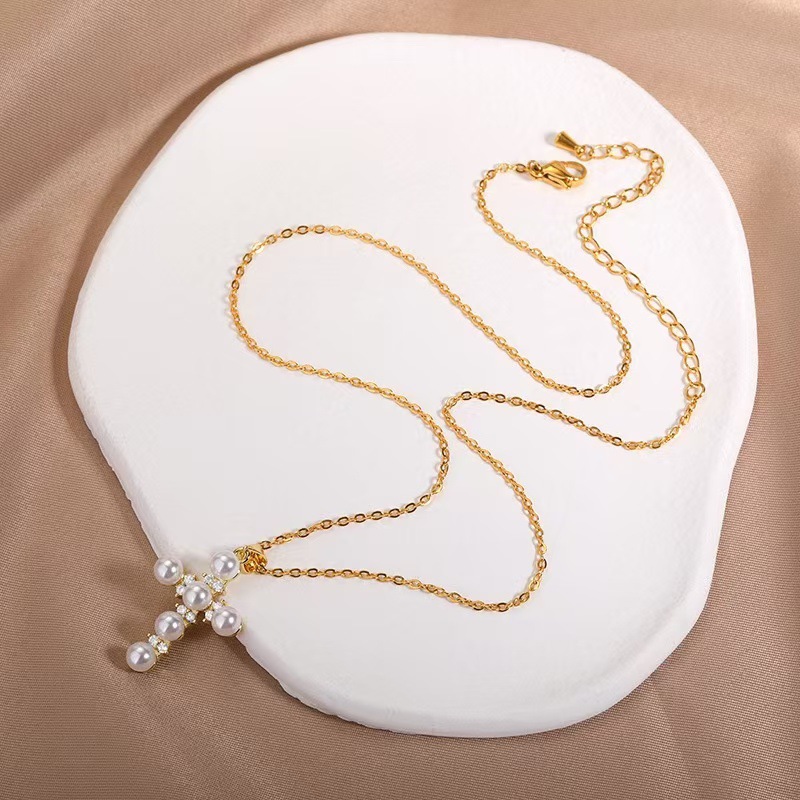 [Titanium Steel] Kaimin Cross-border European and American Fashion New Pearl Cross Necklace Real Gold Plating Factory Wholesale Jewelry