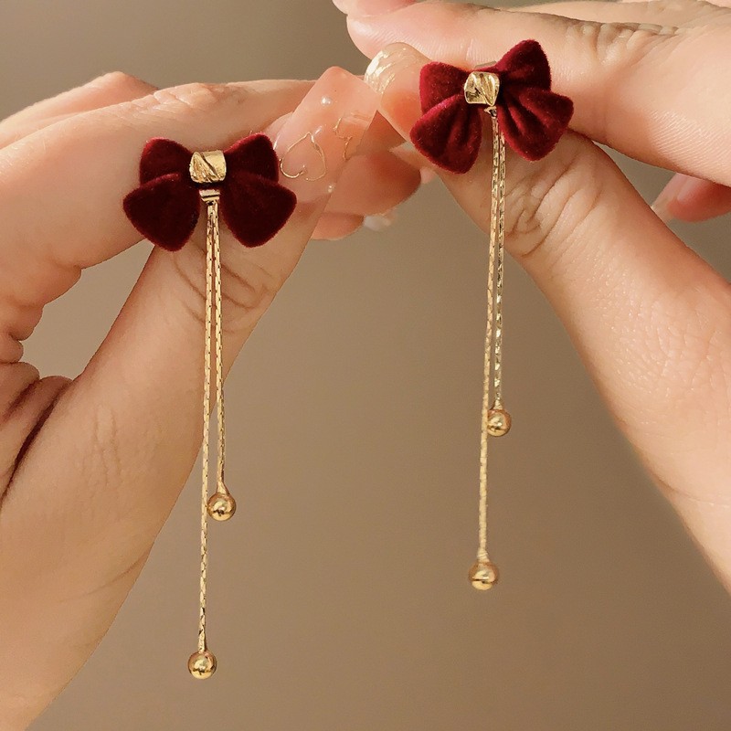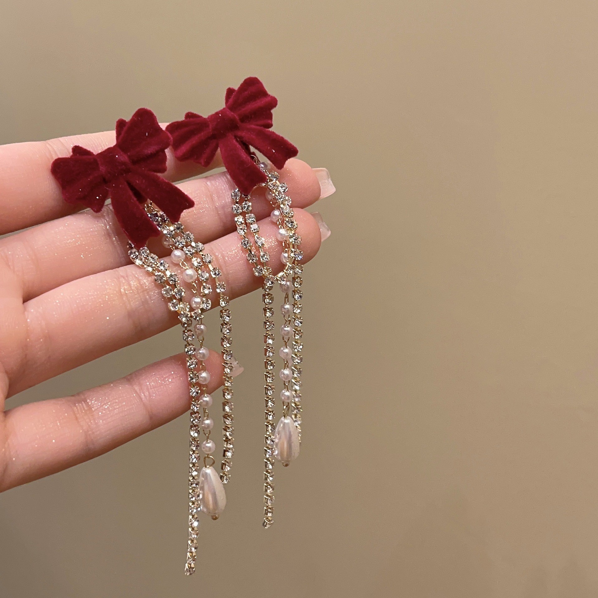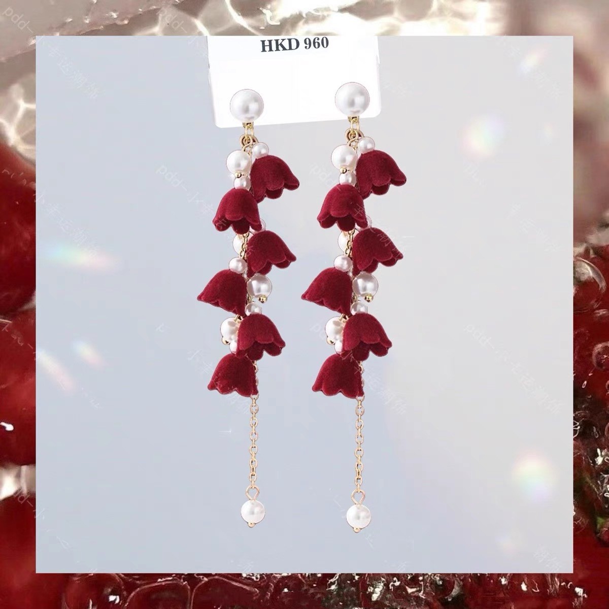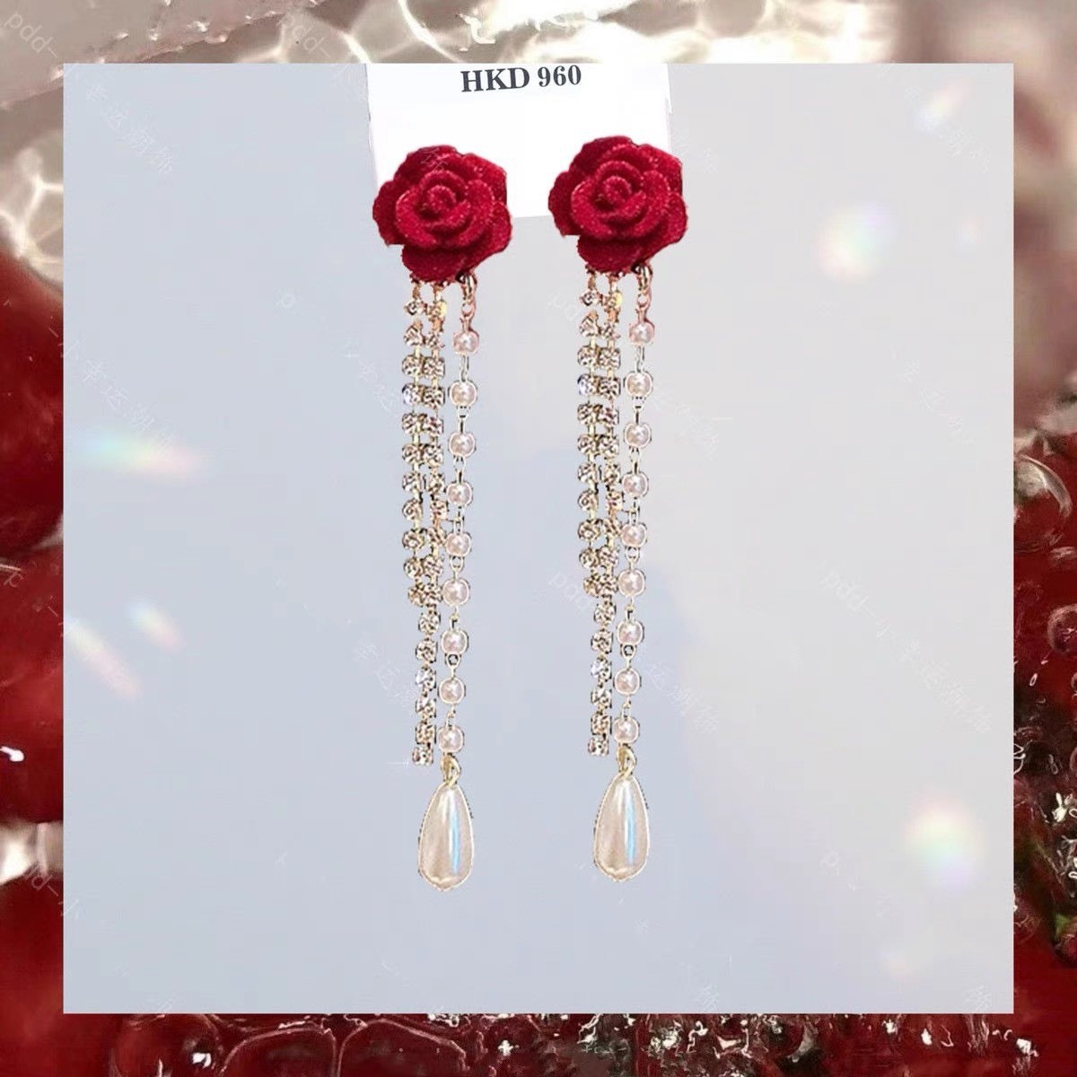 Red Velvet Rose French Retro Super Fairy Tassel Silver Needle Earrings Without Piercing Ear Clips 2025 Autumn and Winter New Style