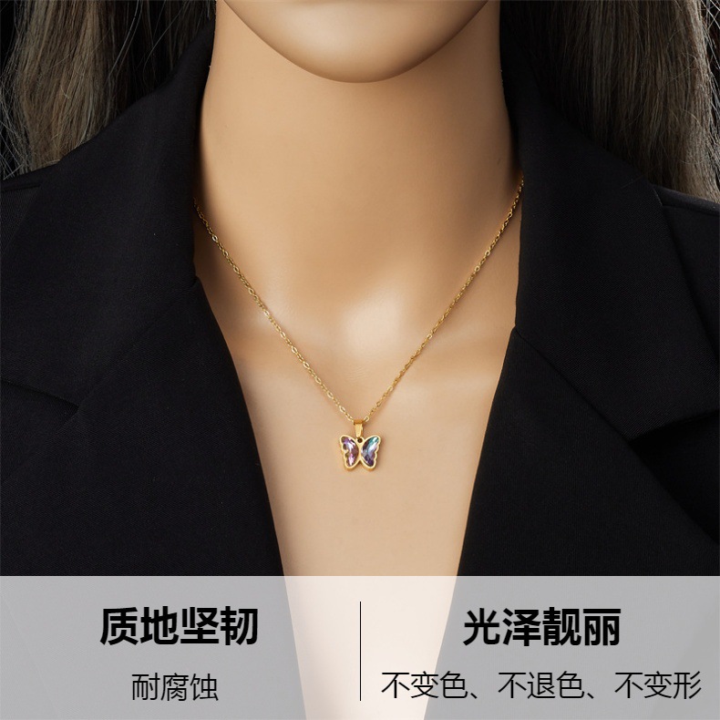 Cross-border fashion new sweet girl gradient butterfly rhinestone pendant stainless steel jewelry necklace earrings jewelry suit