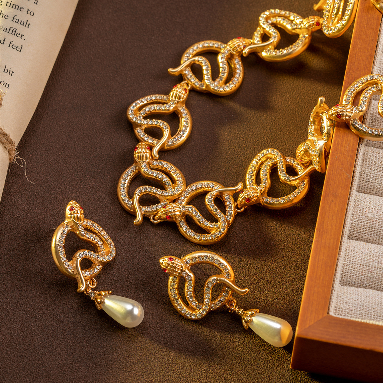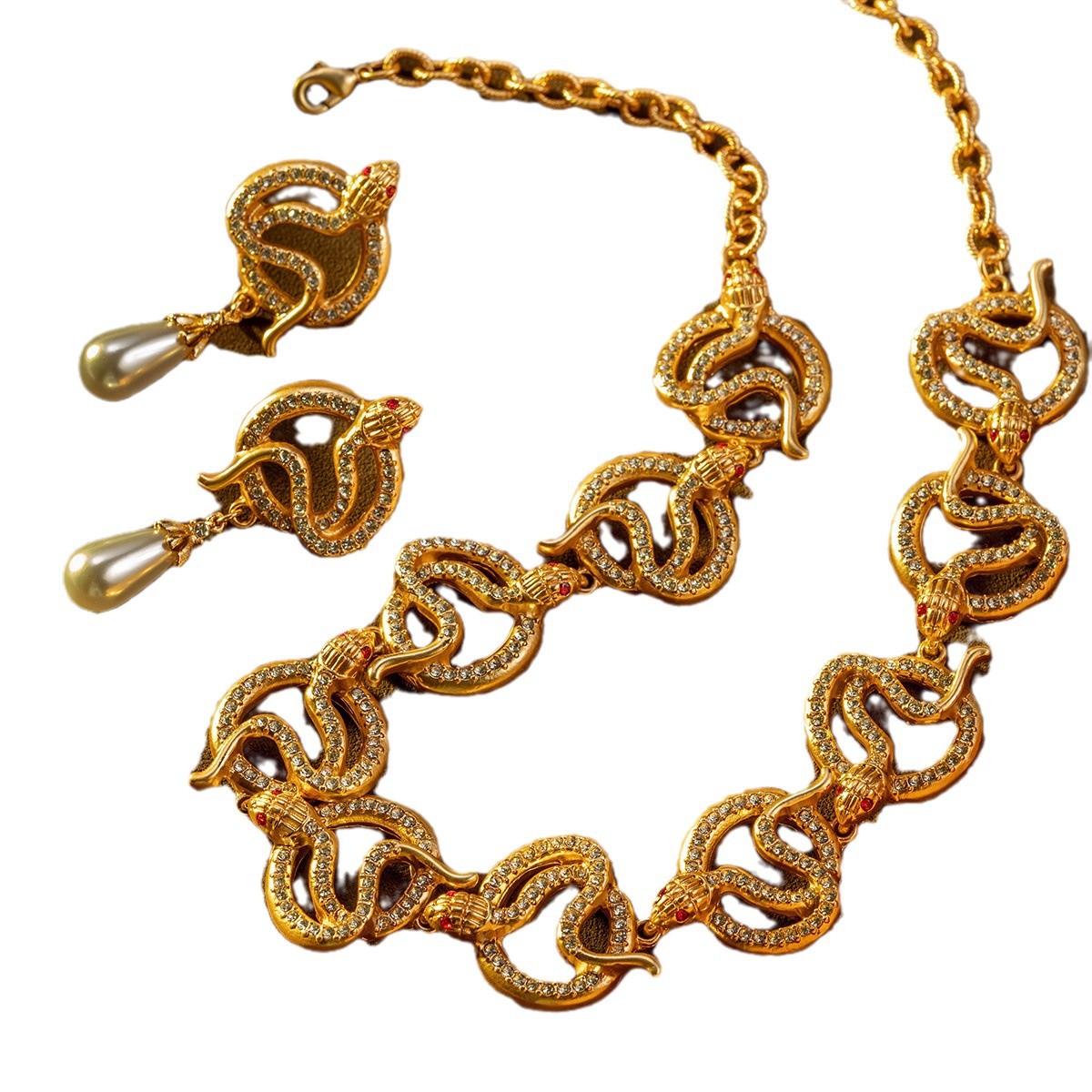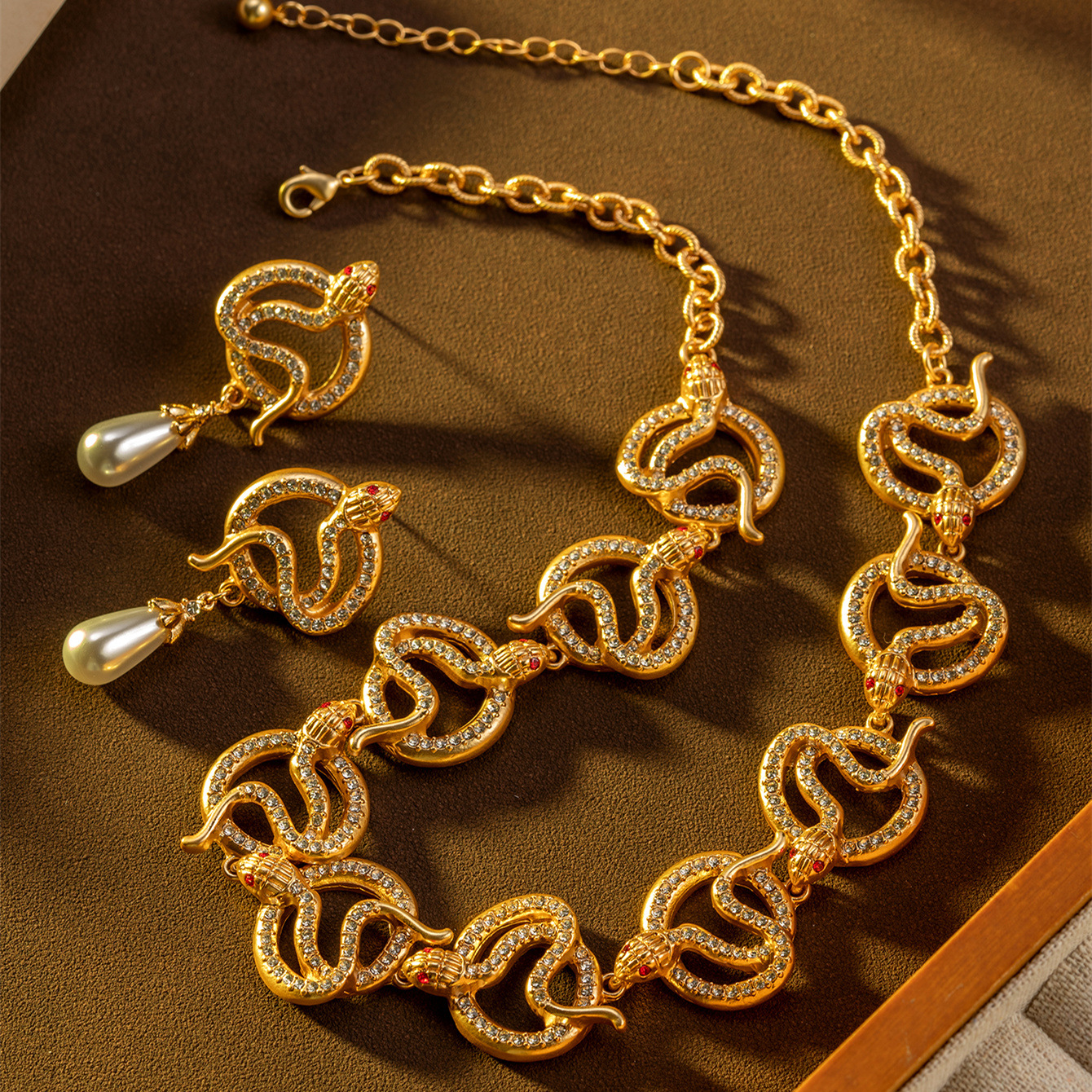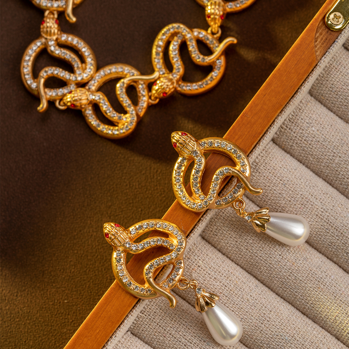 Middle Ancient European and American Retro Niche Design Sense Disc Snake Winding Snake Earrings Heavy Industry Pearl Full Diamond Necklace High Sense