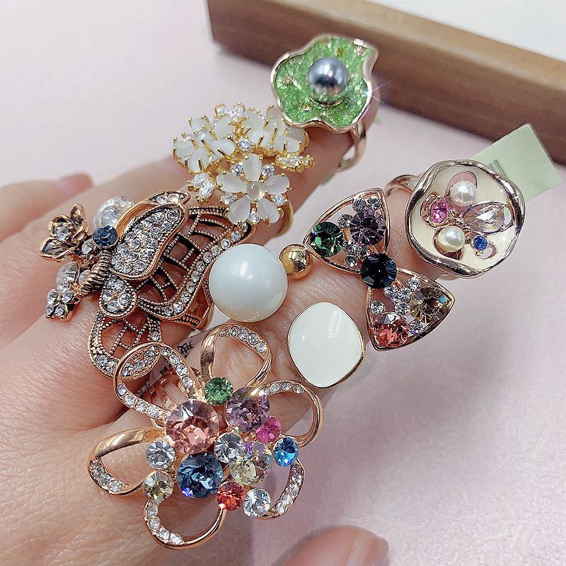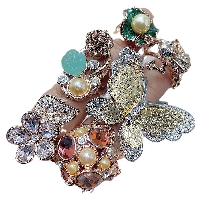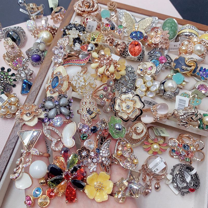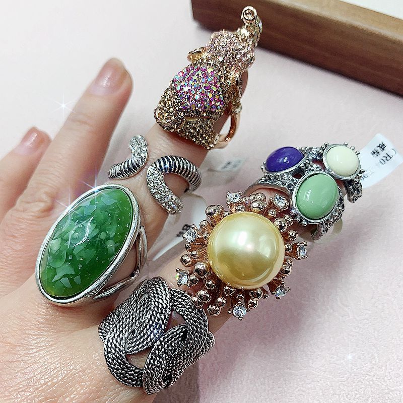 此款的戒指都是可莱玛品牌工厂货源,电镀保色效果好,风格甜美夸张复古个性戒指,工艺非常精美。戒指大小尺码都有,尺码混发。有镶钻石头米珠设计款,也有光面简约款,各种风格款式大小混发。