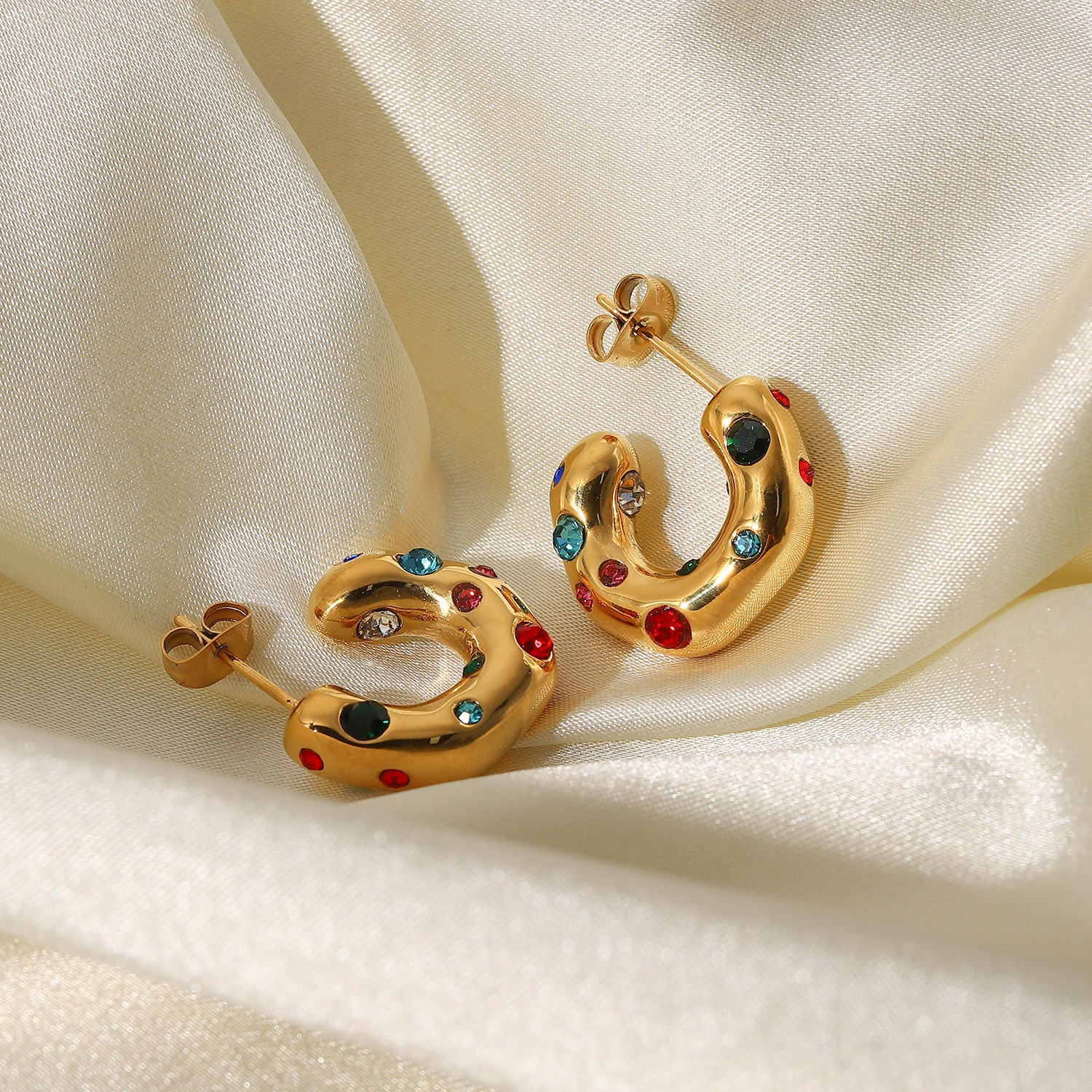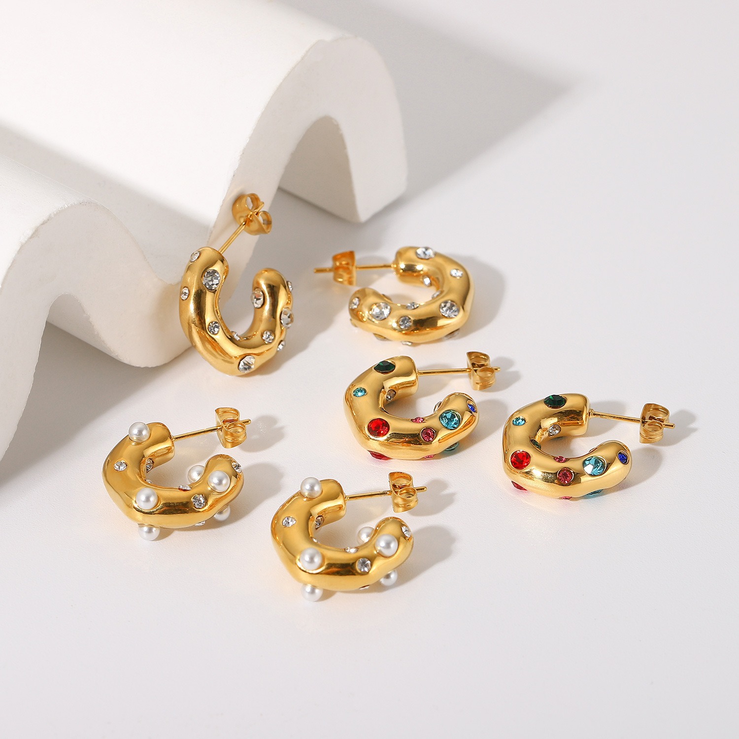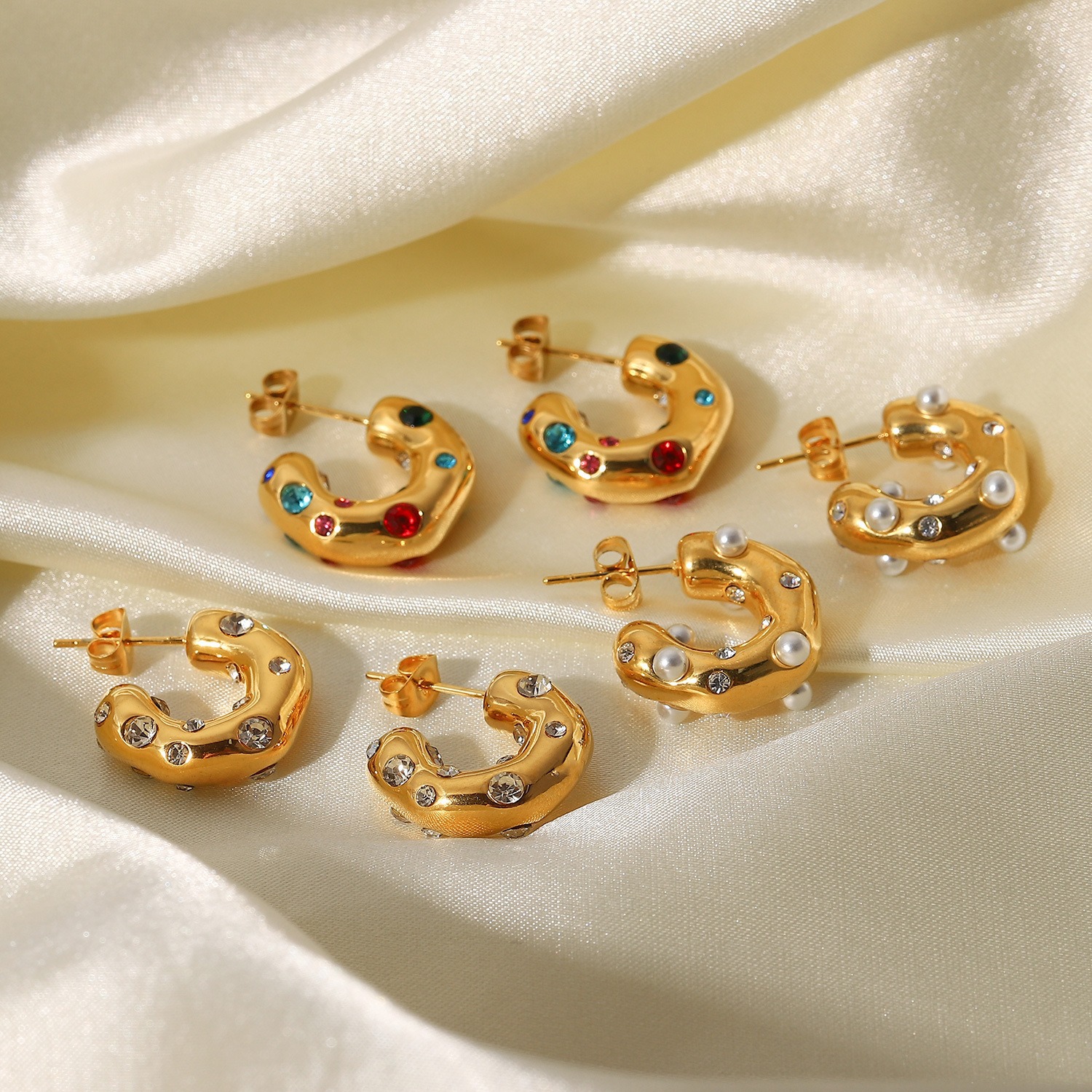 Cross-border European and American style special-shaped hammer pattern inlaid zircon C- shaped earring 18K gold-plated stainless steel earrings women's jewelry
