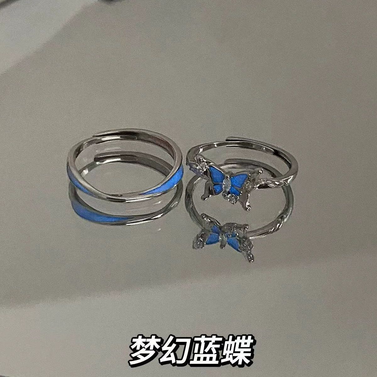 Niche High-level Fantasy Blue Butterfly Luminous Butterfly Couple's Ring Light Luxury All-match Luminous Atmosphere Ring for Men and Women