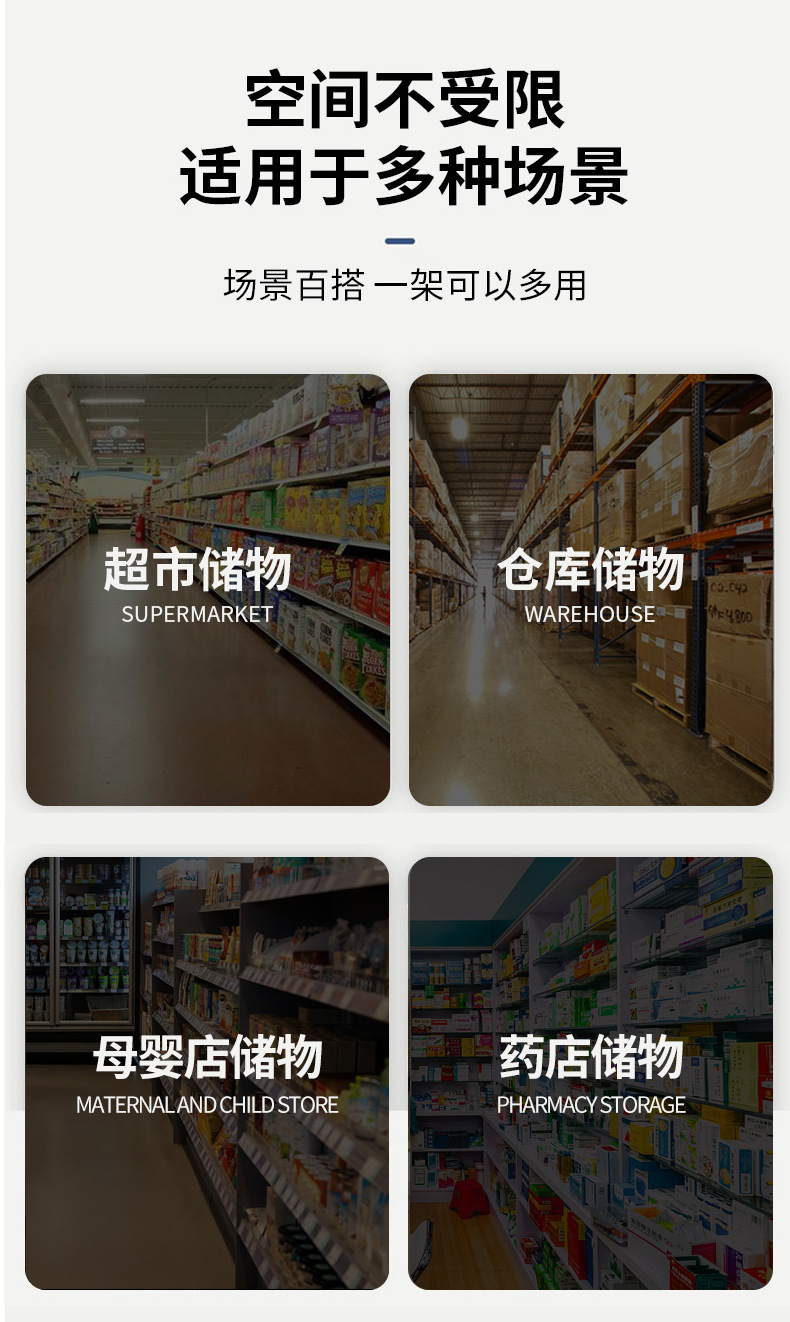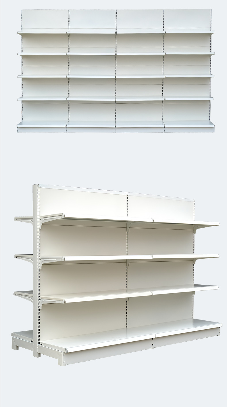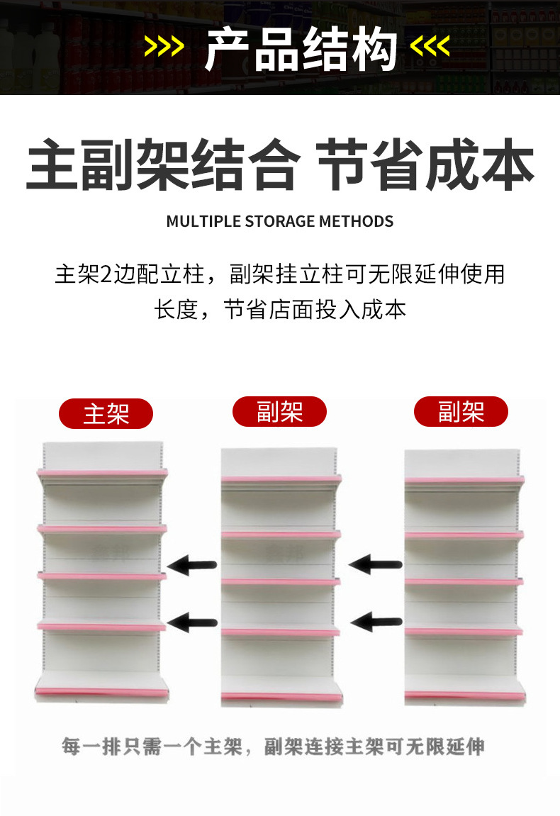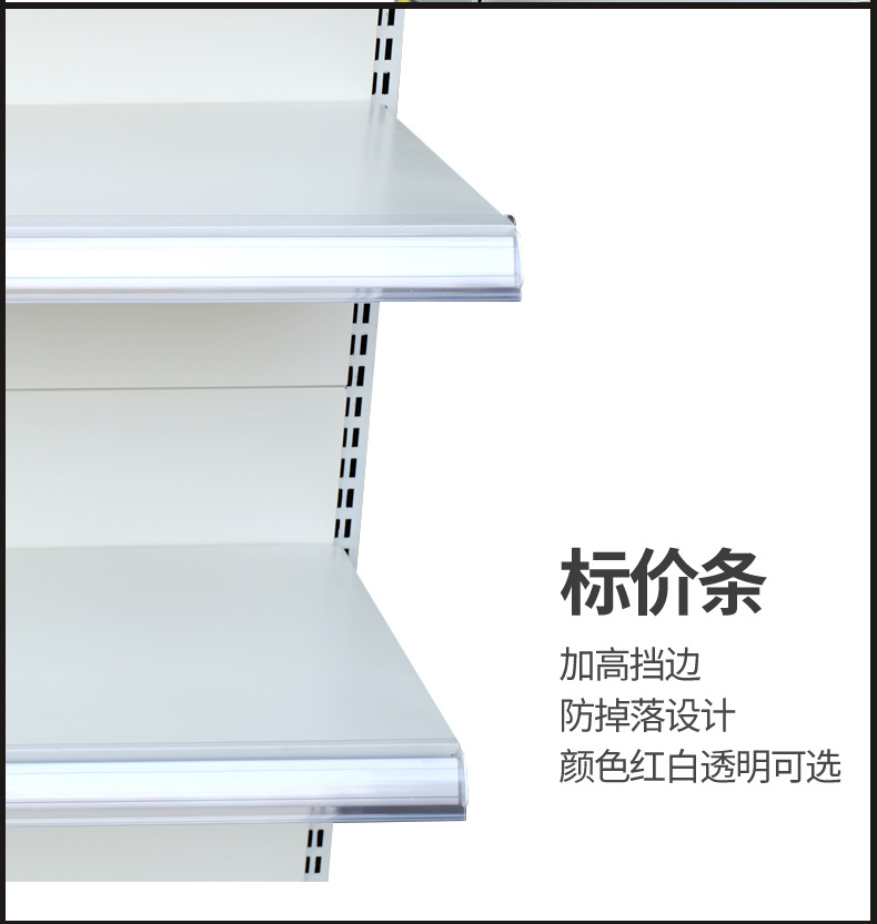 超市货架标准的是4层板,底下一层大层板(35cm),上面有3层小层板(30cm),如果感觉层数不够,可以加小层板 货架颜色:全白色,标条有白色、红色、绿色,不备注默认红色  货架主架和副架可以无限连接(本公司所有报价都是四组一连的价位,就是您买四组货架用5根立柱),单面加一点配件可以变成双面,双面减一点配件可以变成单面,灵活应用,让您的空间利用到致,随心百变!省外运费请咨询在线客服