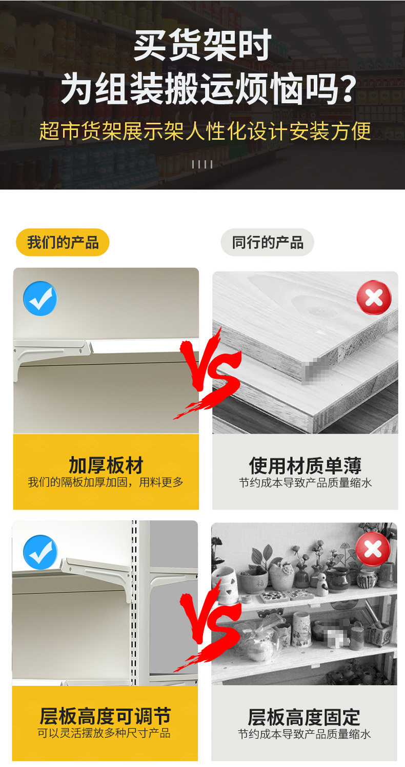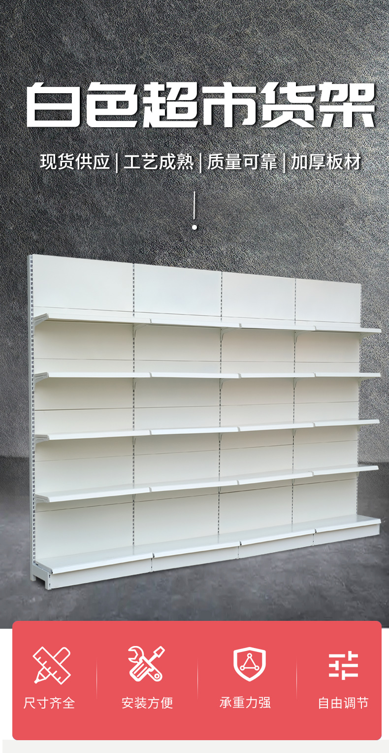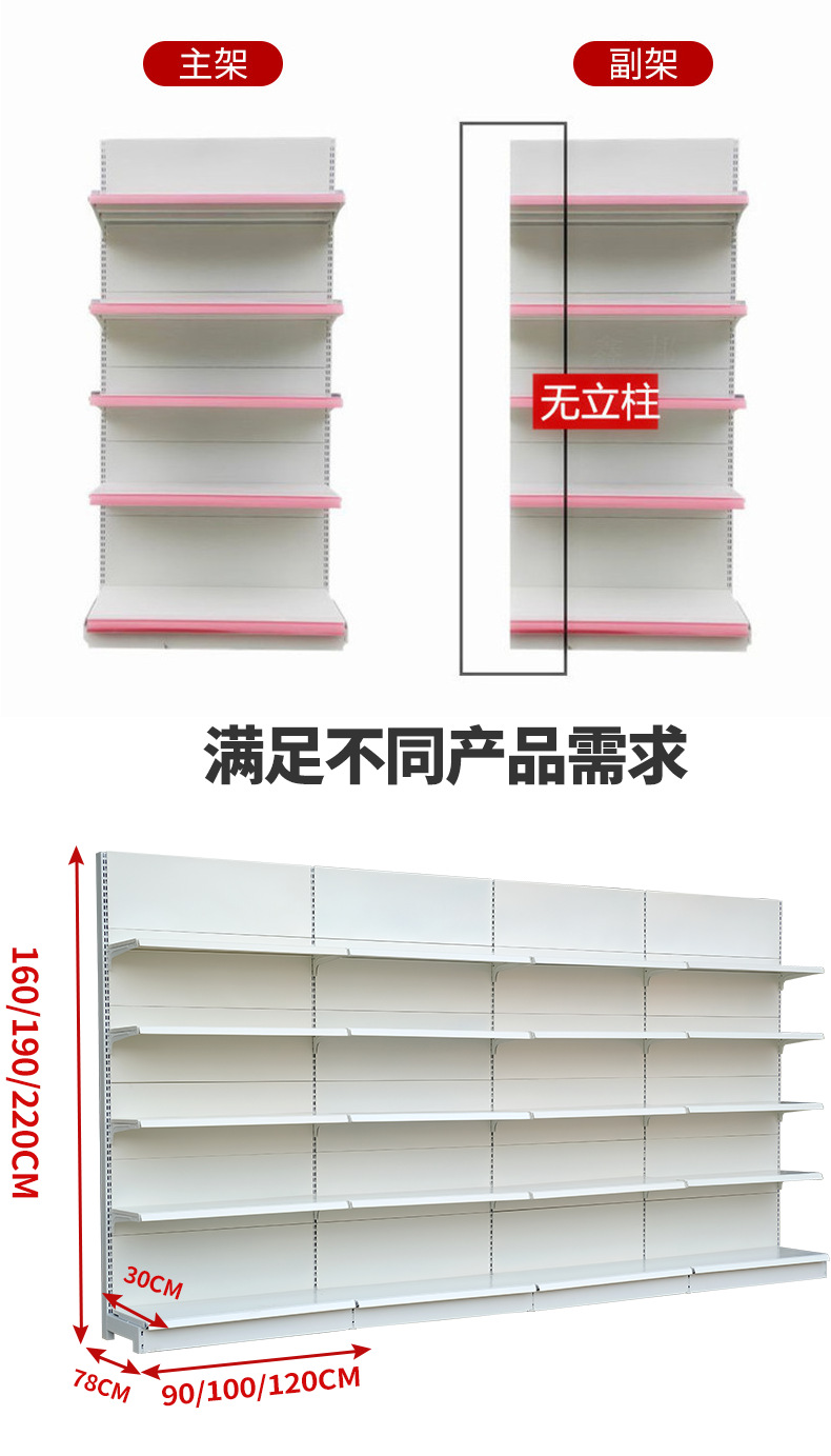 超市货架标准的是4层板,底下一层大层板(35cm),上面有3层小层板(30cm),如果感觉层数不够,可以加小层板 货架颜色:全白色,标条有白色、红色、绿色,不备注默认红色  货架主架和副架可以无限连接(本公司所有报价都是四组一连的价位,就是您买四组货架用5根立柱),单面加一点配件可以变成双面,双面减一点配件可以变成单面,灵活应用,让您的空间利用到致,随心百变!省外运费请咨询