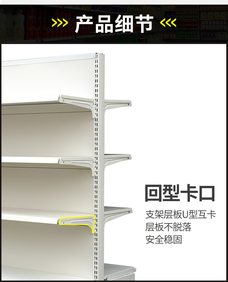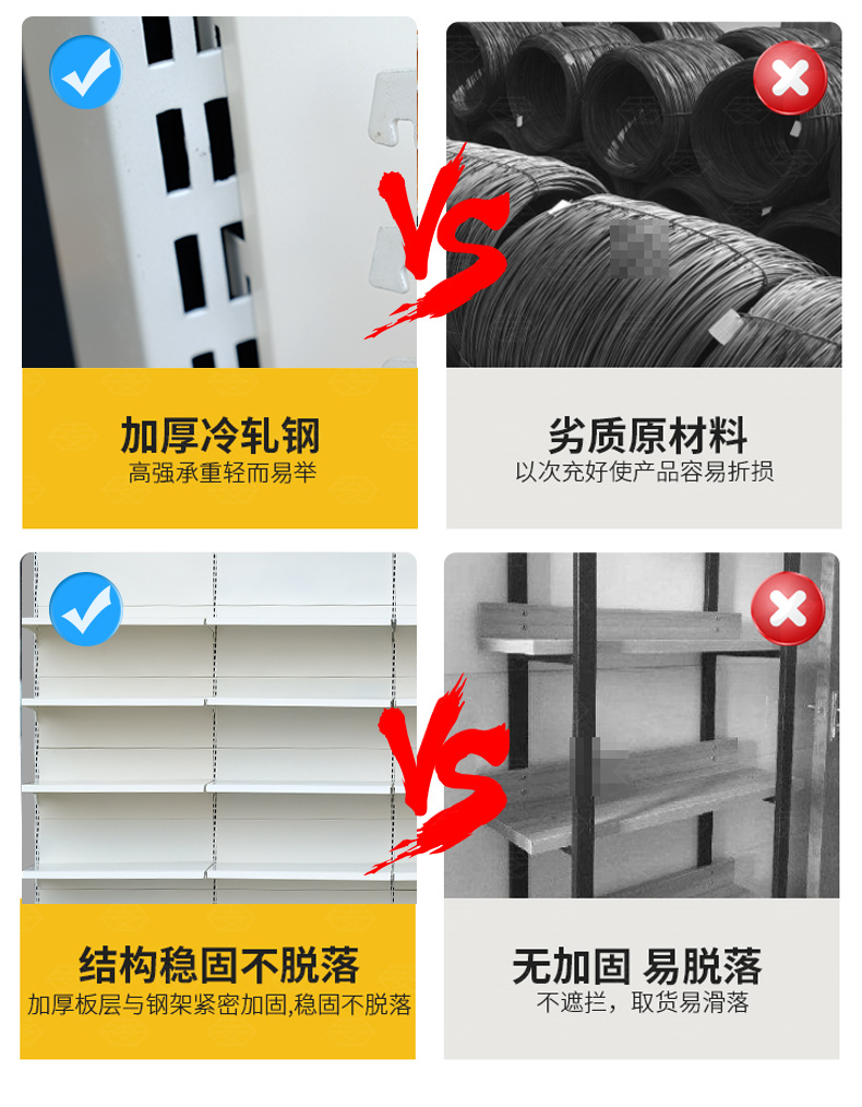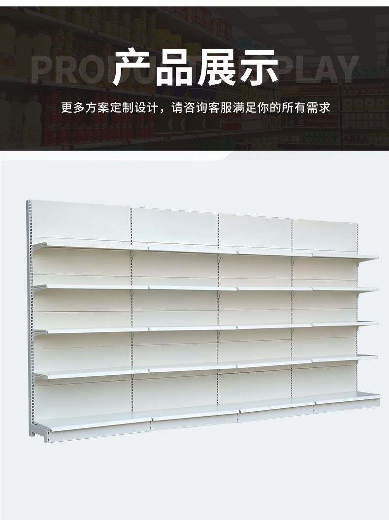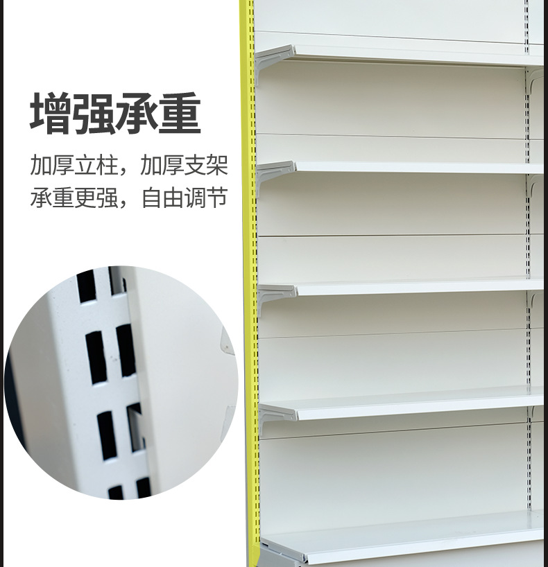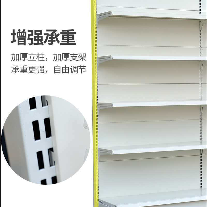 超市货架标准的是4层板,底下一层大层板(35cm),上面有3层小层板(30cm),如果感觉层数不够,可以加小层板 货架颜色:全白色,标条有白色、红色、绿色,不备注默认红色  货架主架和副架可以无限连接(本公司所有报价都是四组一连的价位,就是您买四组货架用5根立柱),单面加一点配件可以变成双面,双面减一点配件可以变成单面,灵活应用,让您的空间利用到致,随心百变!省外运费请咨询