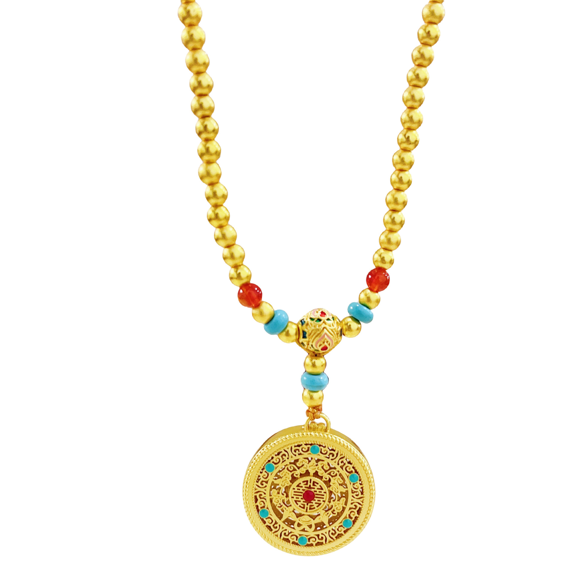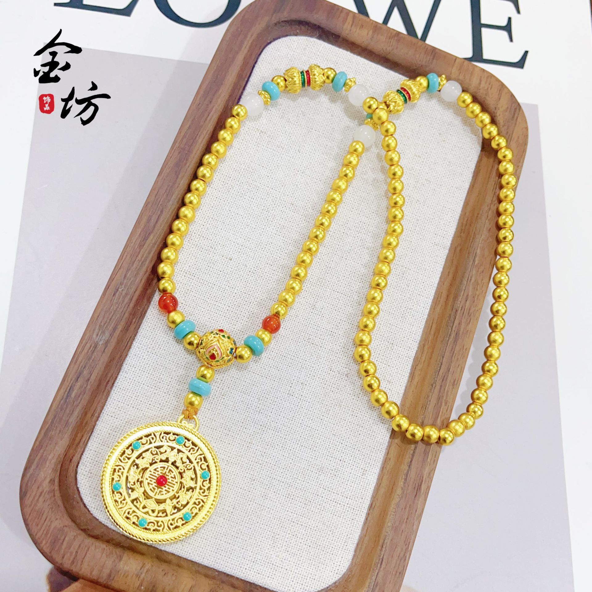 New Chinese style ancient style sand gold green pine agate beaded Wufu perfect hollow silk disc necklace sweater chain