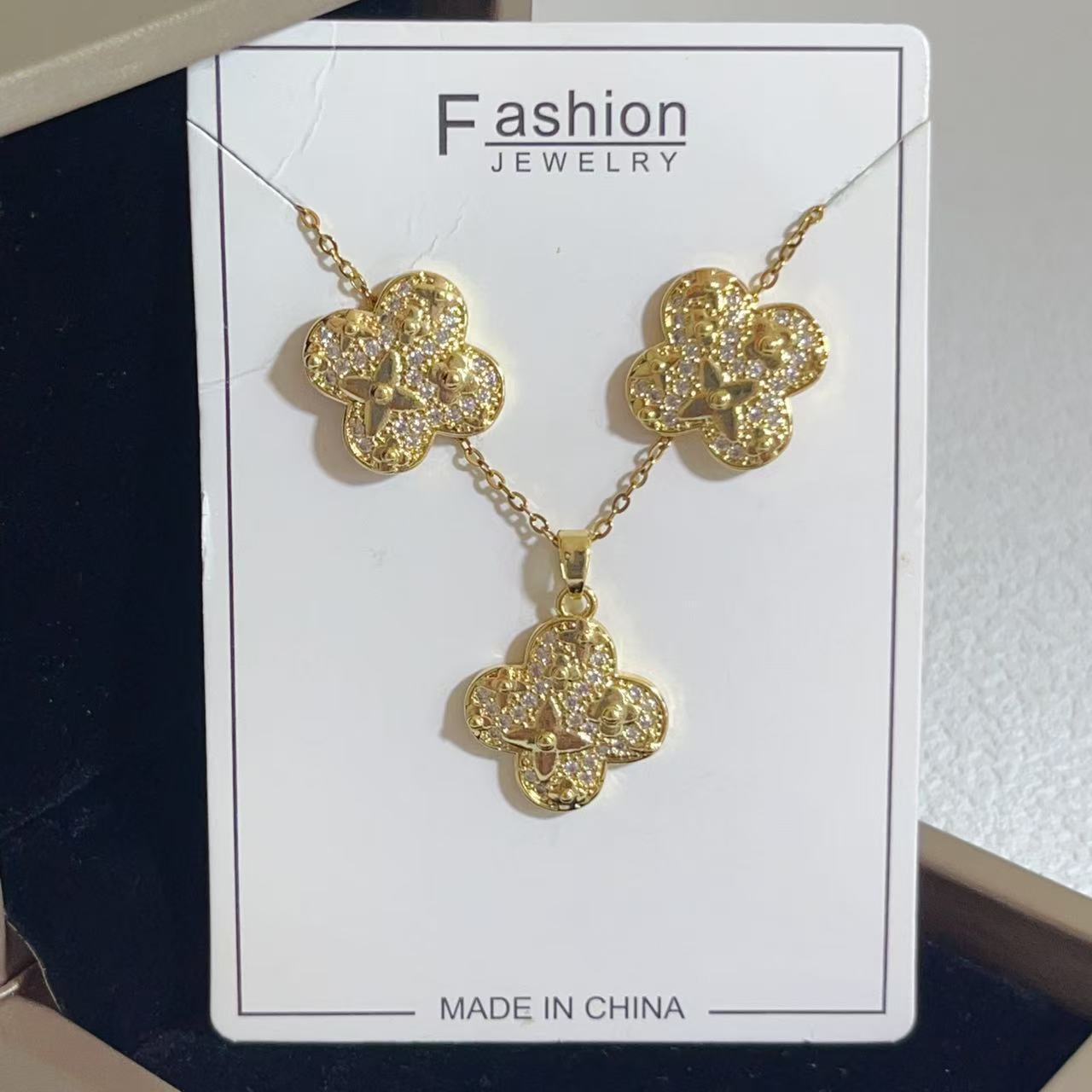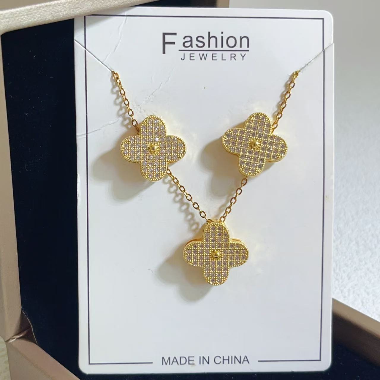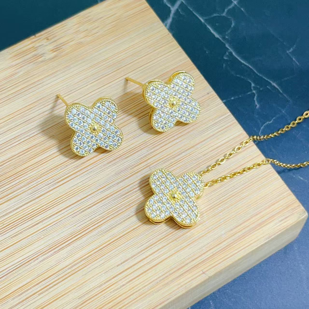 European and American copper-plated real gold micro-inlaid zircon four-leaf clover earrings earrings necklace two-piece set