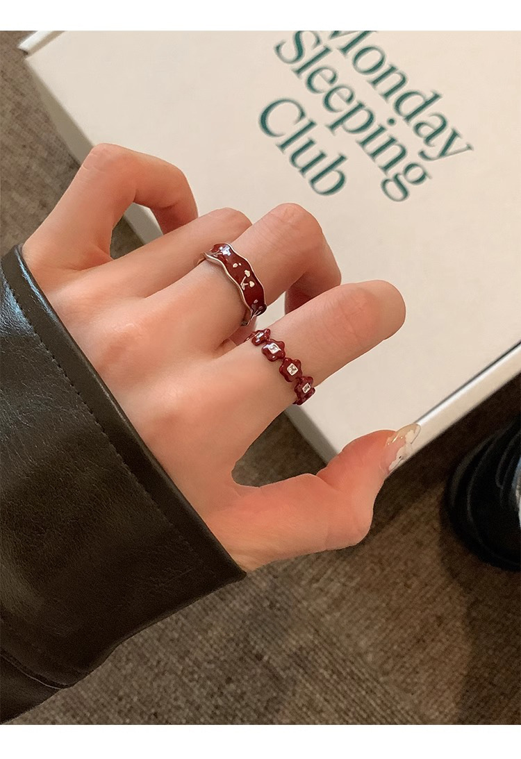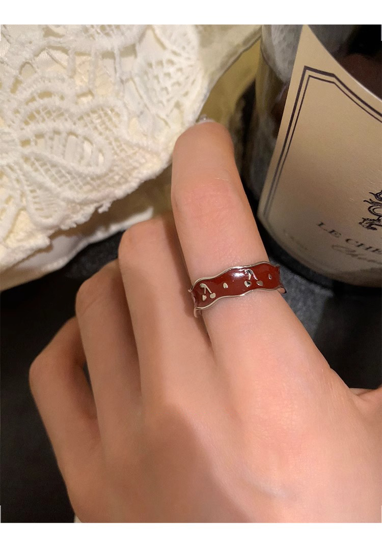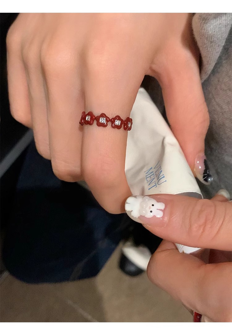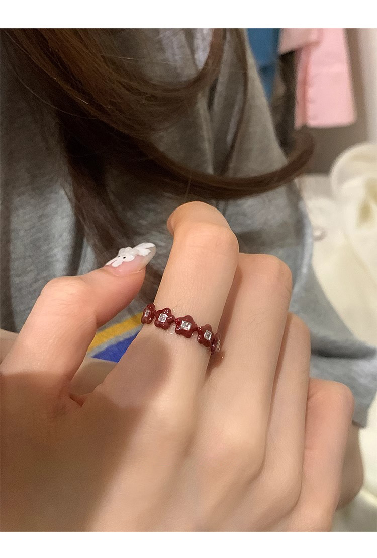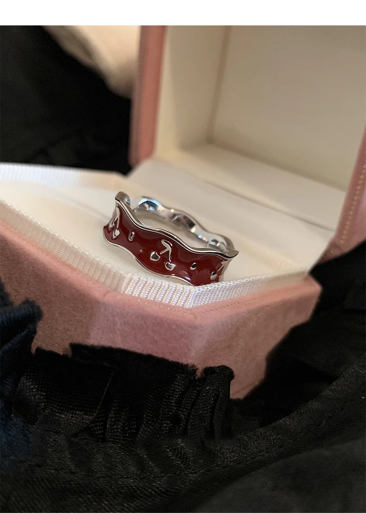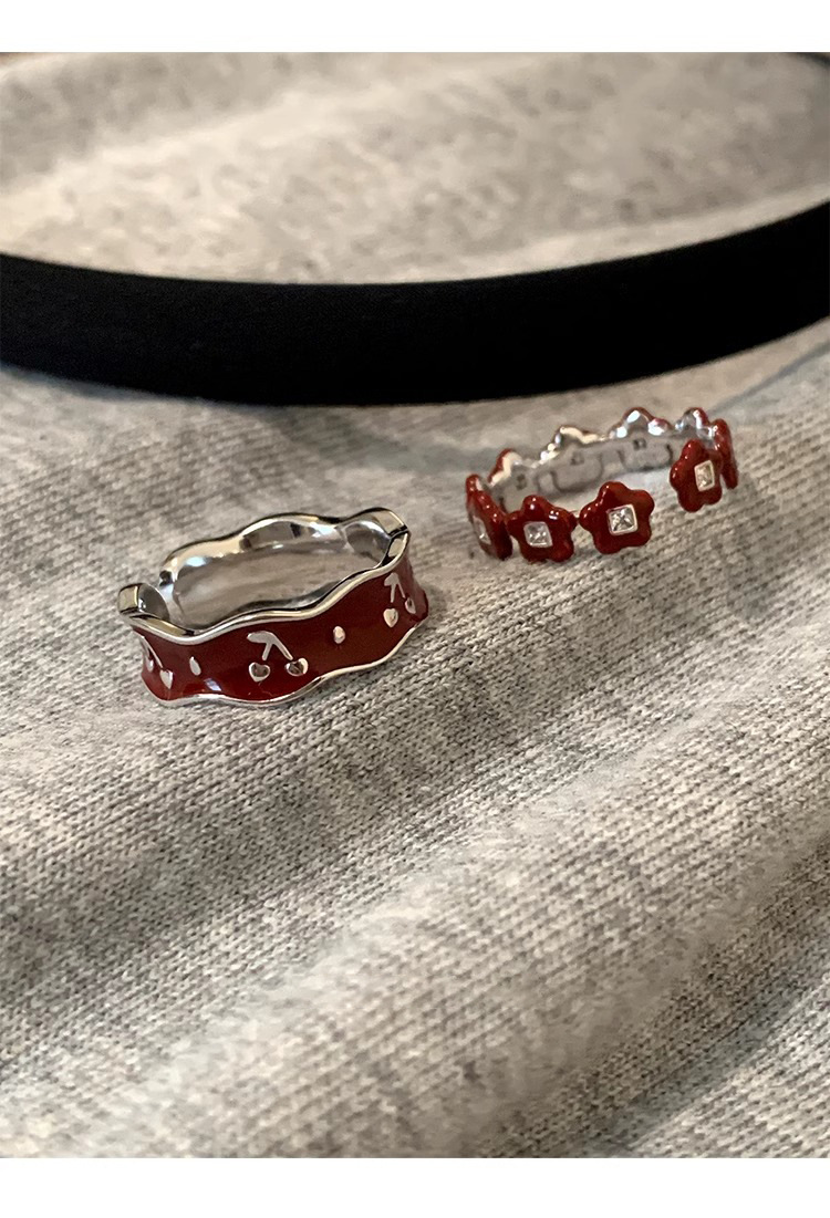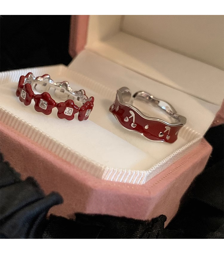 Japanese and Korean Style Retro Red Drop Glaze Flower Cherry Ring Women's Retro Niche Design Sense Ring Finger Ring Women's Ring