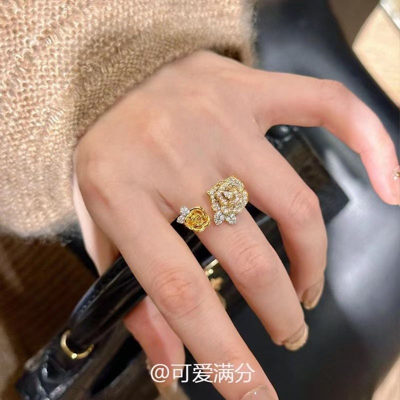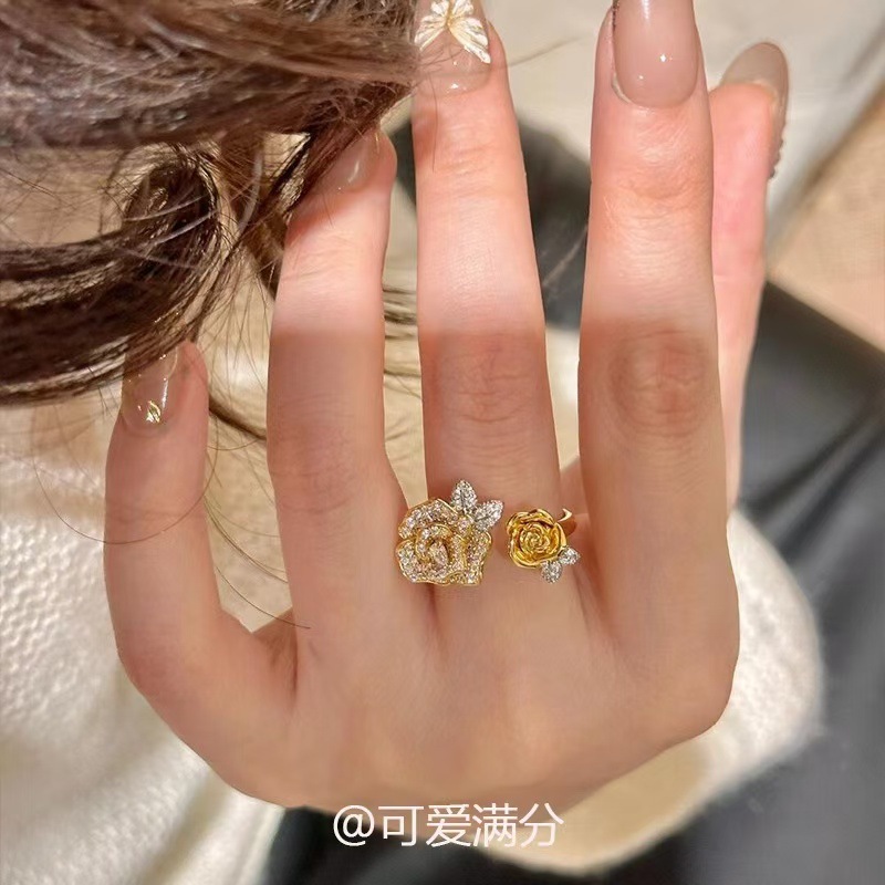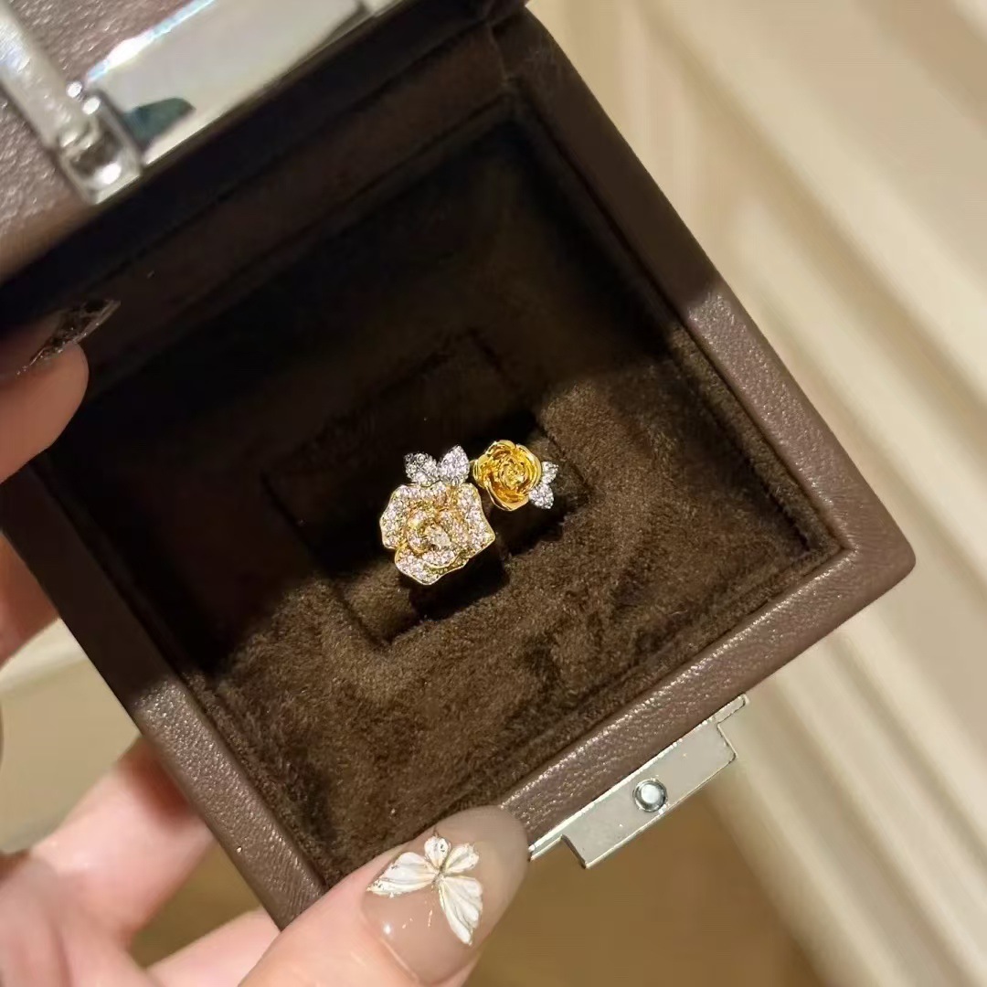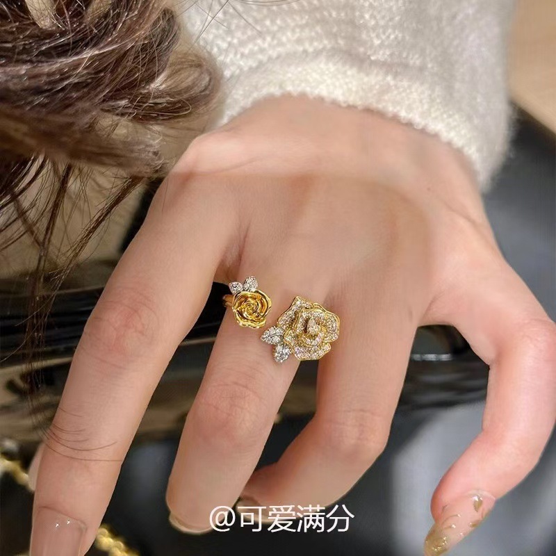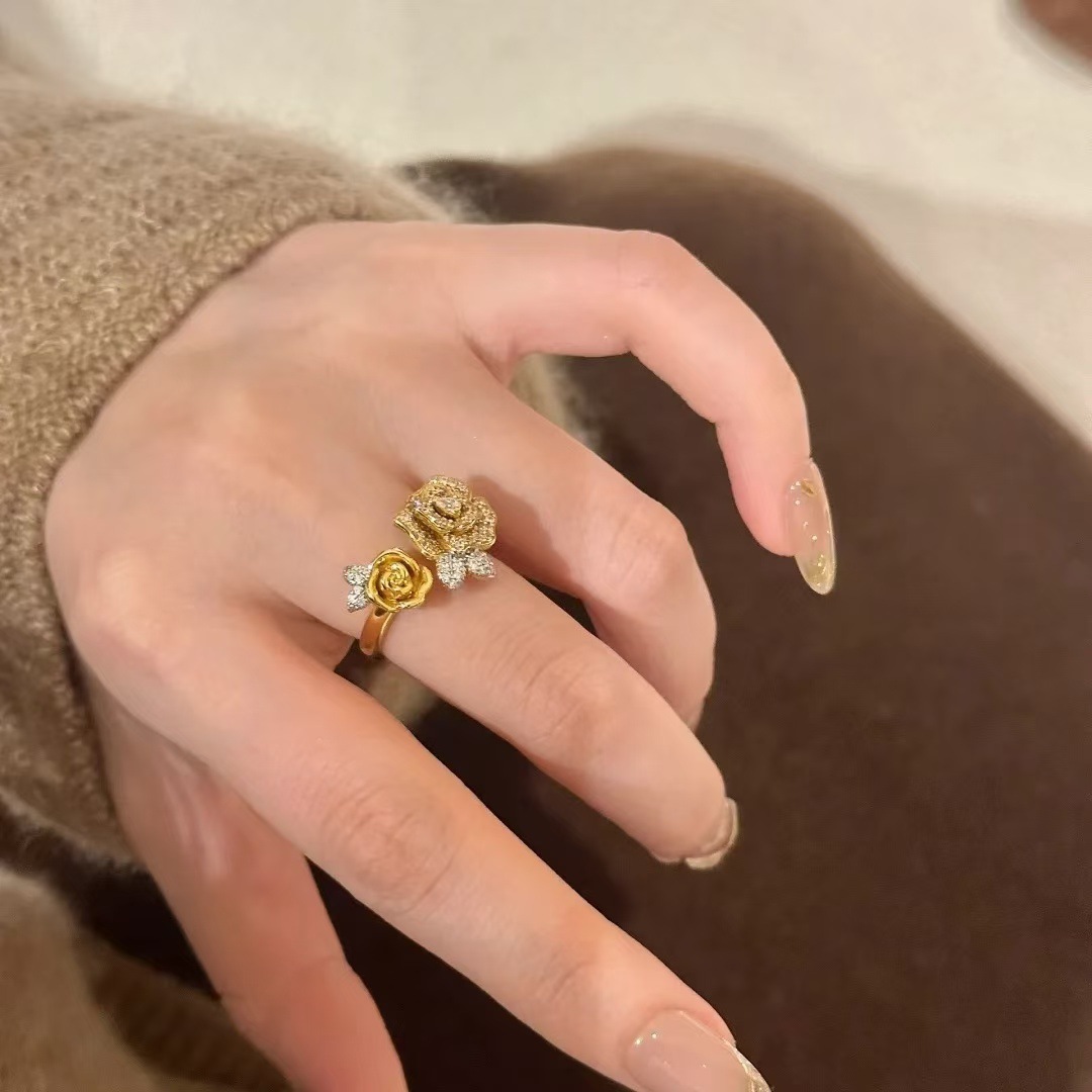Gold Color Diamond Twin Rose Ring Women's Niche Fashion Light Luxury High-end Maillard Style Exquisite Finger Ring