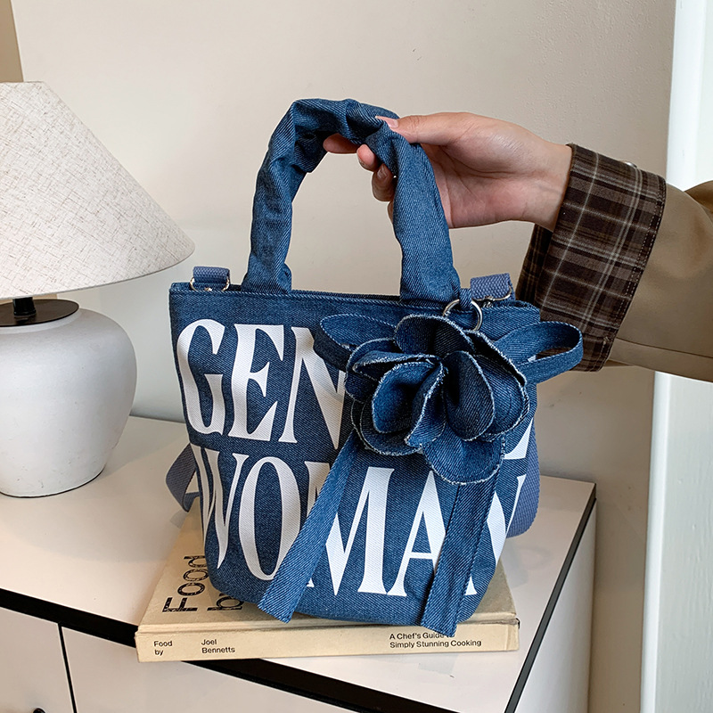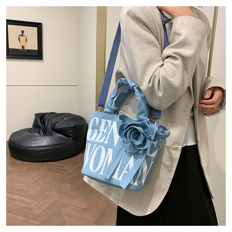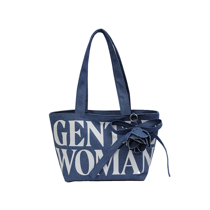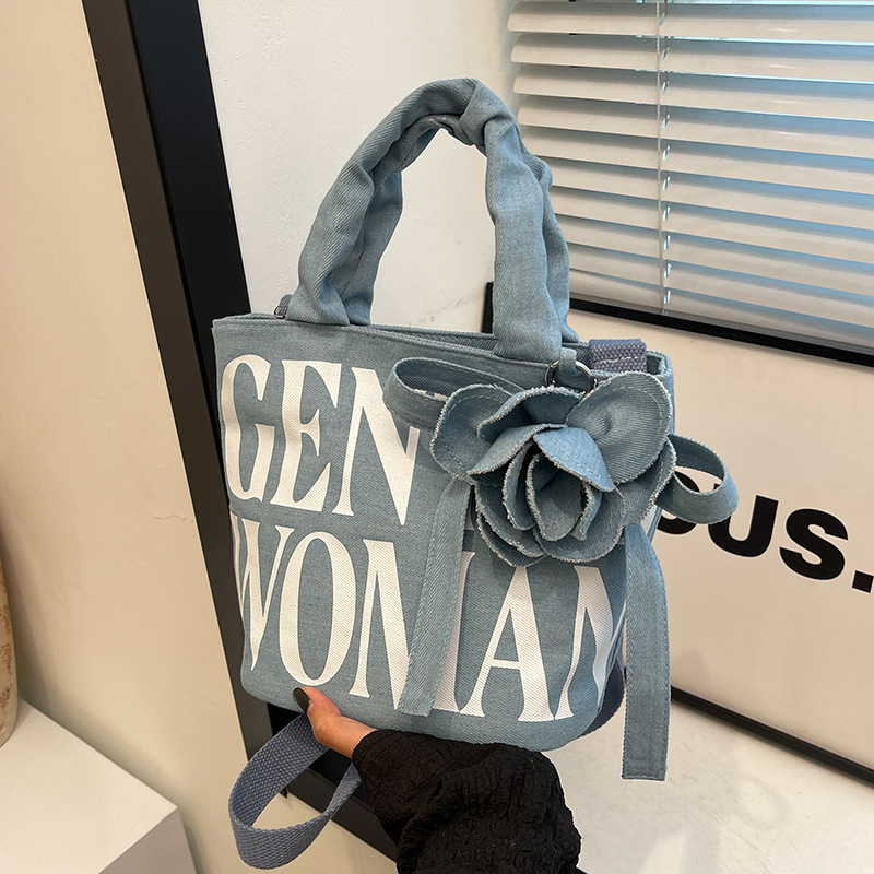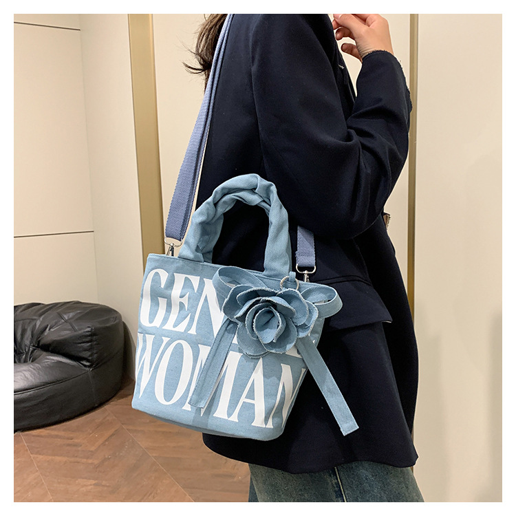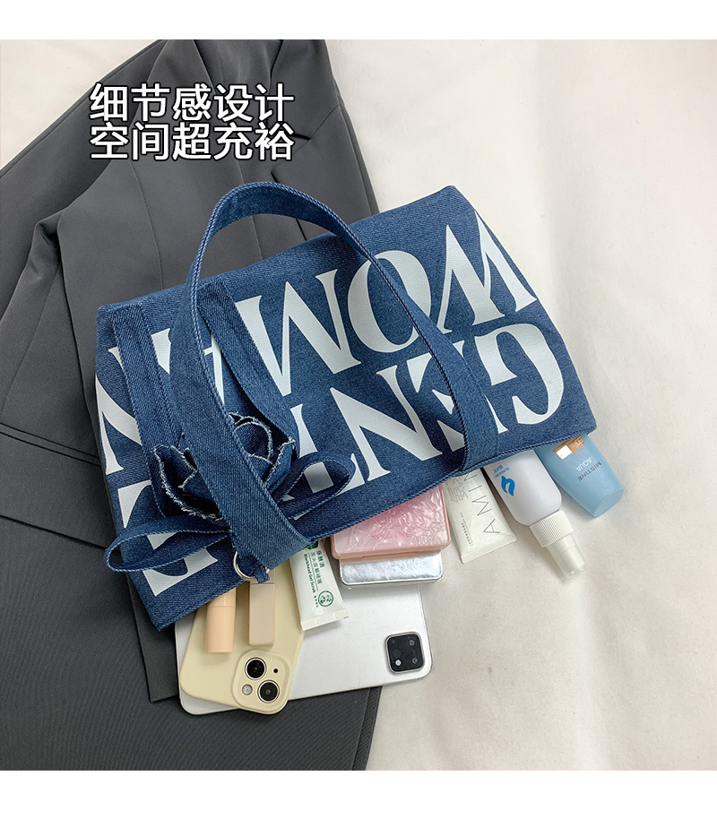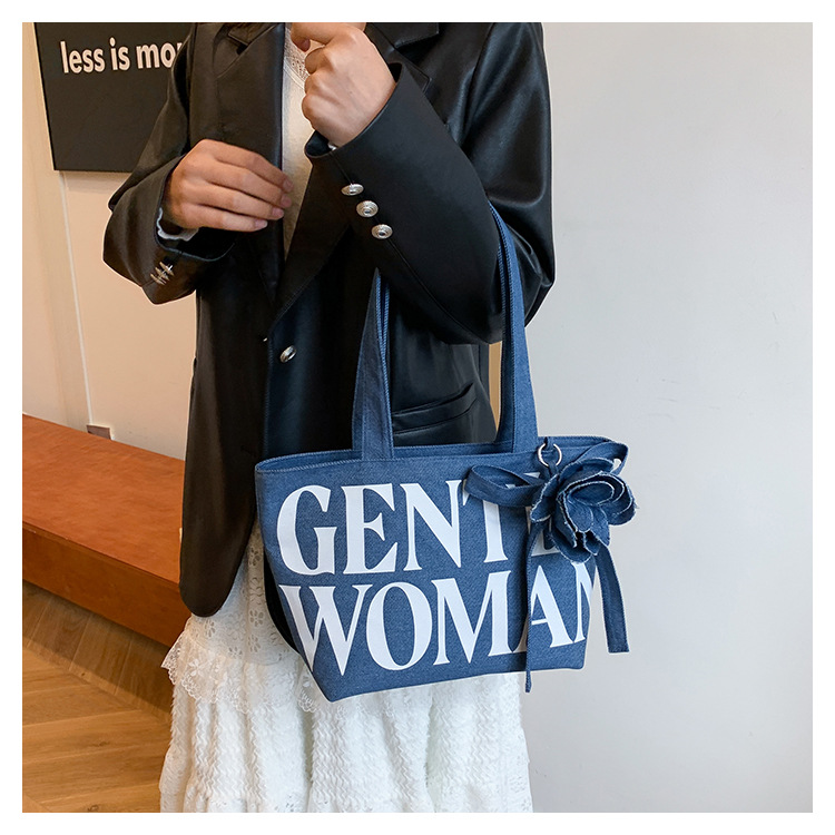 Large Capacity Denim Canvas Bag Women's GW Rose Letter Tote Bag New Style Outgoing Portable Shoulder Shopping Bag Trendy
