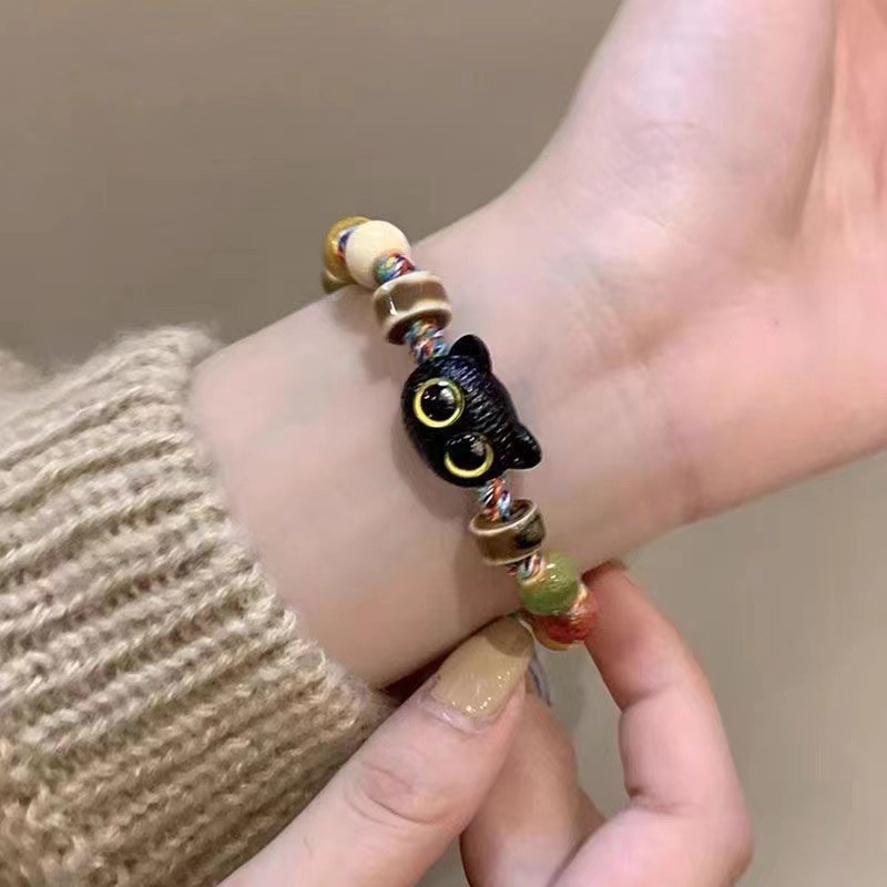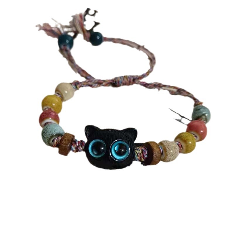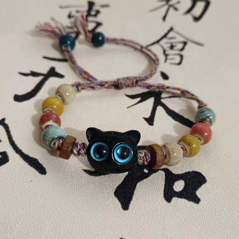 New Chinese Ceramic Colorful Woven Rope Beaded Cat Bracelet Female Niche Design Vintage Accessories Kitten Cat Claw
