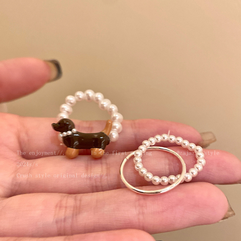 South Korea New Cartoon Cute Dachshund Pearl Ring Niche Design Distinctive All-match Children's Fit Ring Food Finger Ring