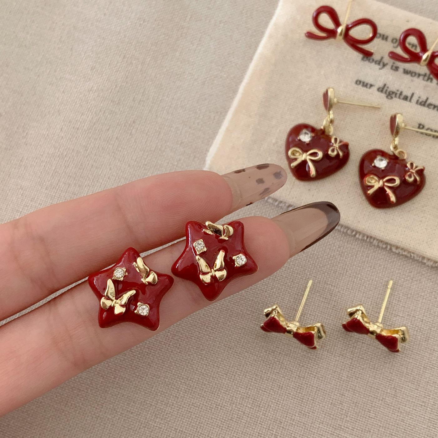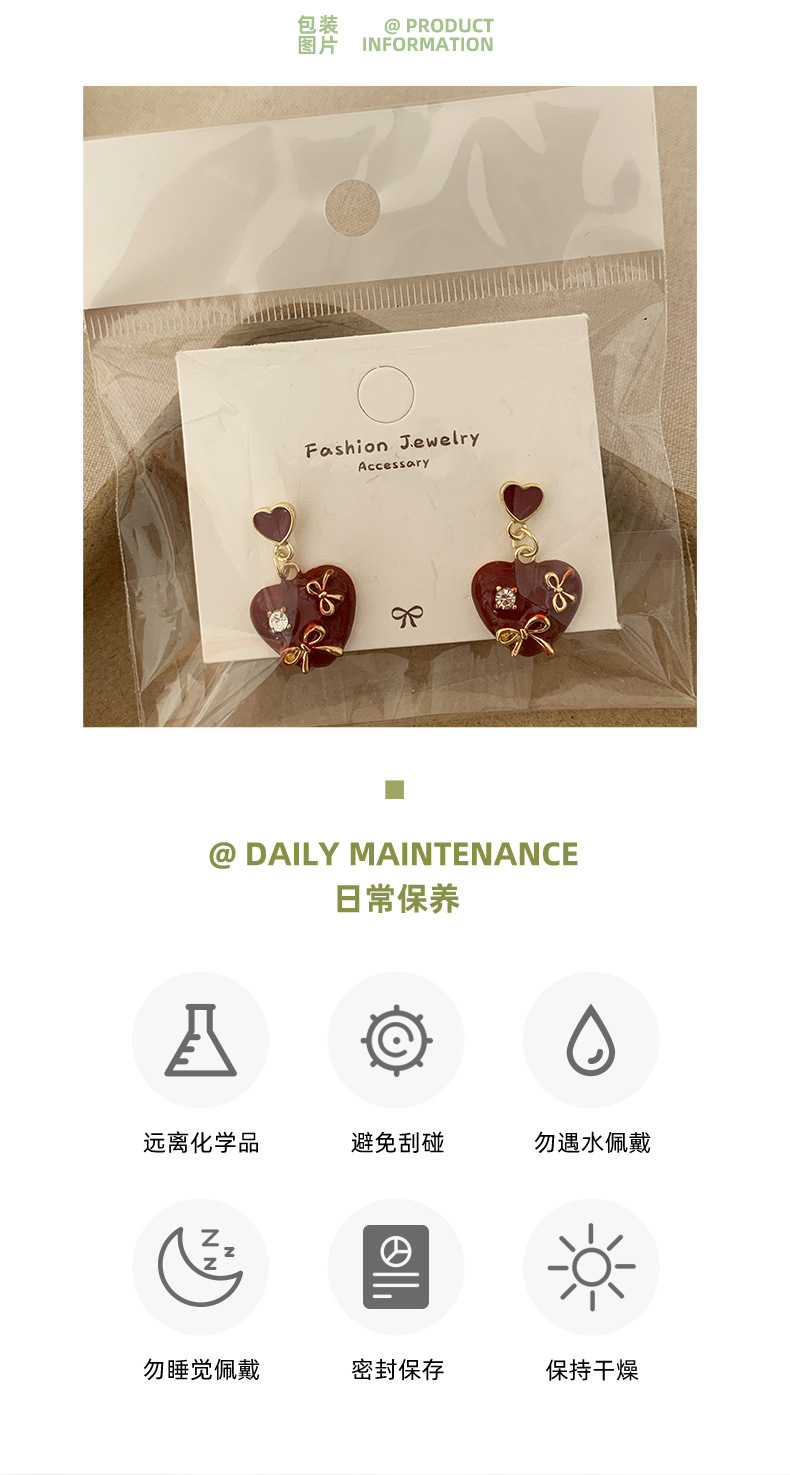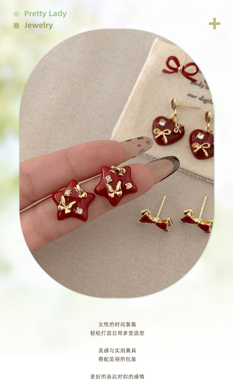 Autumn and Winter Ancora Red Heart-Shaped Earrings with Diamonds and Enamel, Silver Needle, Niche Exquisite Design, Festive Earrings for Women