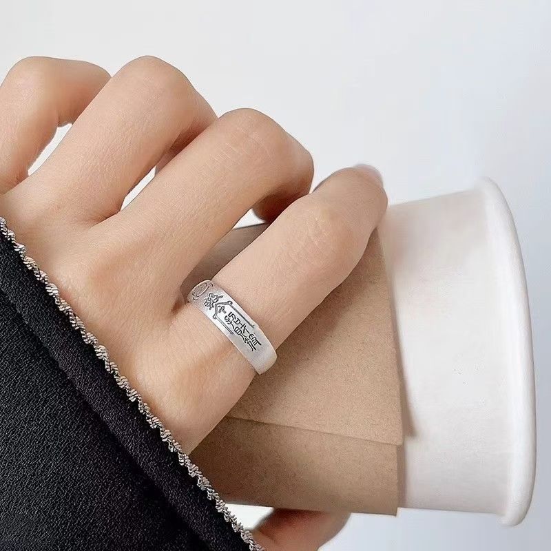 Luckful Cat Ring Retro Chinese Style Ping An Fu Finger Ring Frosted Wire-drawing Open Ring for Men and Women