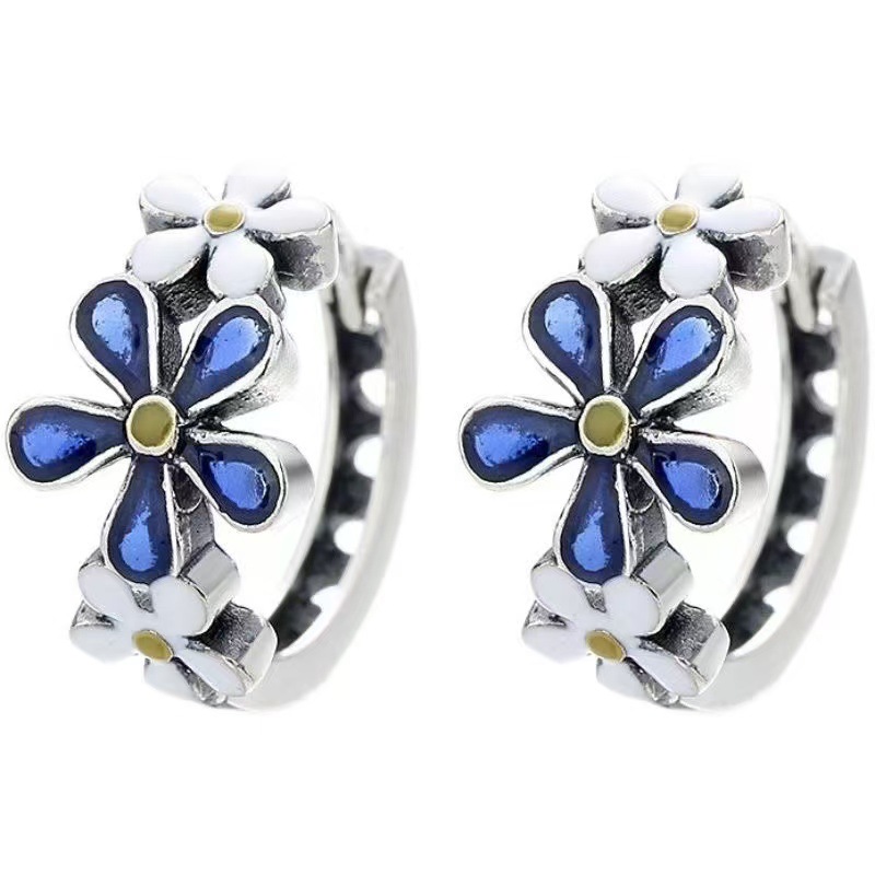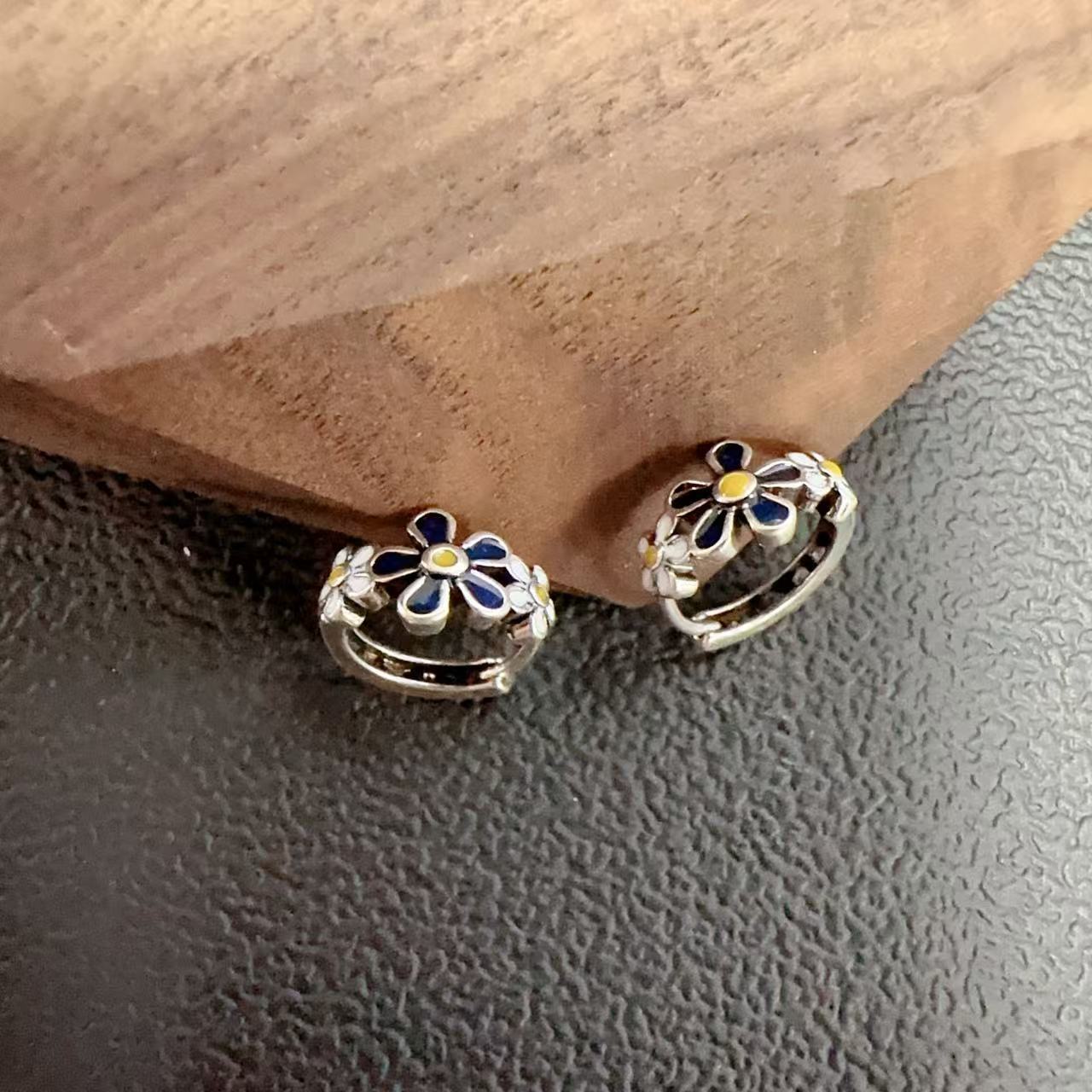 Vintage Thai Silver Flower Earrings Women's Old Blue Flower Tide Ear Ring Niche Design Light Luxury Elegant Elegant Ear Jewelry