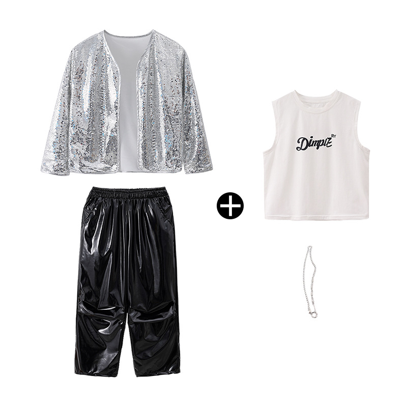 Color: 506 Silver Sequin Top 166 White Sleeveless T 418 Black Leather Pants Necklace