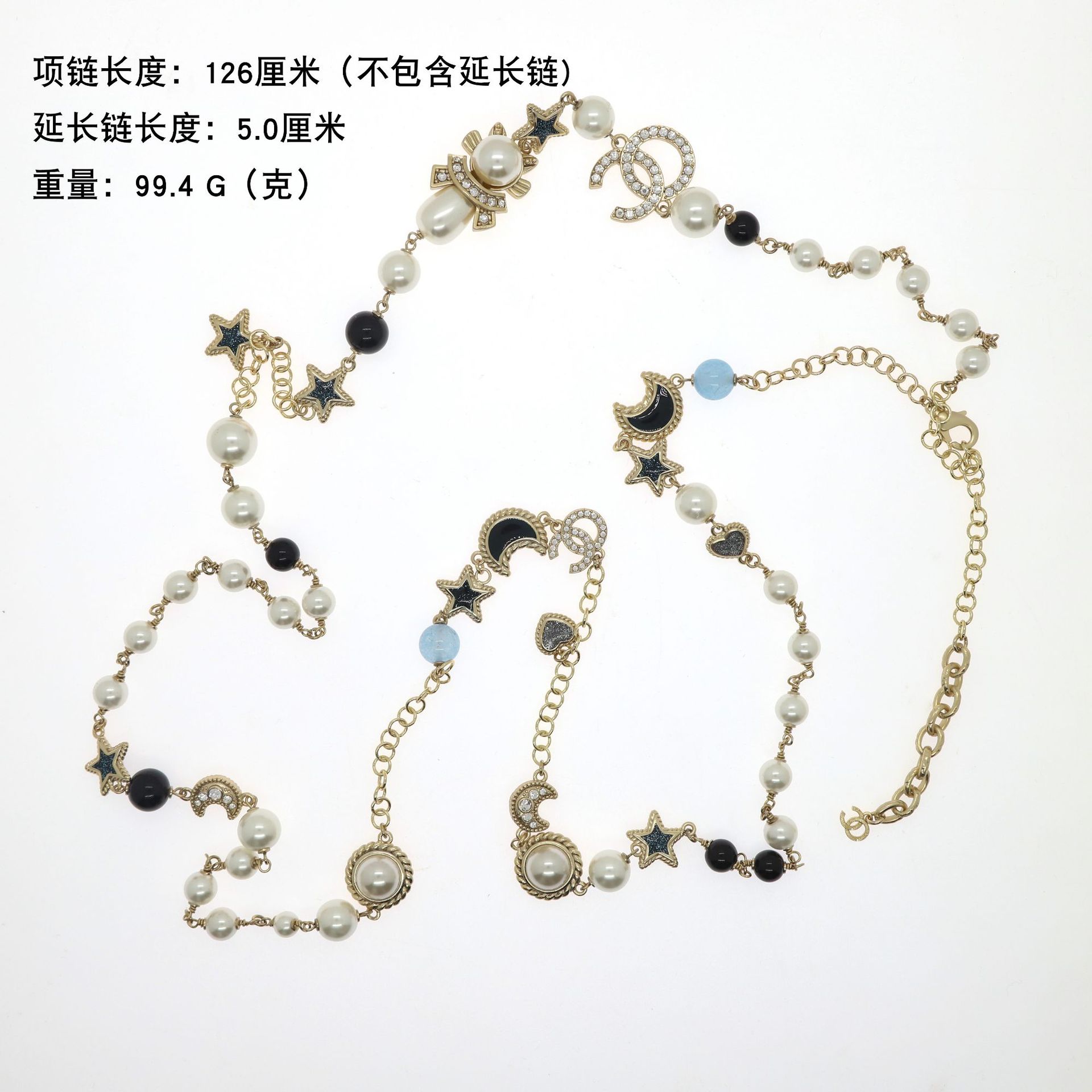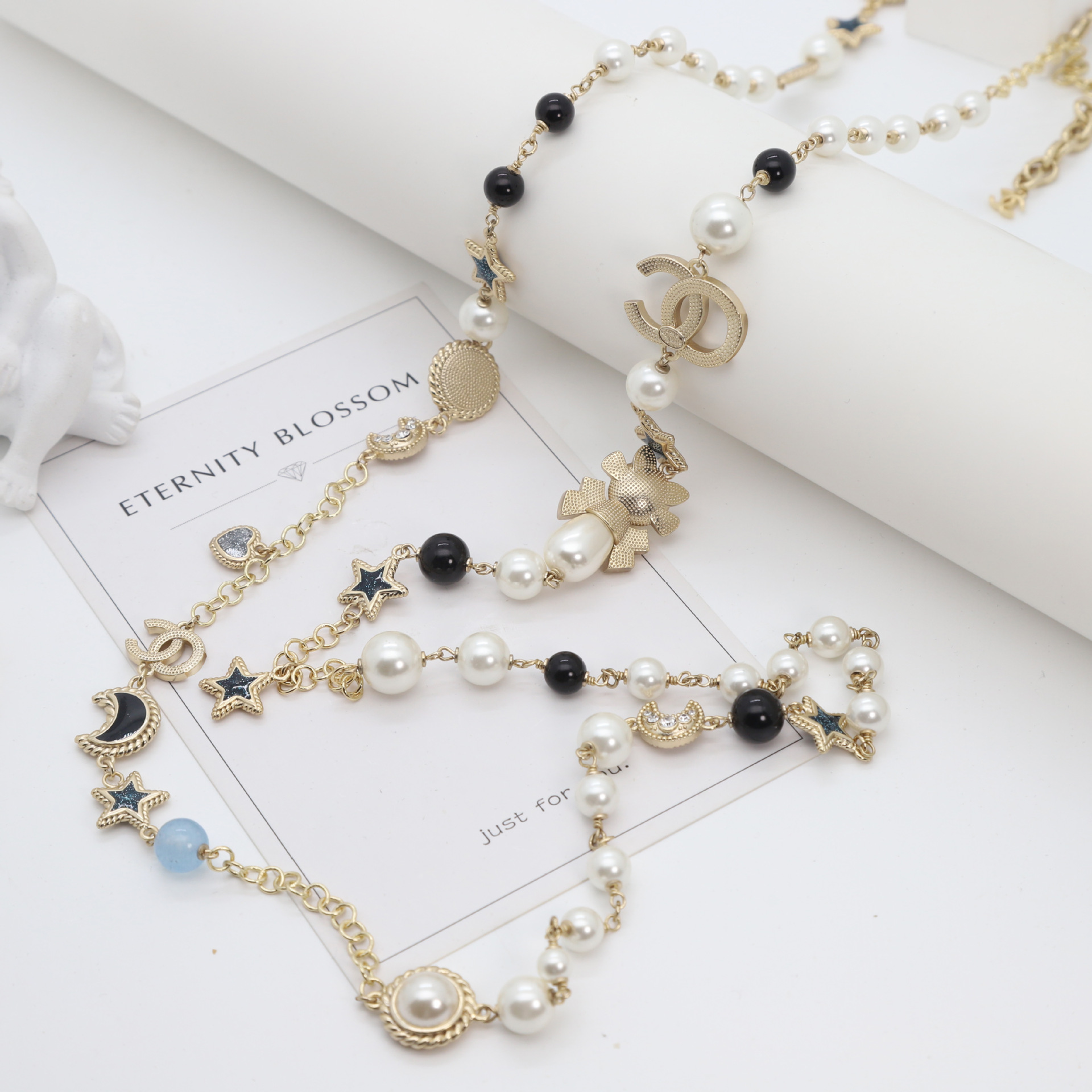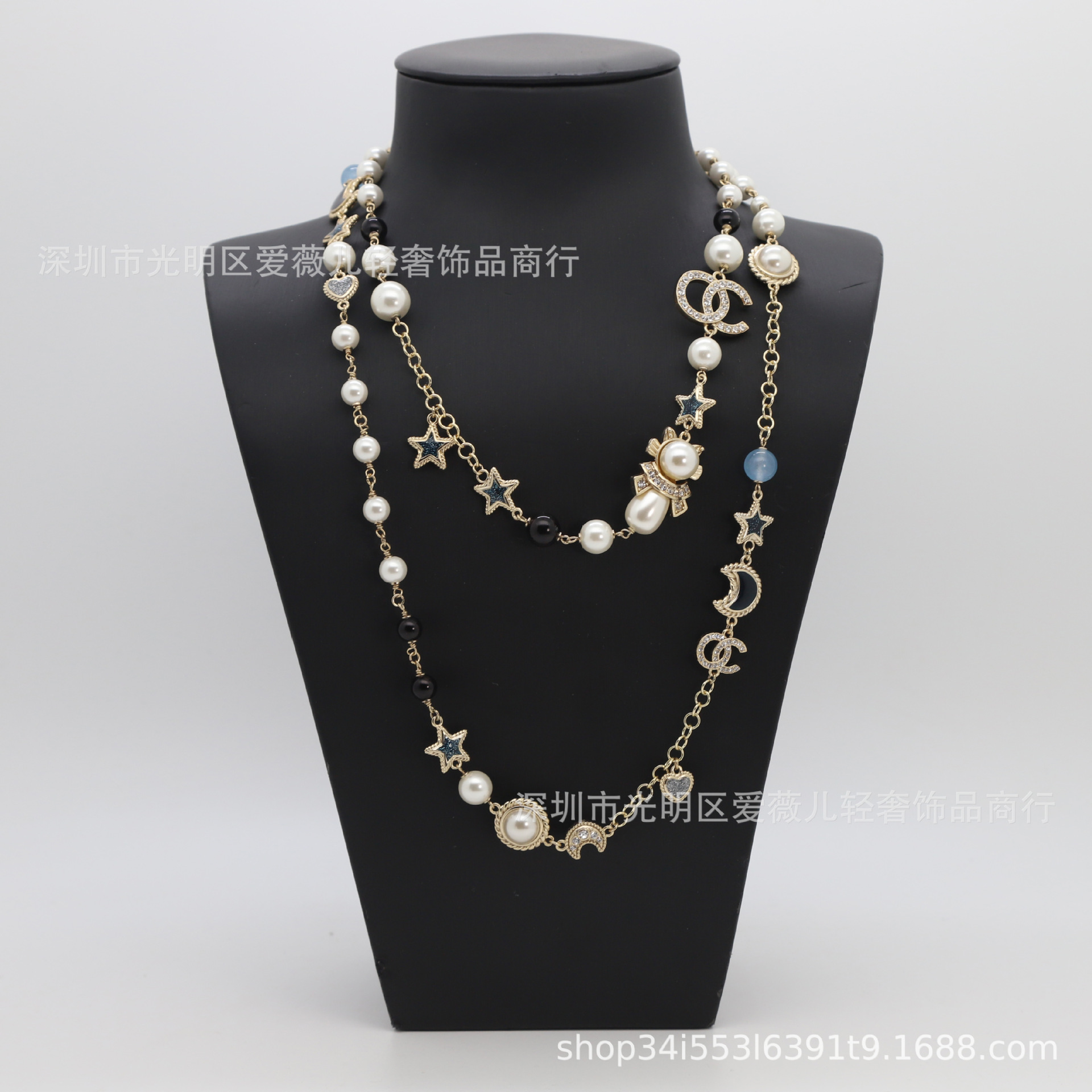 Fashionable and High-End Starry Sky Element Colorfulful Enamel Pearl Double C Rhinestone Small Fragrant Women's Double Layer Sweater Chain Necklace