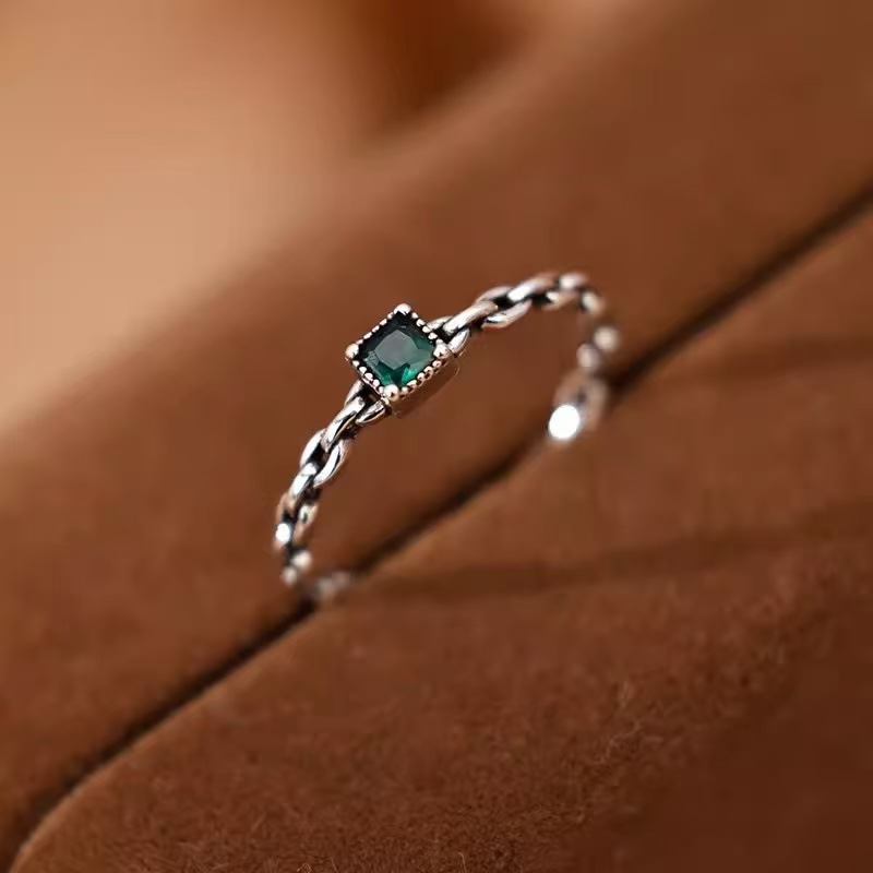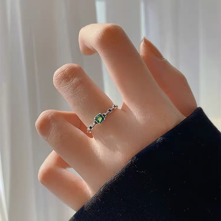 925 Silver Plated Small Square Sugar Ring Female Niche Design Fashion Green Retro Adjustable Square Index Finger Ring