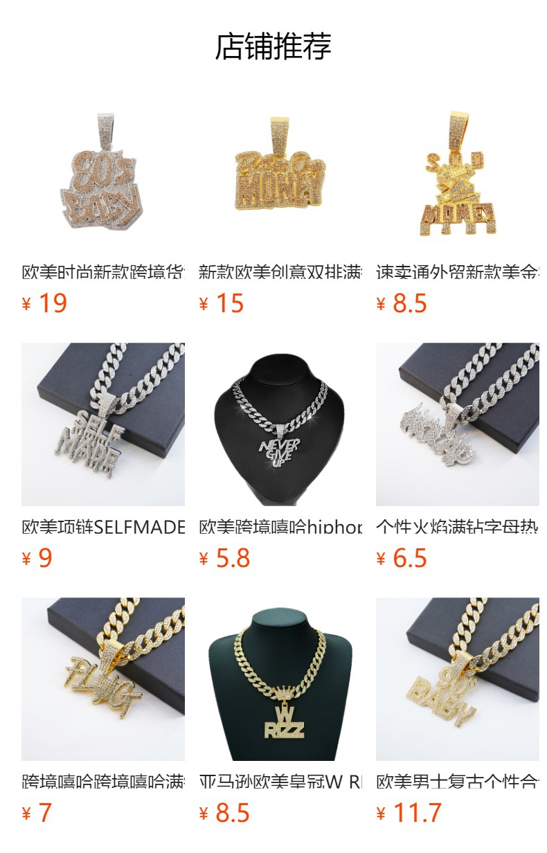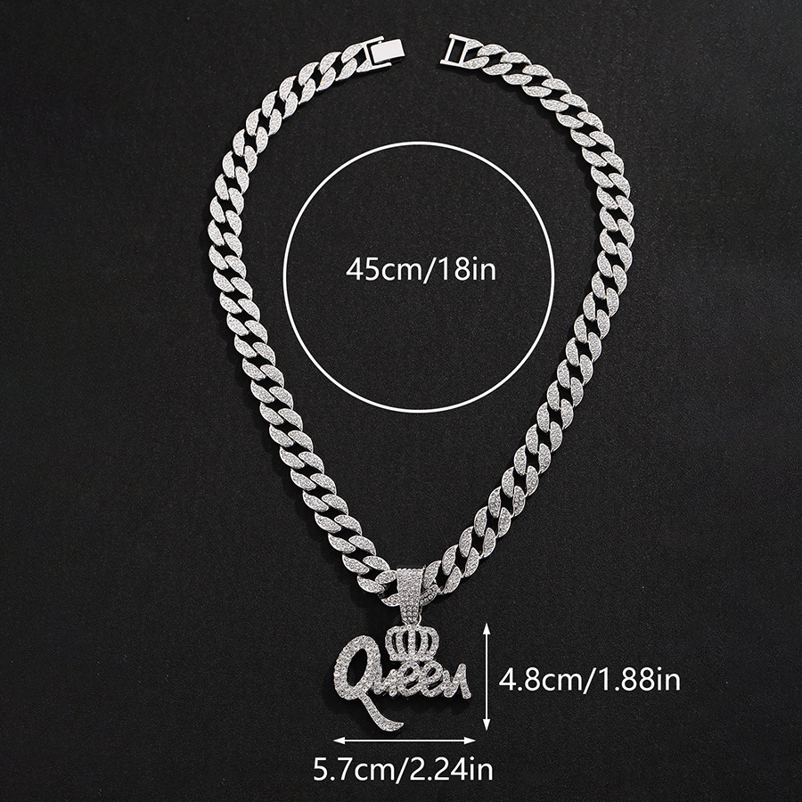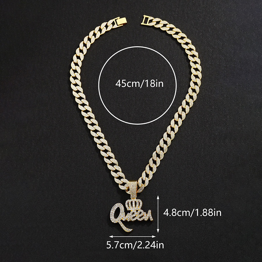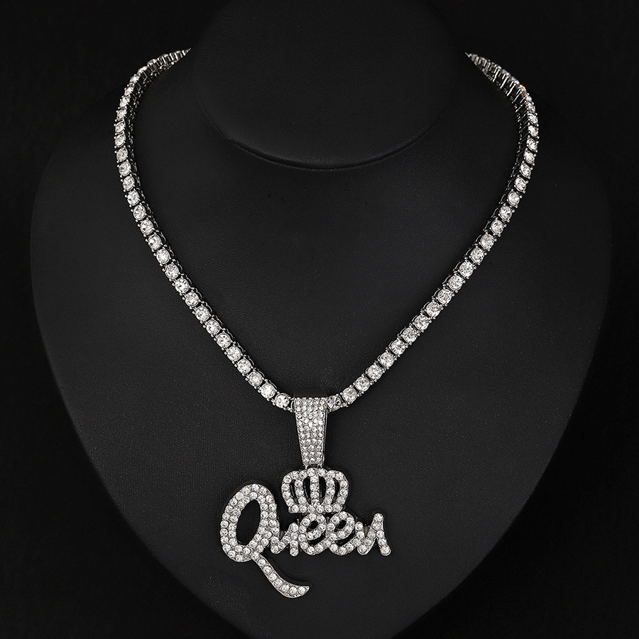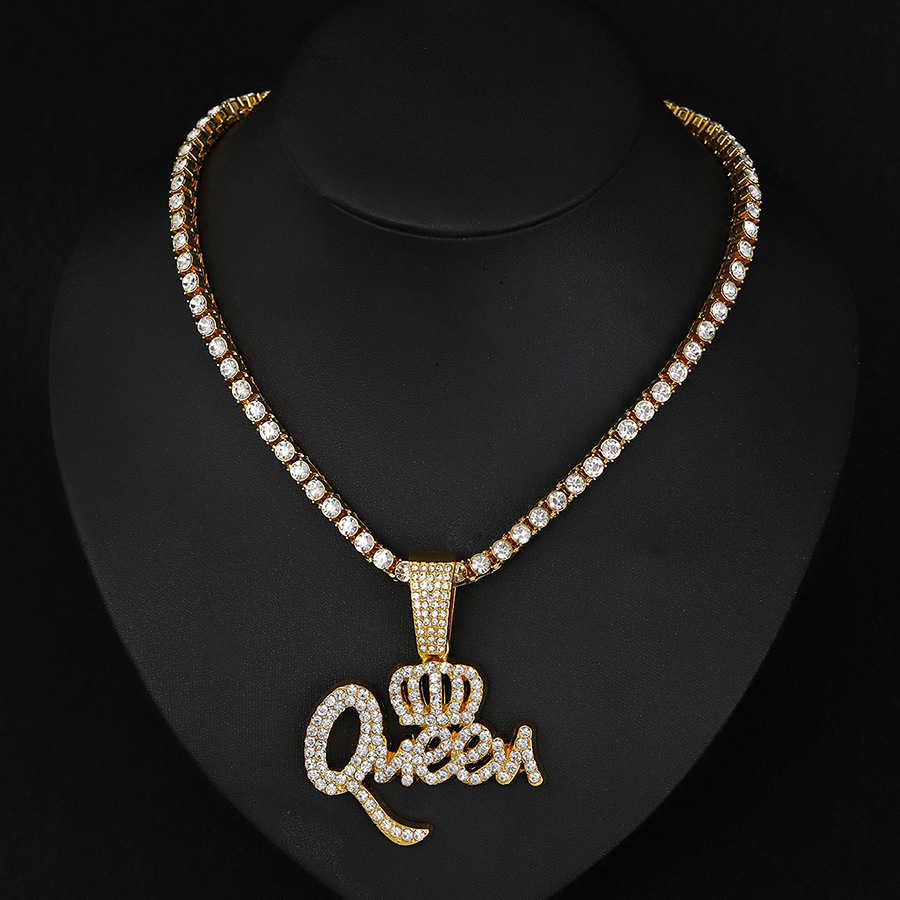 European and American Hot Hip Hop Zinc Alloy Crown QUEEN Letter Full Diamond Pendant Temperament Personality Necklace Jewelry Wholesale