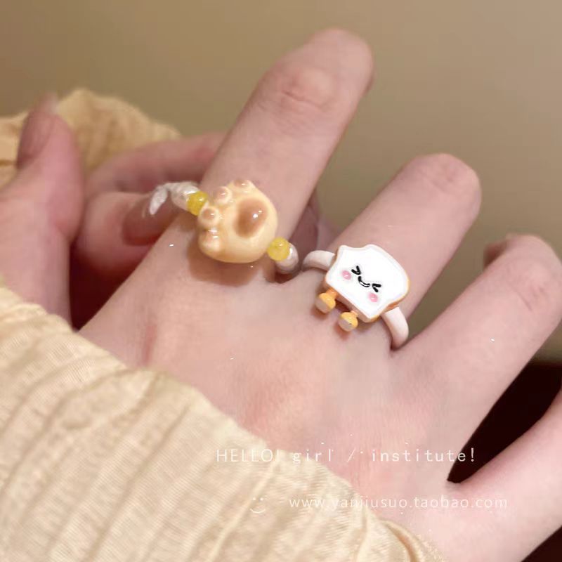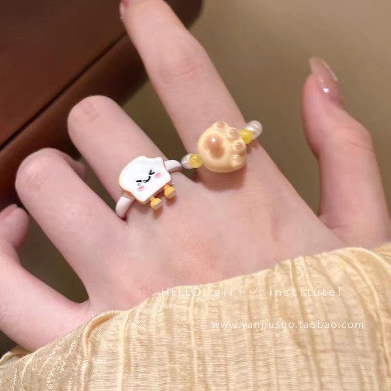 Cartoon Cute Bread Cat's Claw Pearl Ring Women's Unique Niche Design Open Finger Ring Sweet All-match Finger Ring