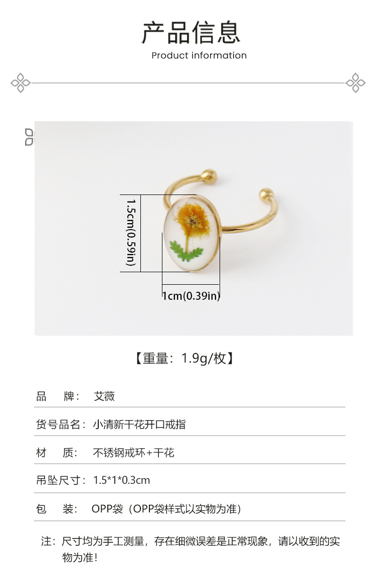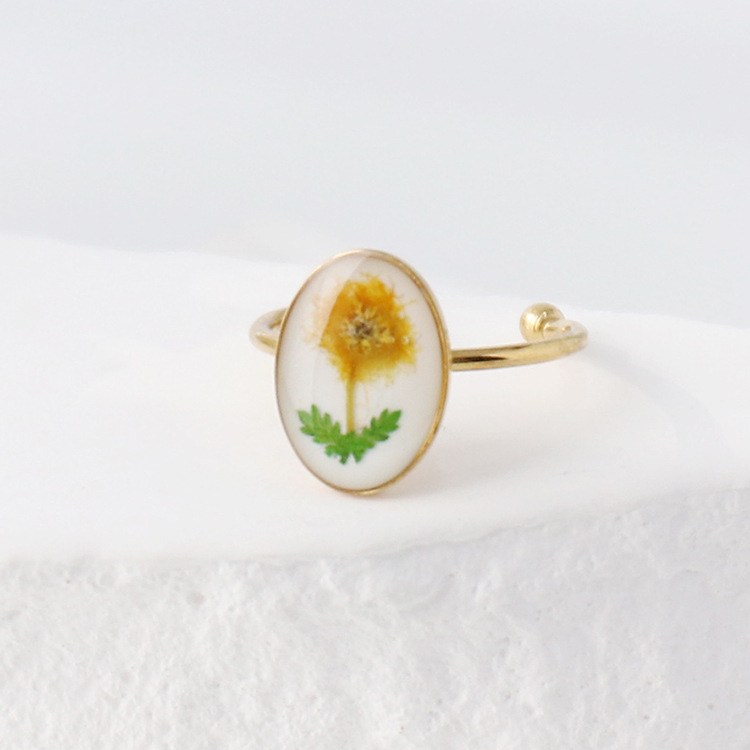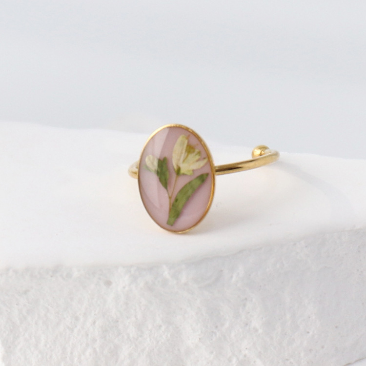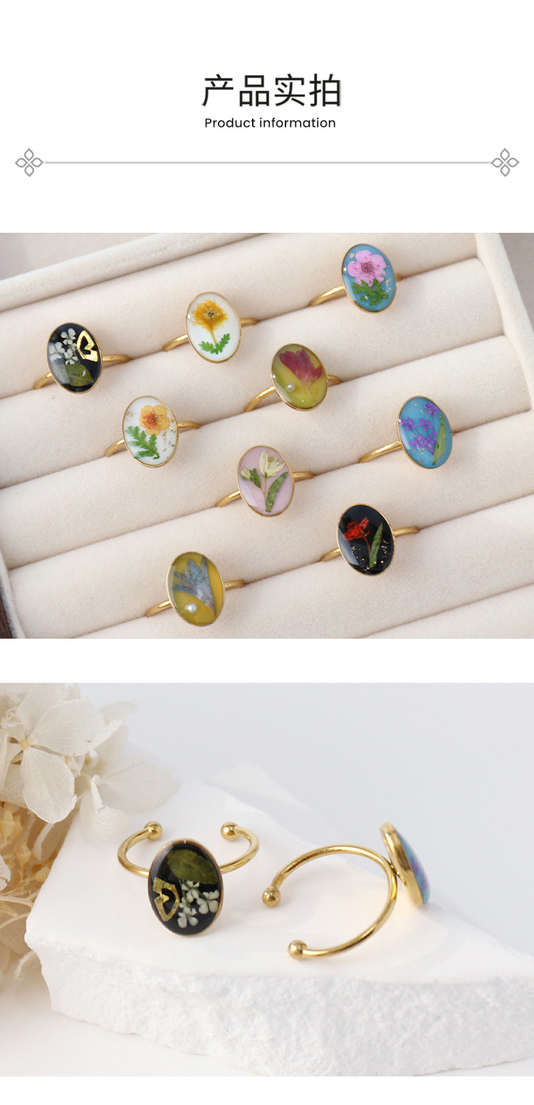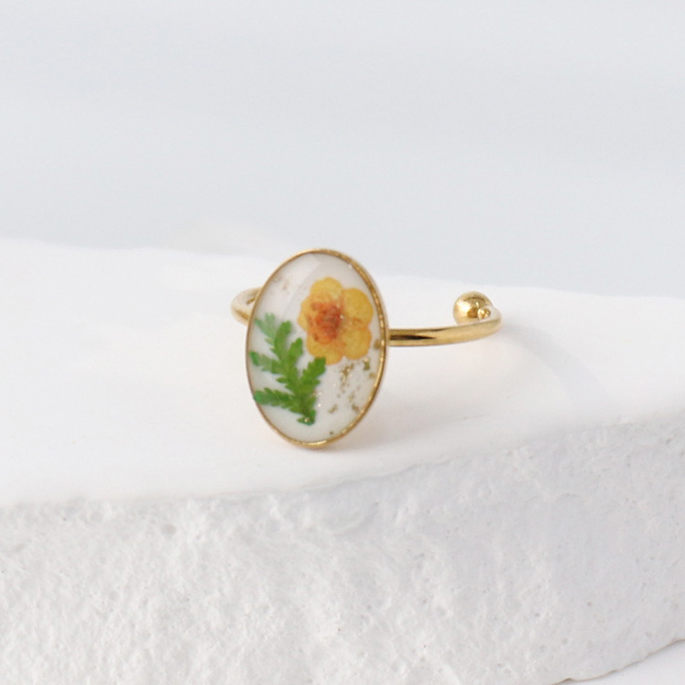 Aiwei's Popular Colorfulful Dried Flower Ring, Accessible Luxury Glue Hand Ornaments, Yiwu Small Commodities, Stainless Steel Gold-Plated Real Flower Ring