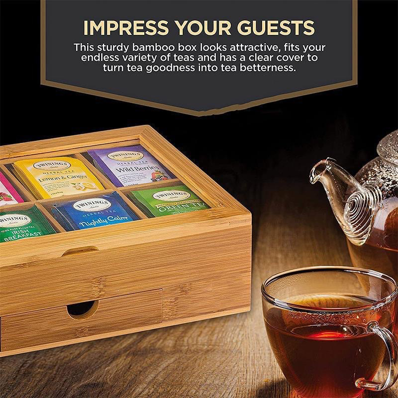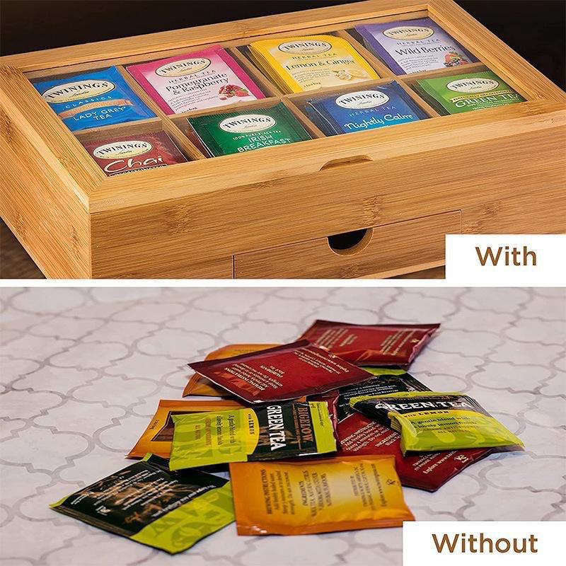 Bamboo Tea Bag Storage Box with Drawer Acrylic Cover Coffee Station Cabinet Countertop Sugar Tea Bag Pod Storage Box